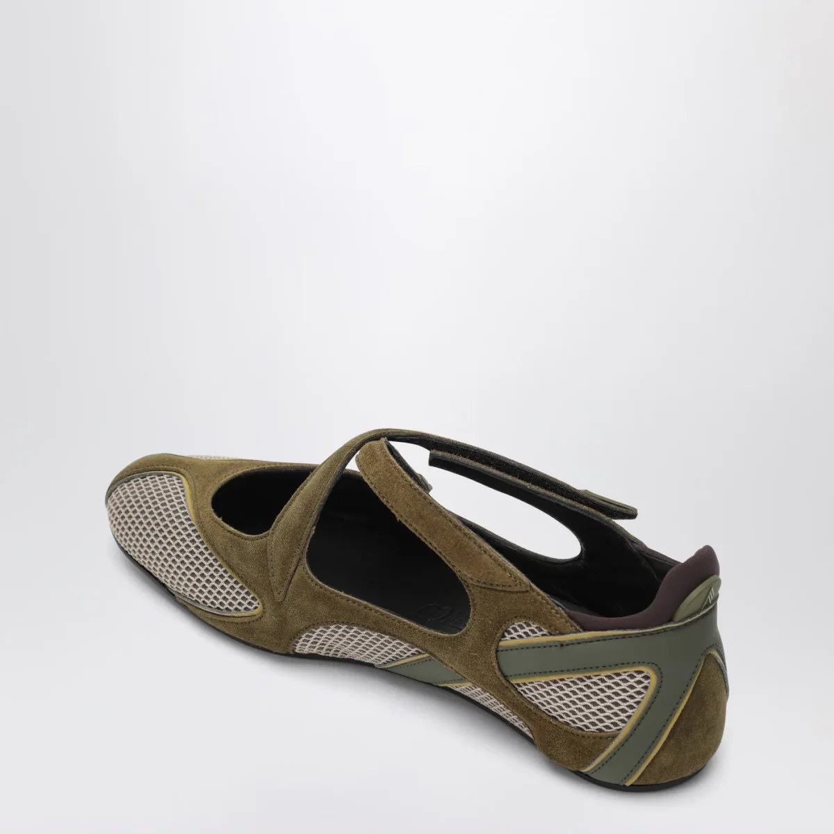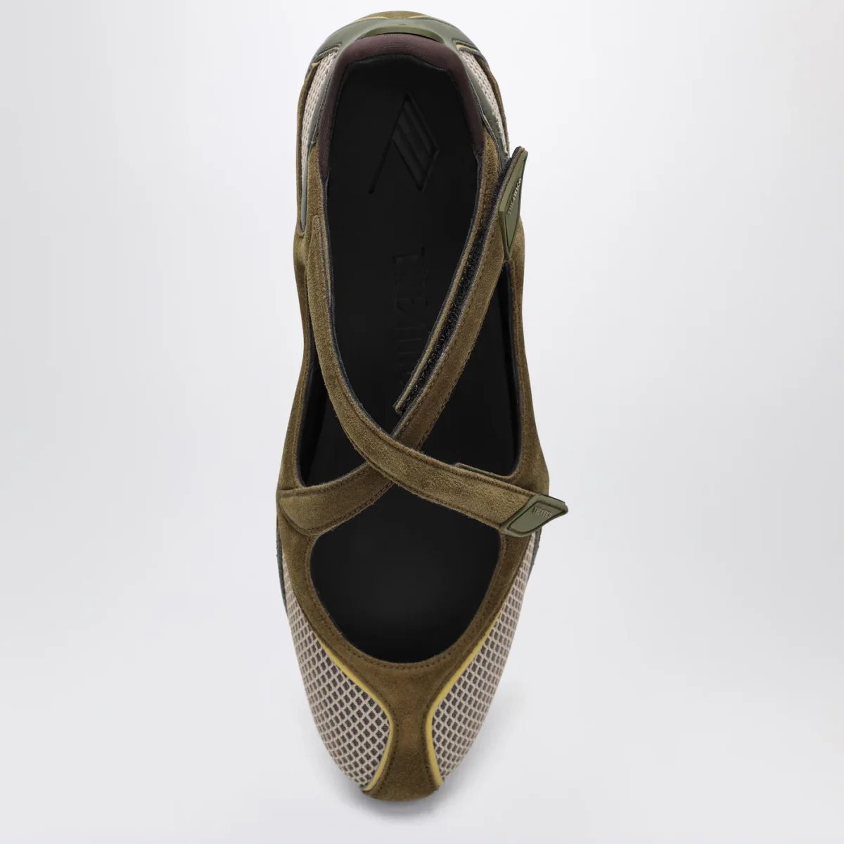 Ballerina di The Attico in tessuto sintetico e suede verde militare, caratterizzata da punta a mandorla, chiusura incrociata con velcro, dettagli in gomma con logo lettering, dettagli cut-out e suola in gomma.