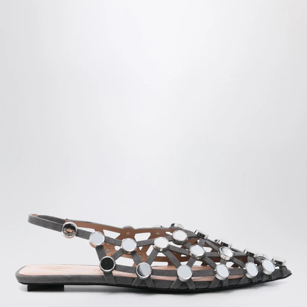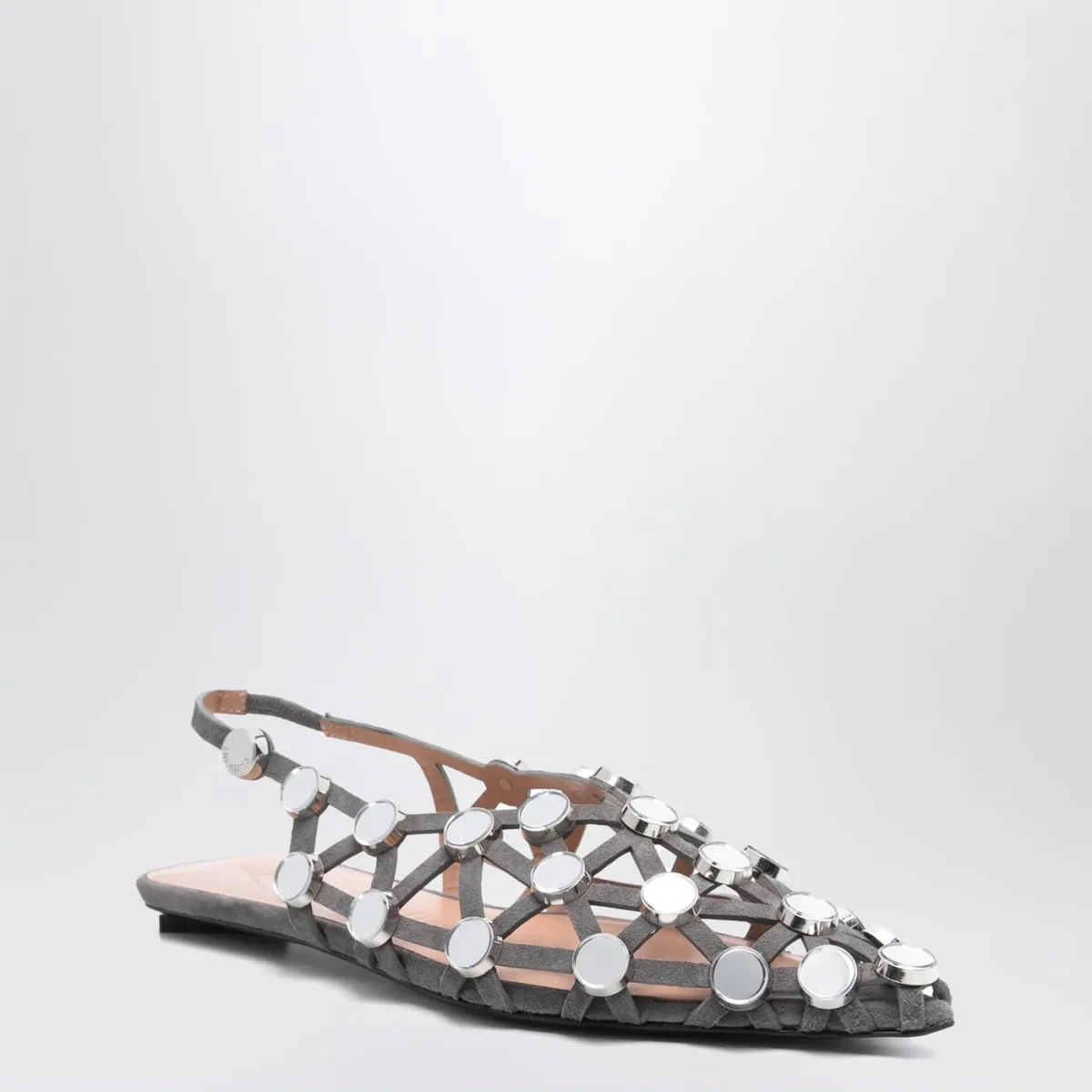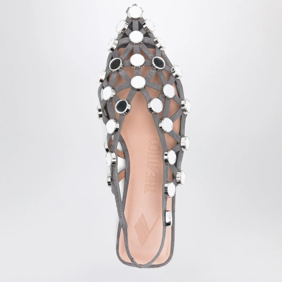 Ballerina di The Attico in pelle color Mud, caratterizzata da tomaia a listini e piccoli specchietti, design a punta e suola in cuoio.