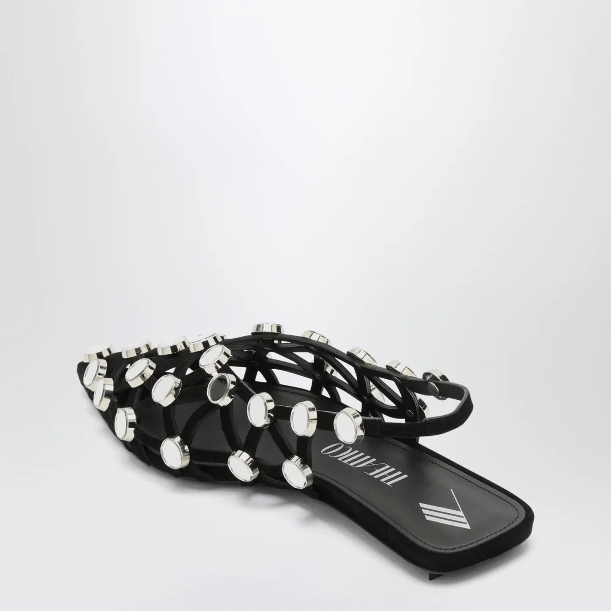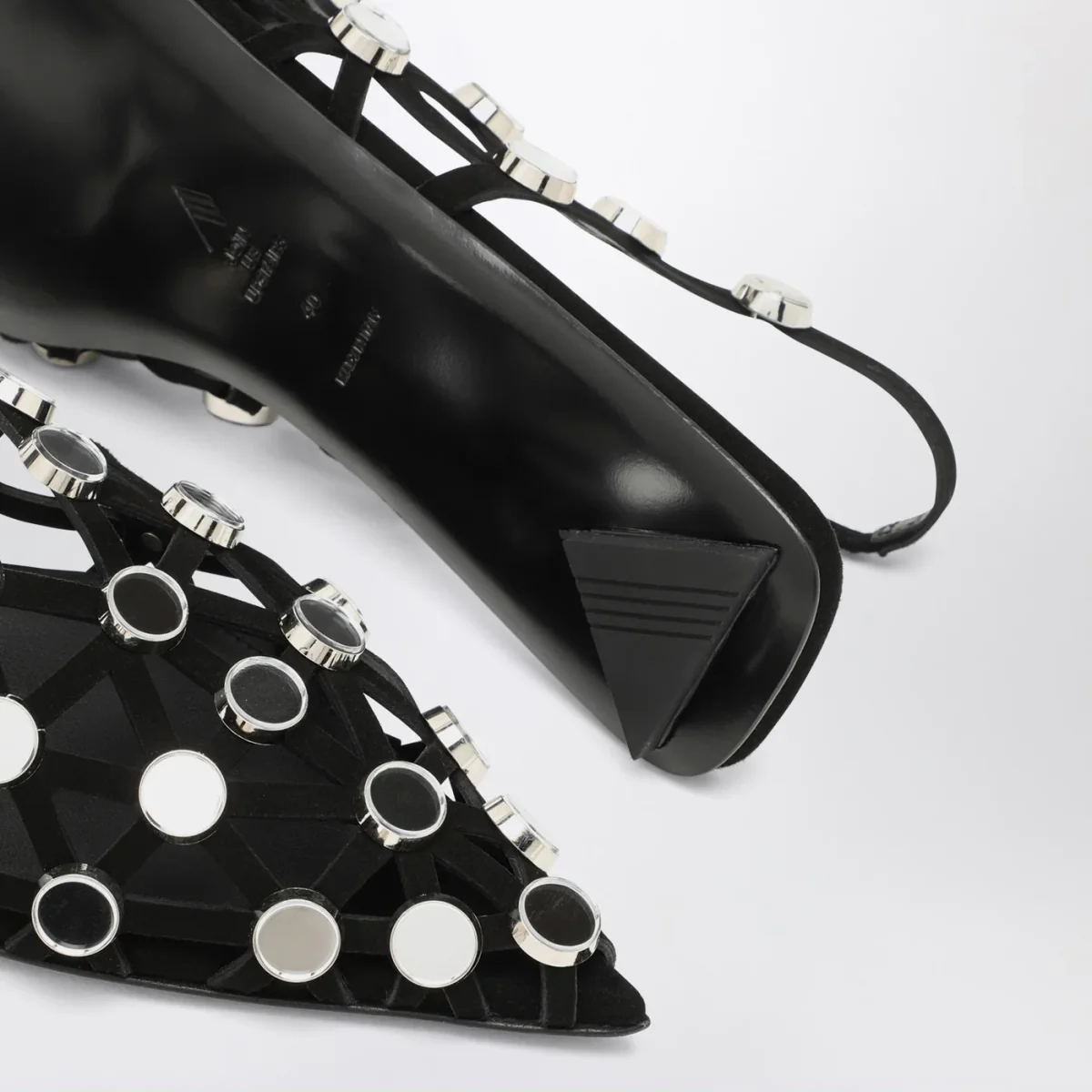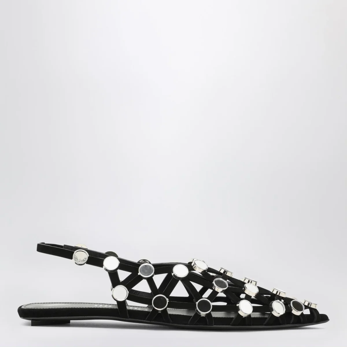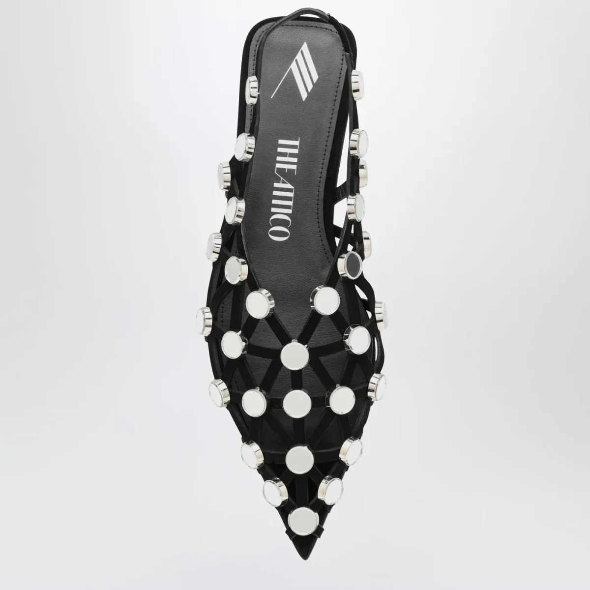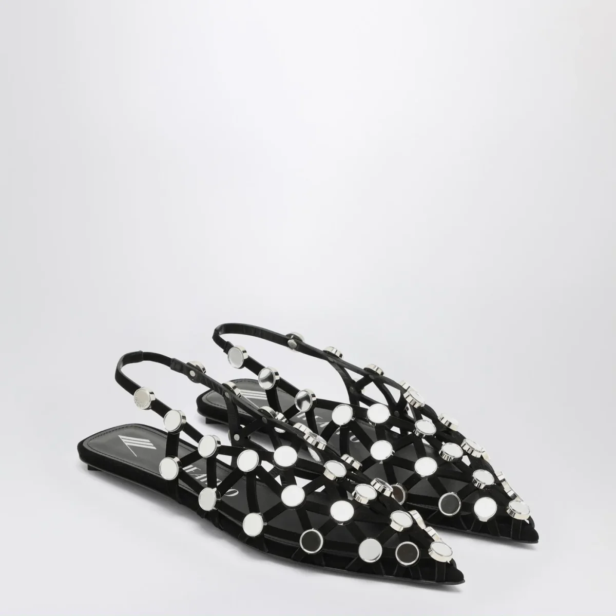 Ballerina di The Attico in pelle nera, caratterizzata da tomaia a listini e con piccoli specchietti, design a punta e suola in cuoio.