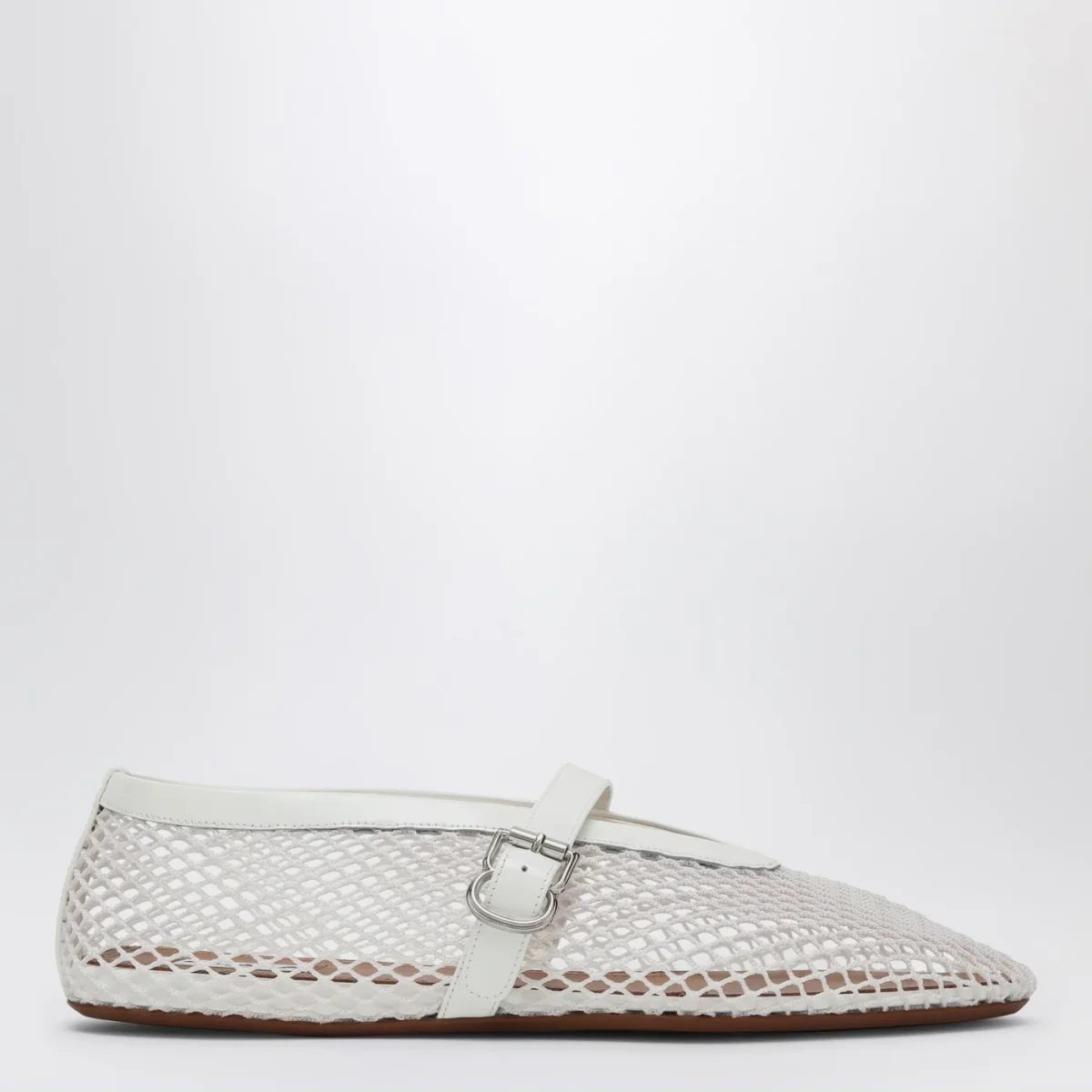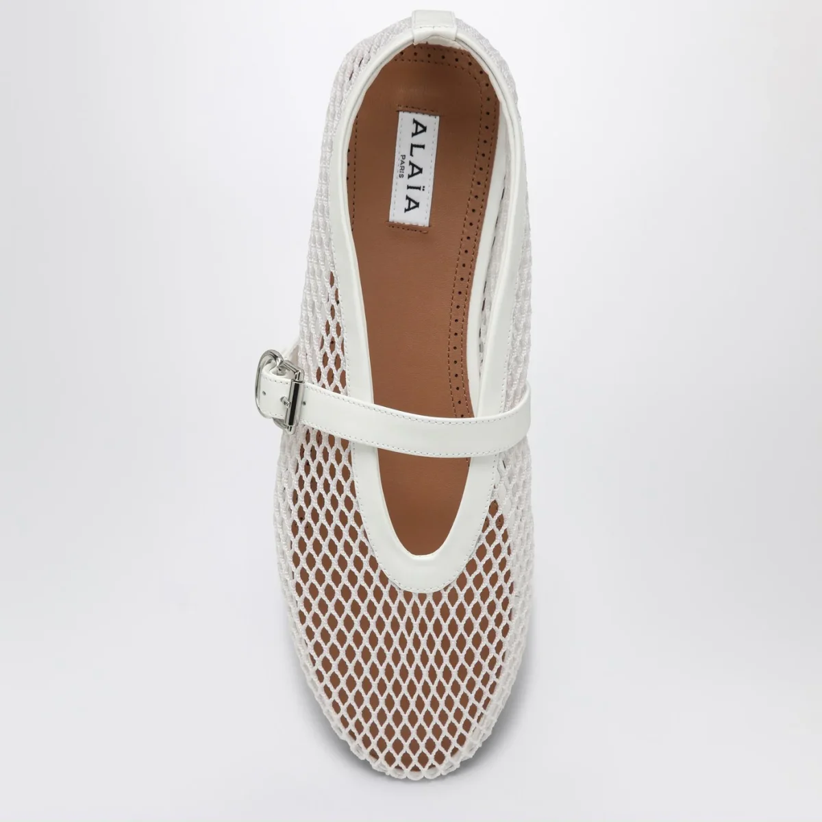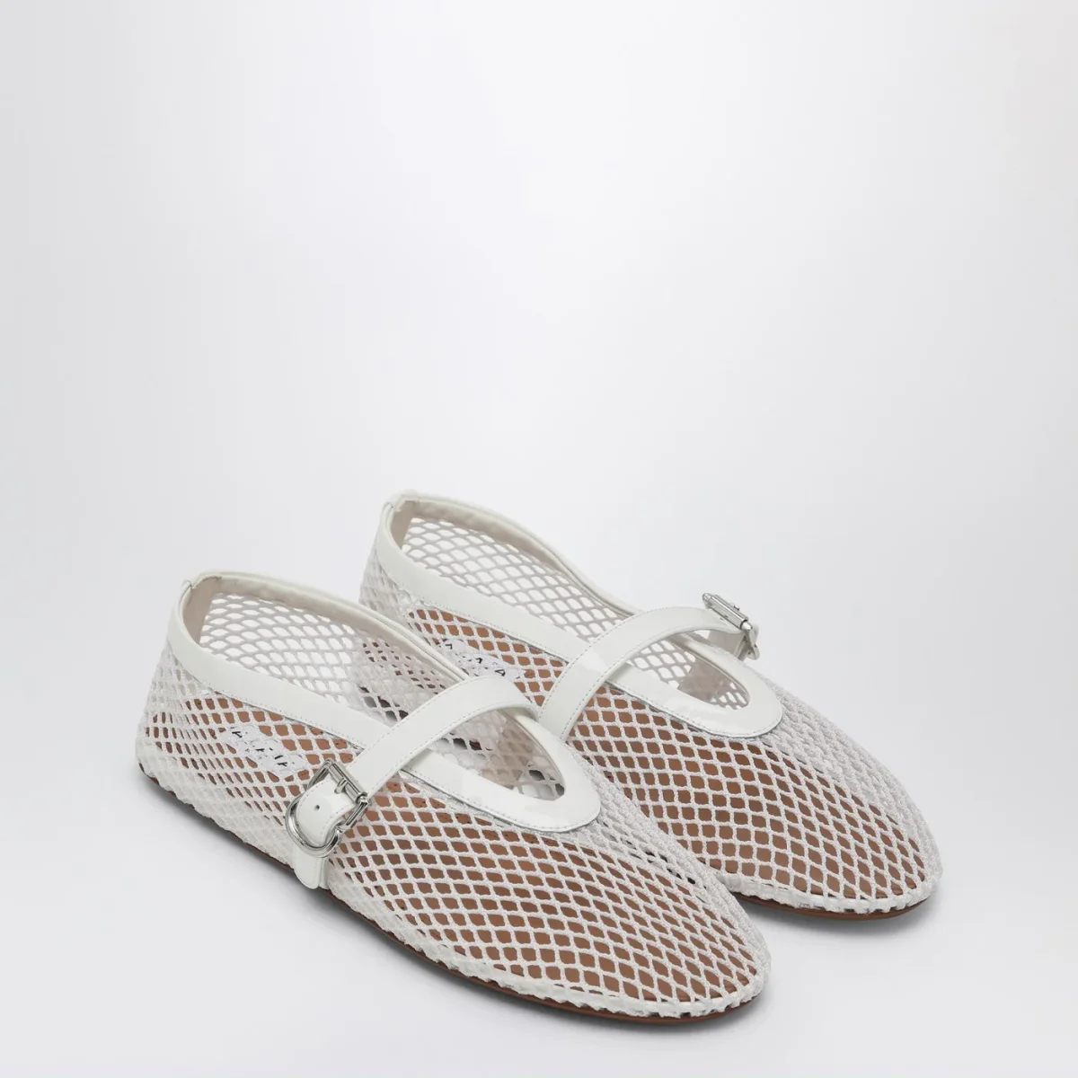 Ballerina di Alaïa in rete e pelle di vitello bianca• punta tonda• chiusura con cinturino regolabile sulla tomaia in vernice• suola in gomma
