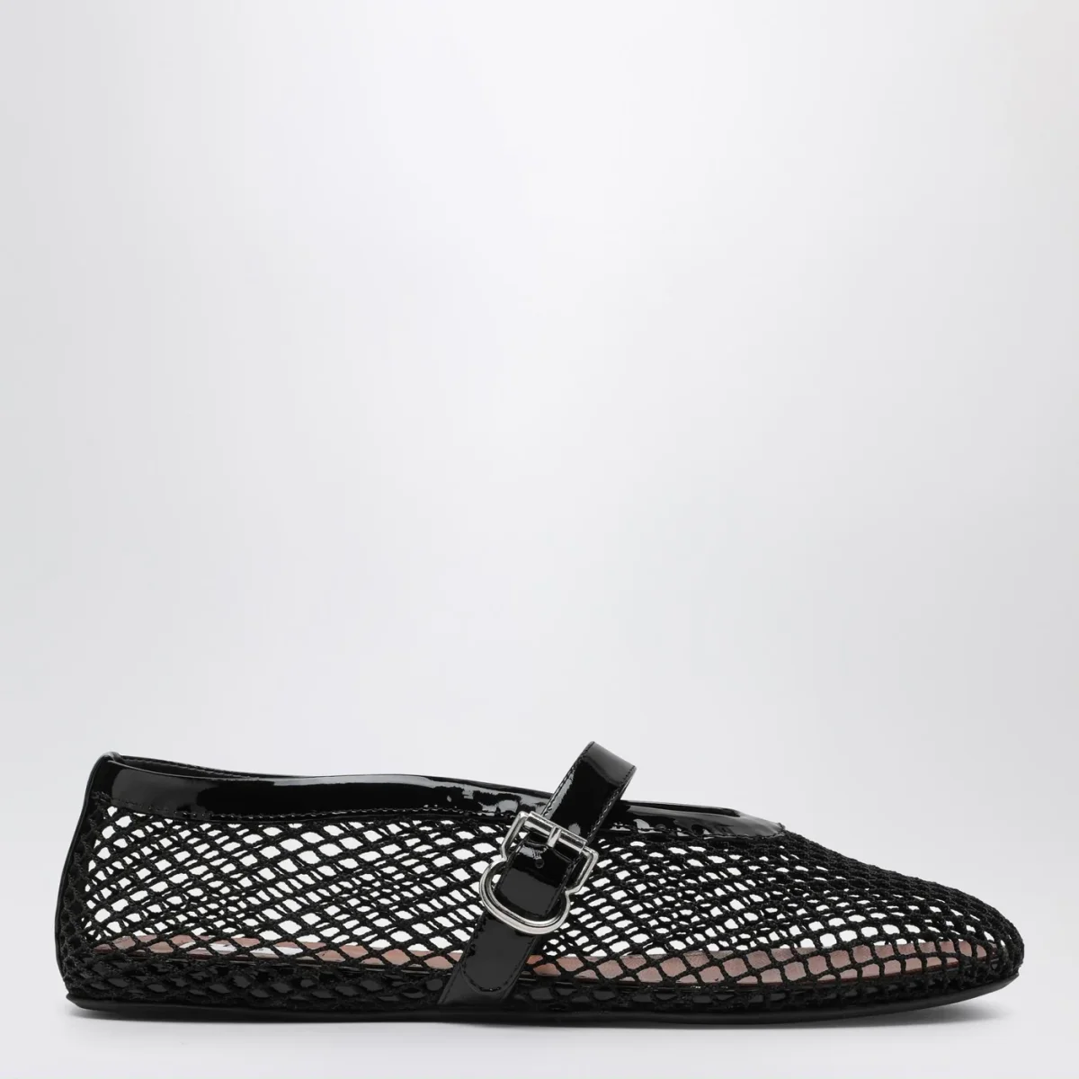 Ballerina di Alaïa in rete e pelle di vitello nera• punta tonda• chiusura con cinturino regolabile sulla tomaia in vernice• suola in gomma