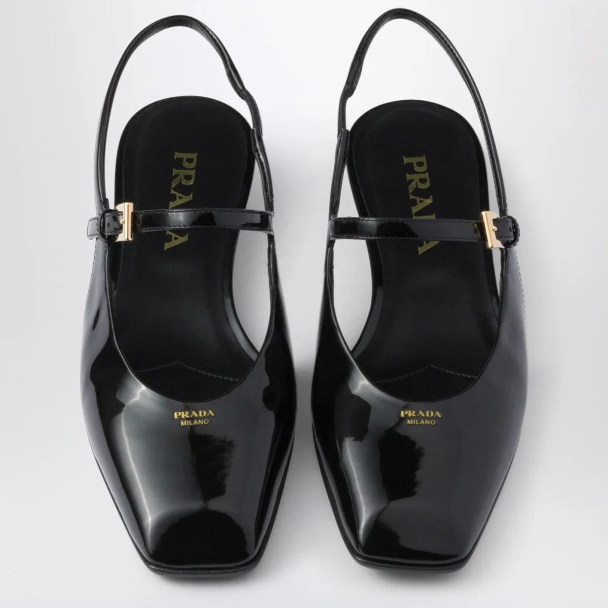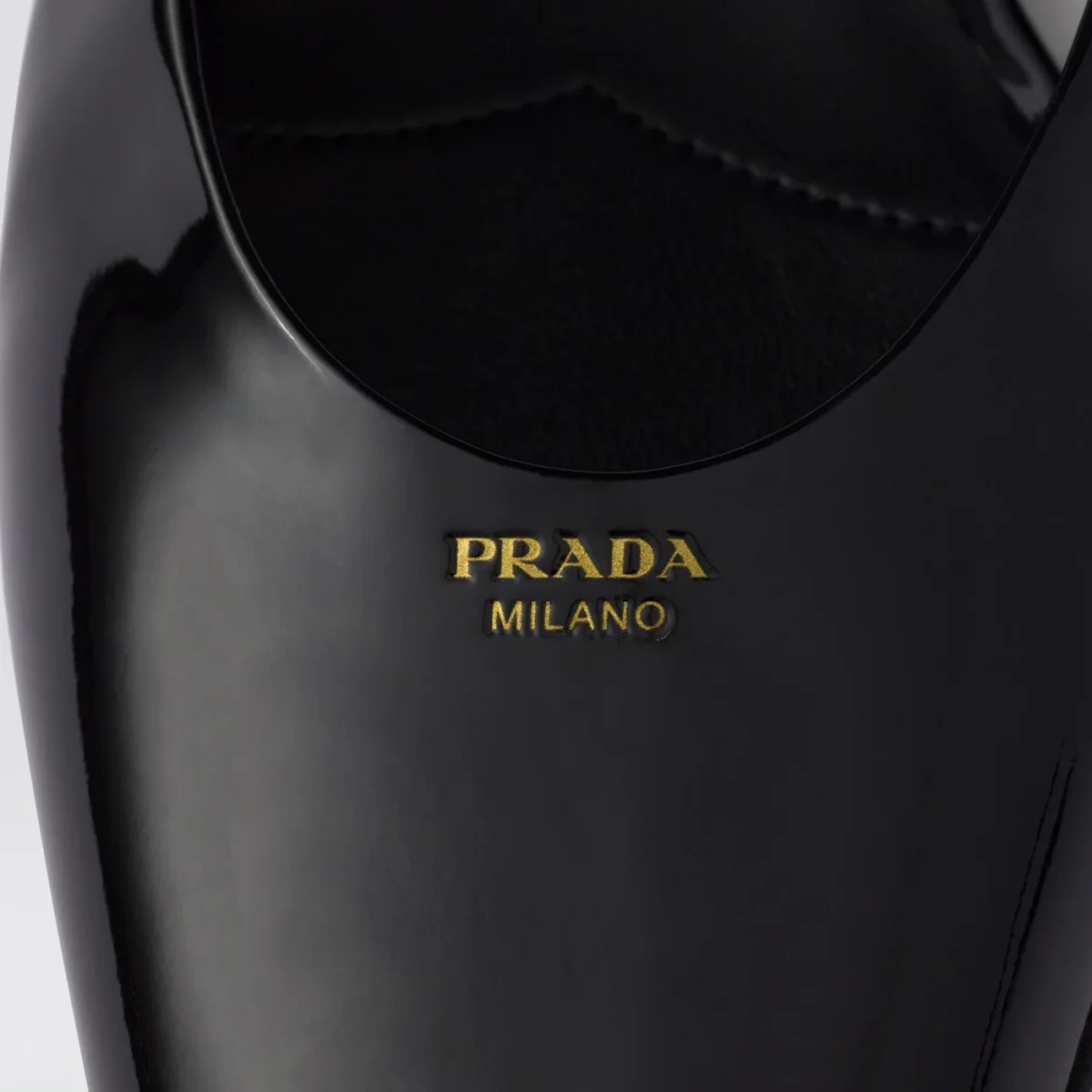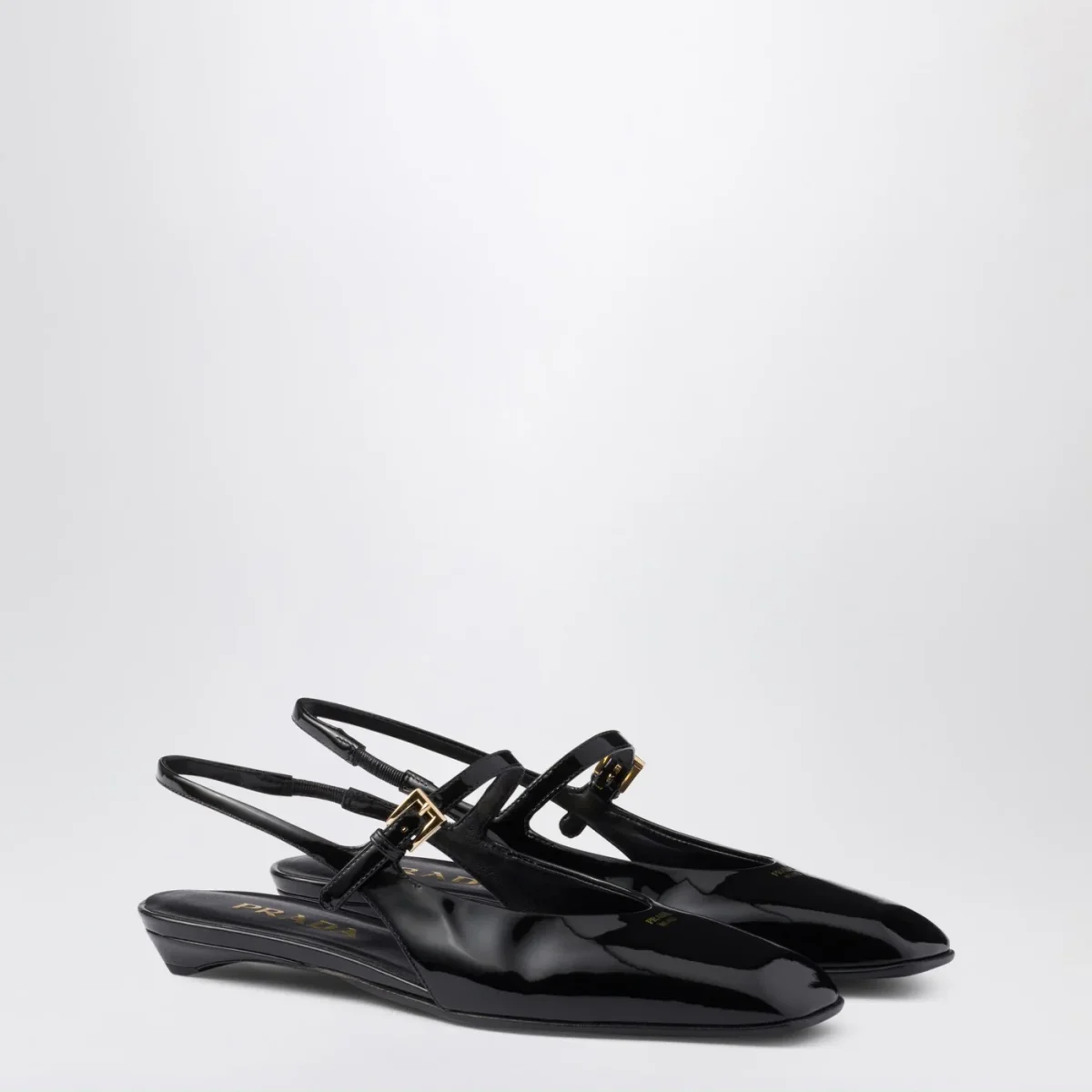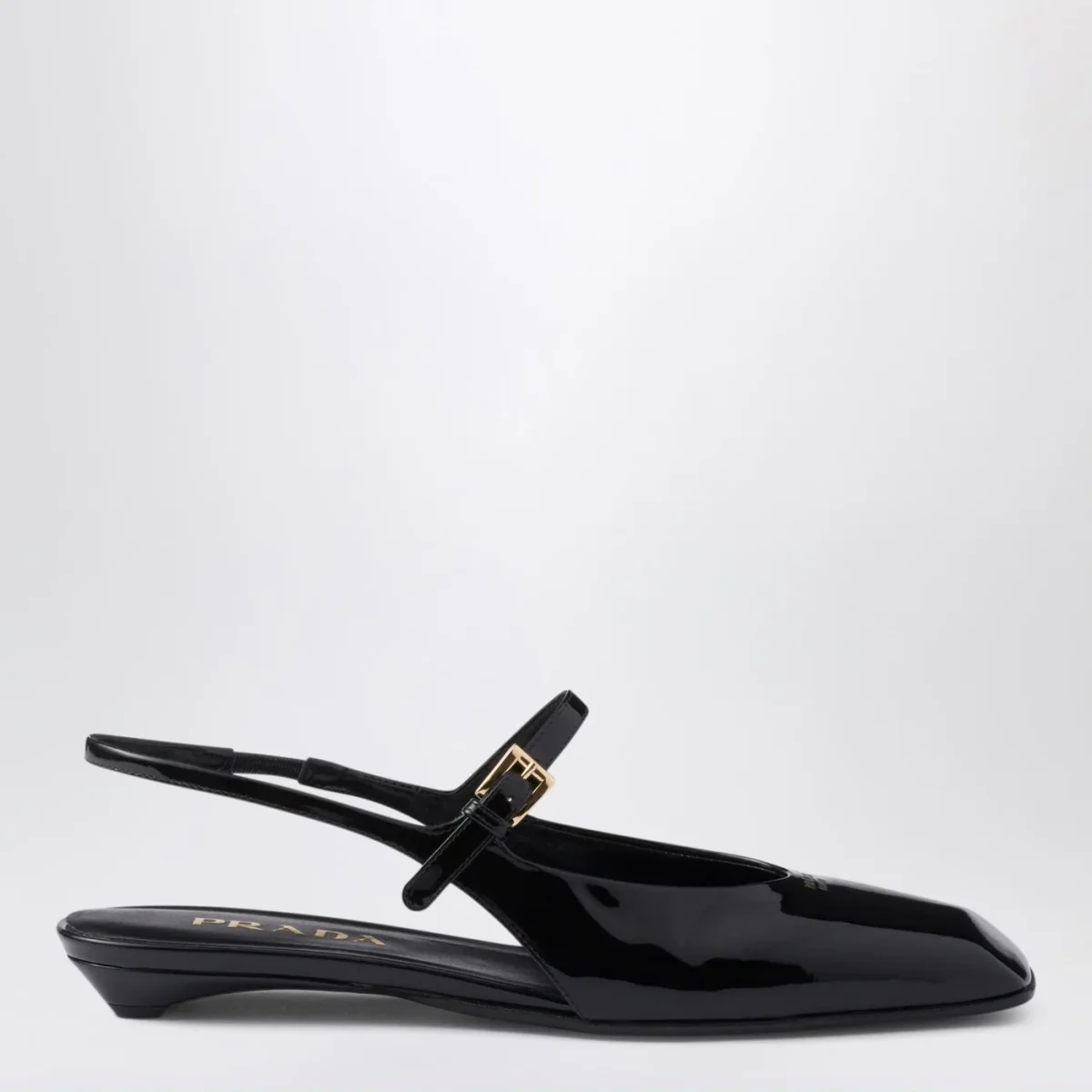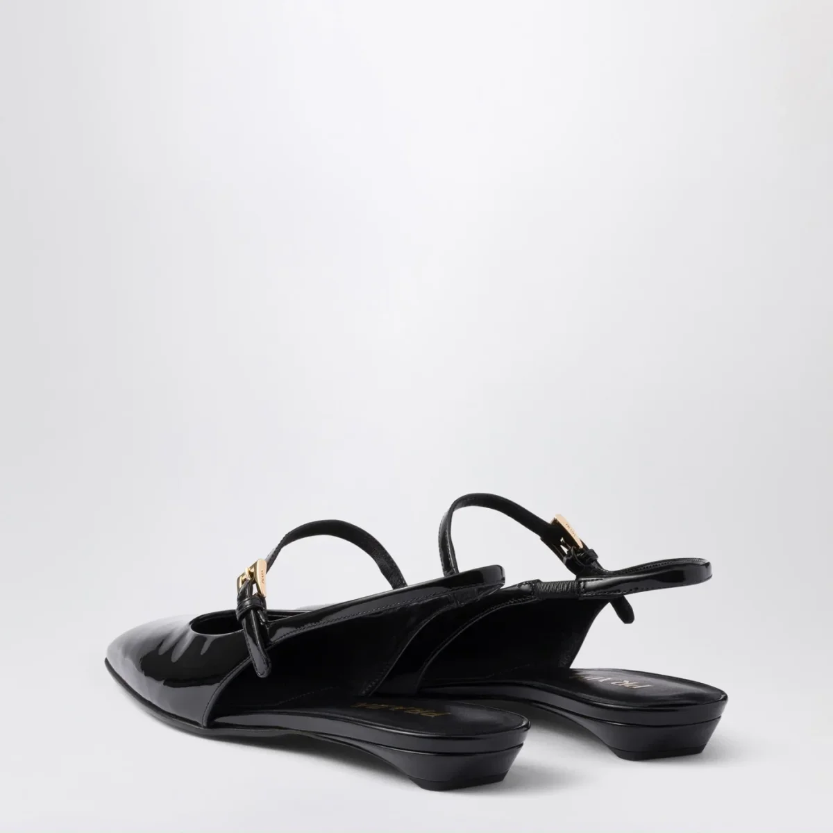 Ballerina slingback di Prada in pelle verniciata nera, caratterizzata da cinturino sulla tomaia con fibbia, logo sul davanti e suola in cuoio e gomma.