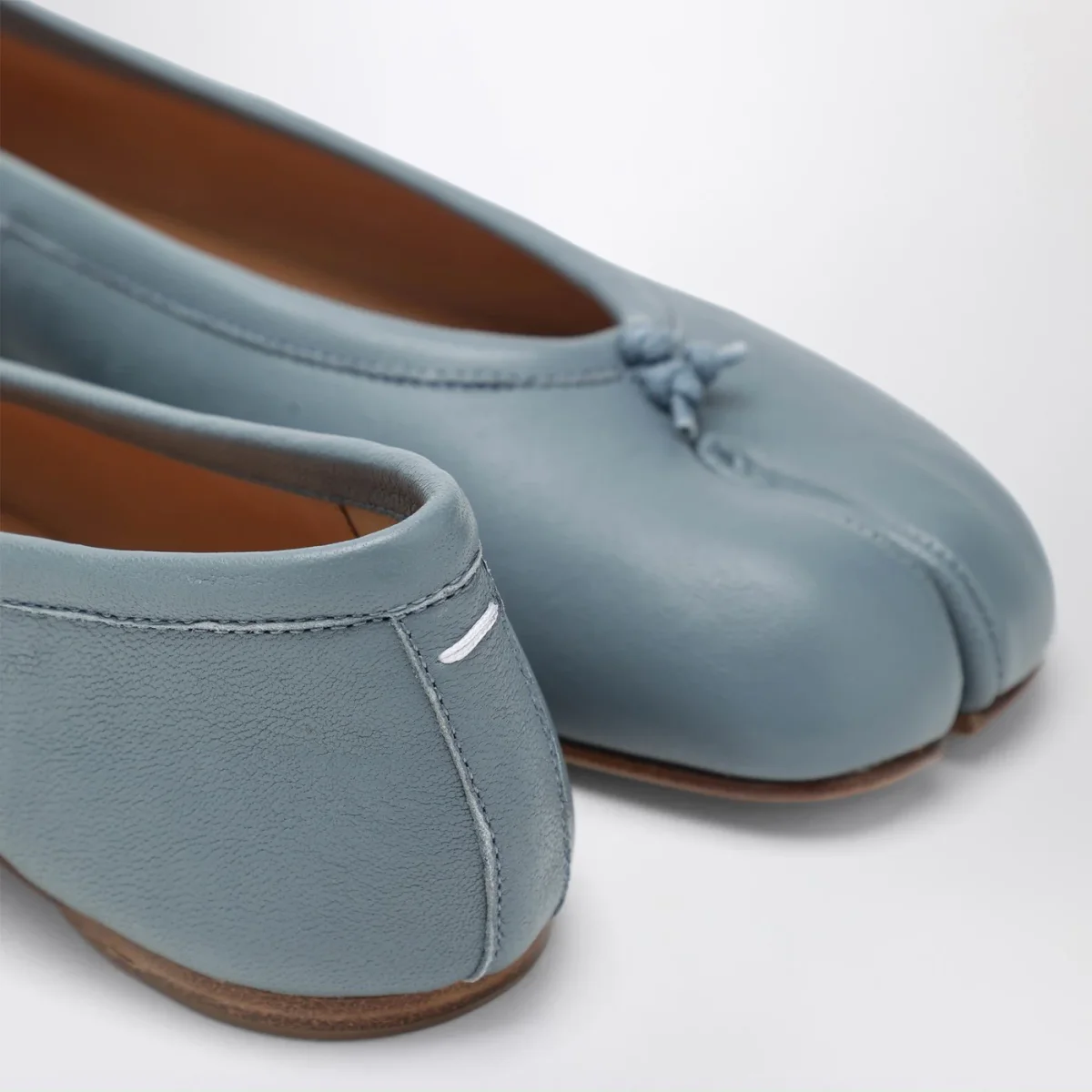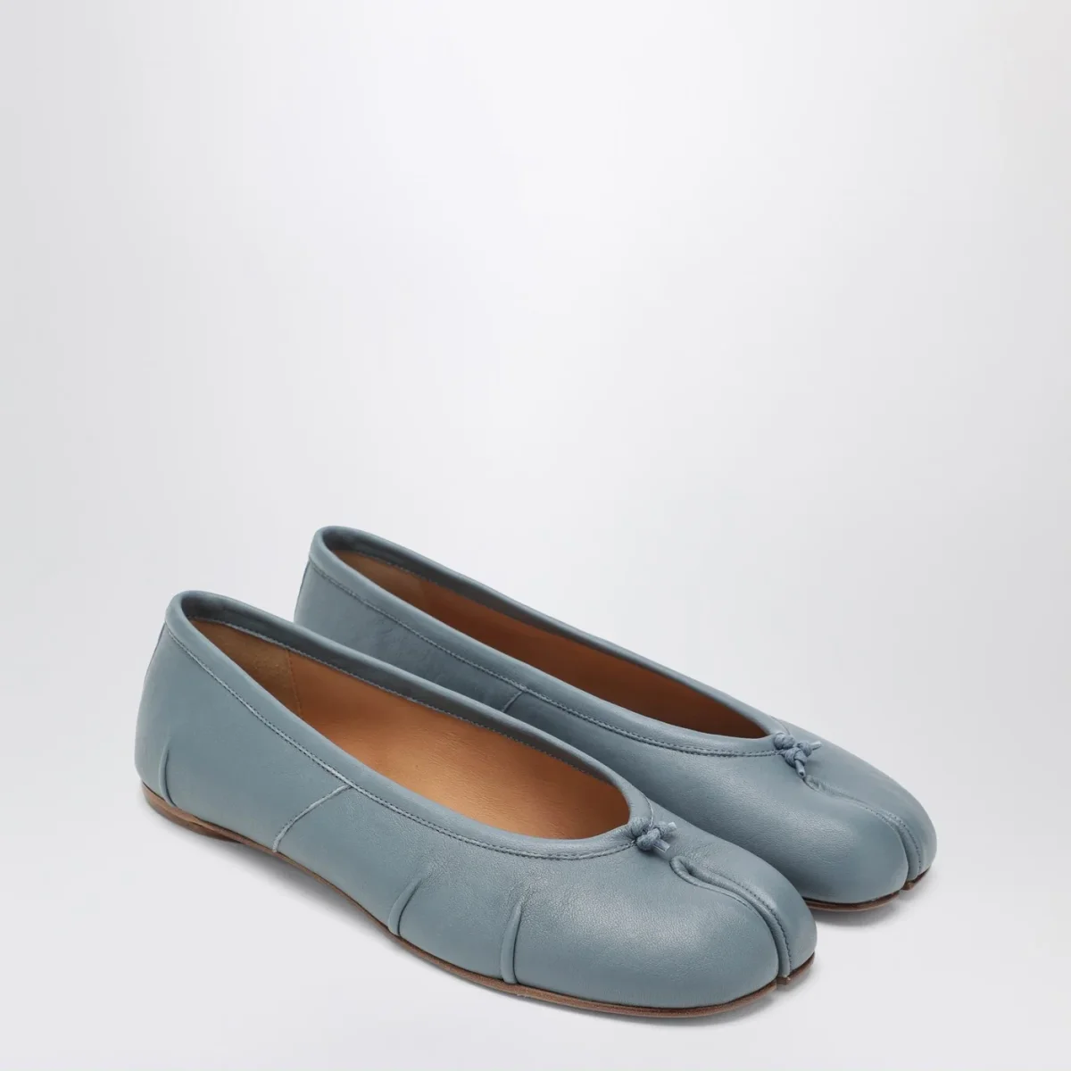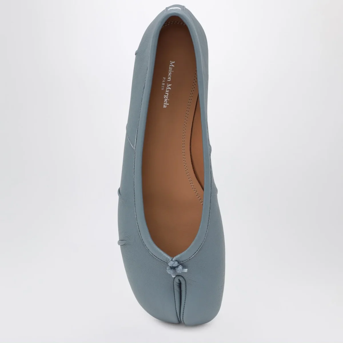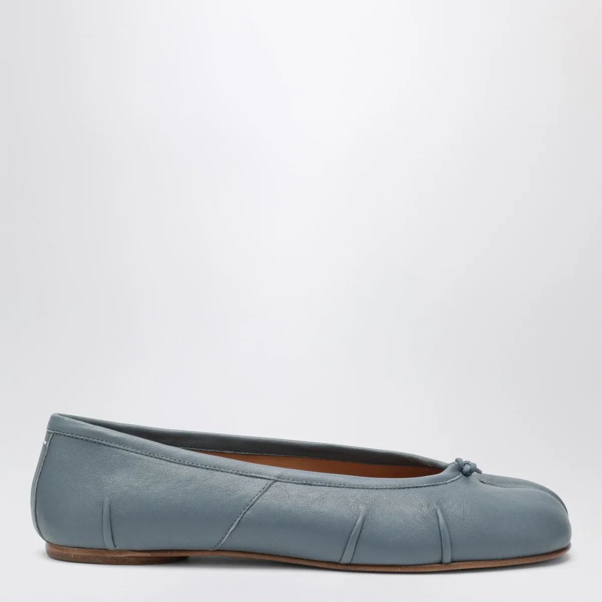 Ballerina di Maison Margiela in pelle grigia blu• punta tonda con taglio tabi• nodo sul davanti• impuntura bianca sul retro• pieghe realizzate a mano• suola in cuoio