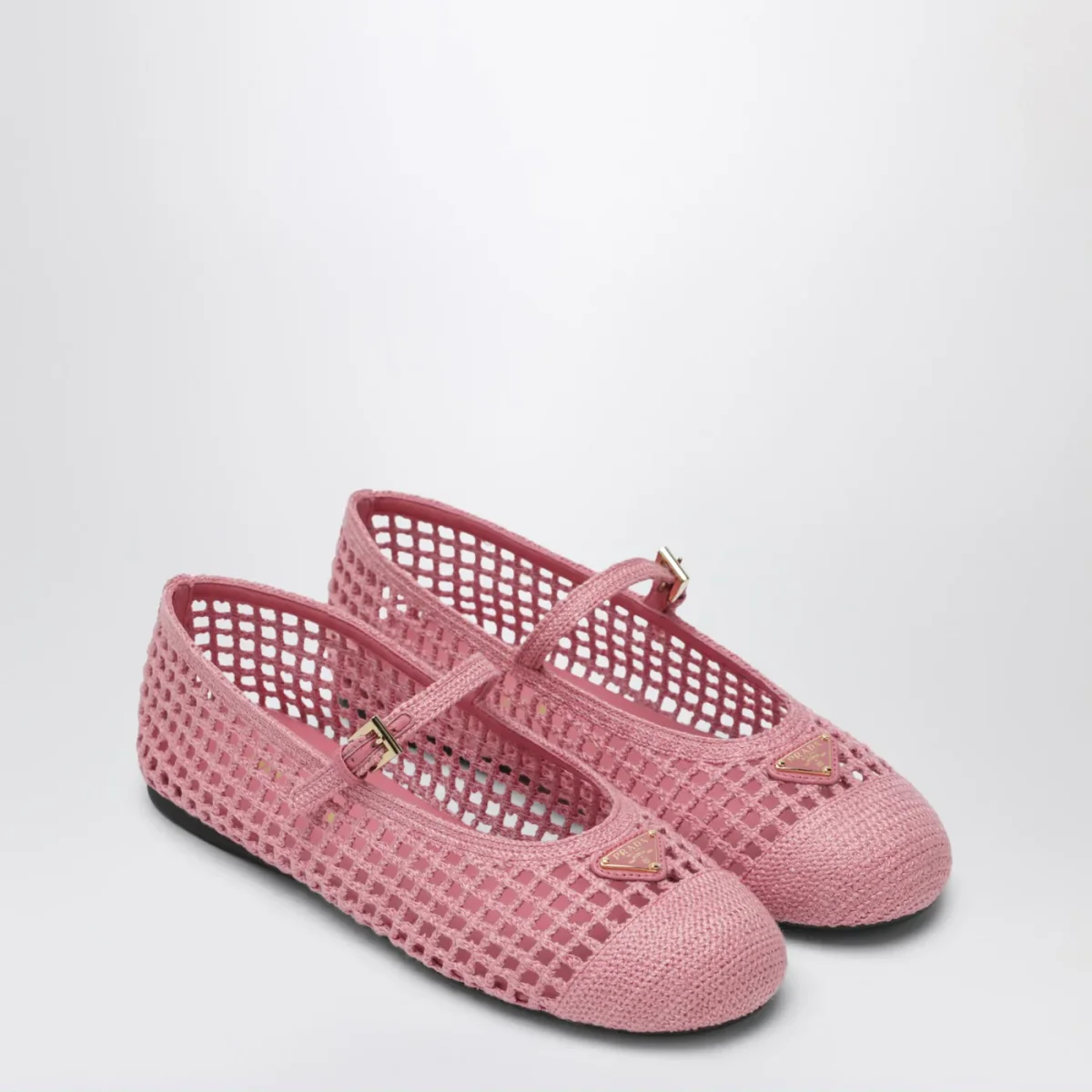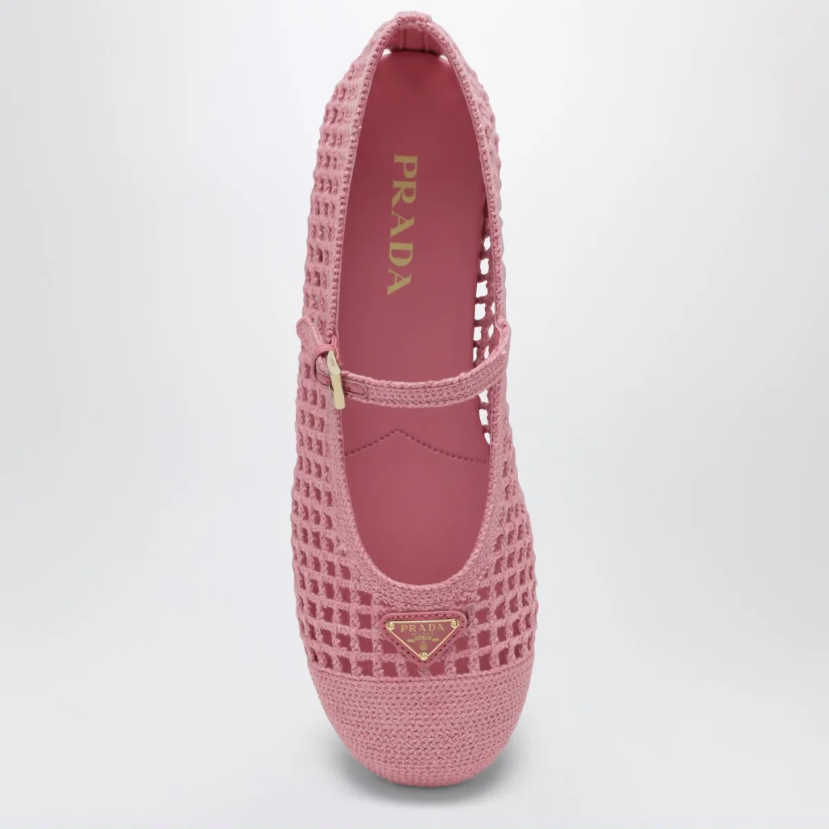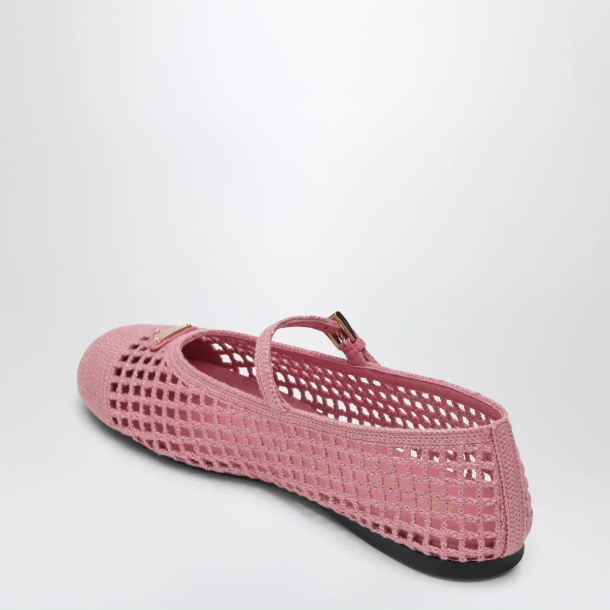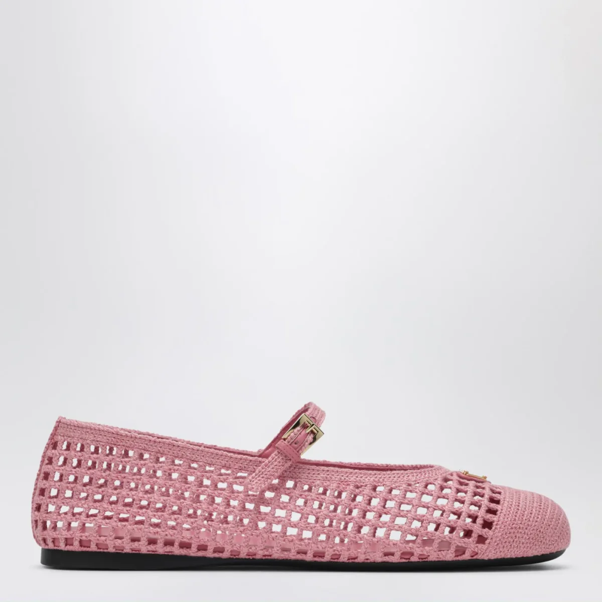 Ballerine di Prada in maglia crochet color begonia, caratterizzate da punta tonda, triangolo logo in metallo smaltato sulla tomaia, cinturino regolabile e suola in gomma.