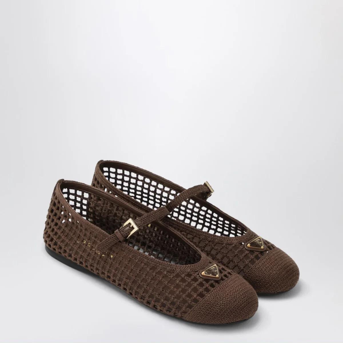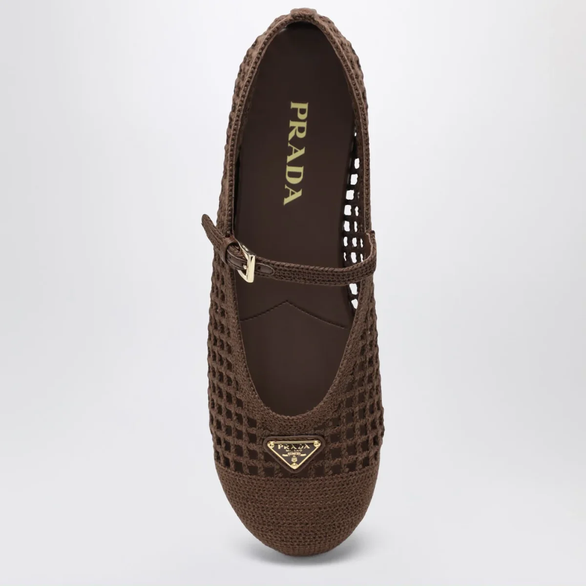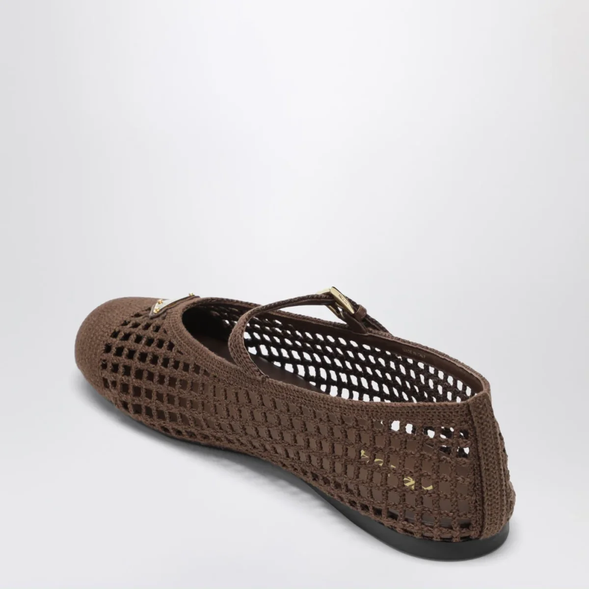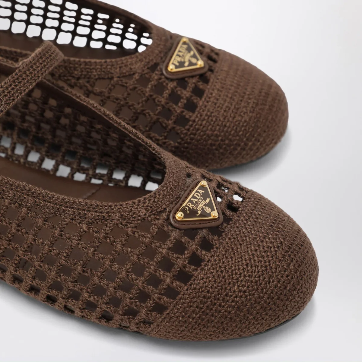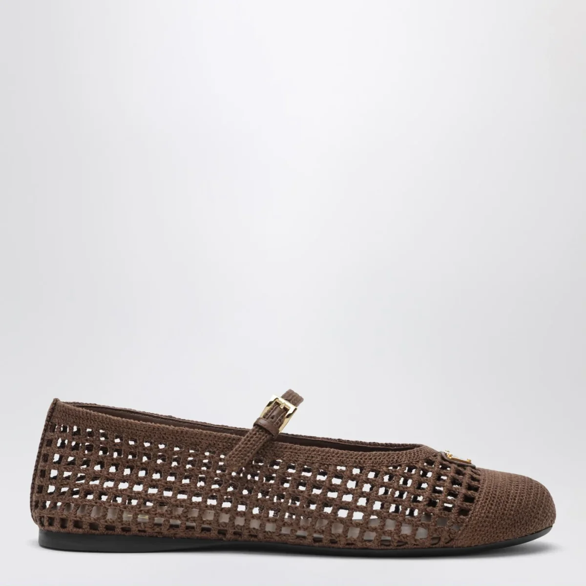 Ballerine di Prada in maglia crochet marrone cacao• punta tonda• triangolo logo in metallo smaltato sulla tomaia• cinturino regolabile• suola in gomma