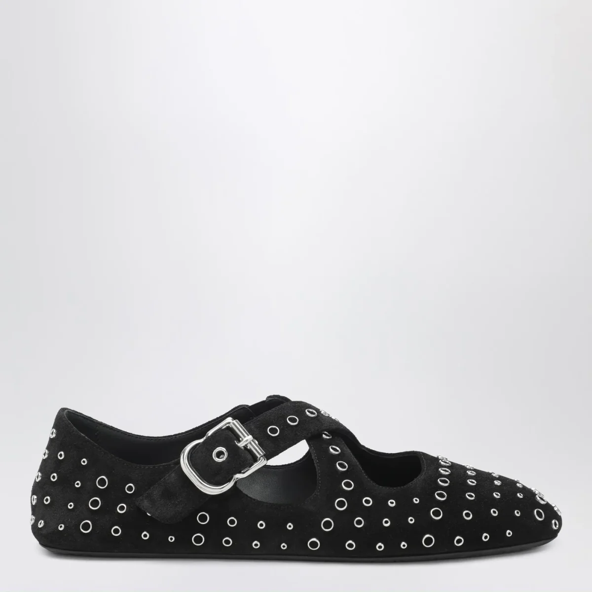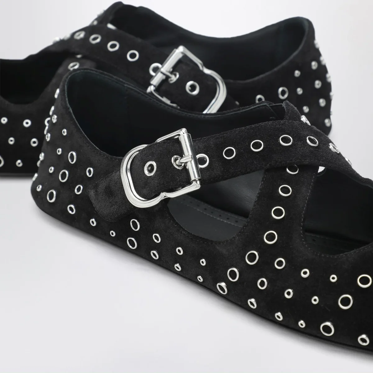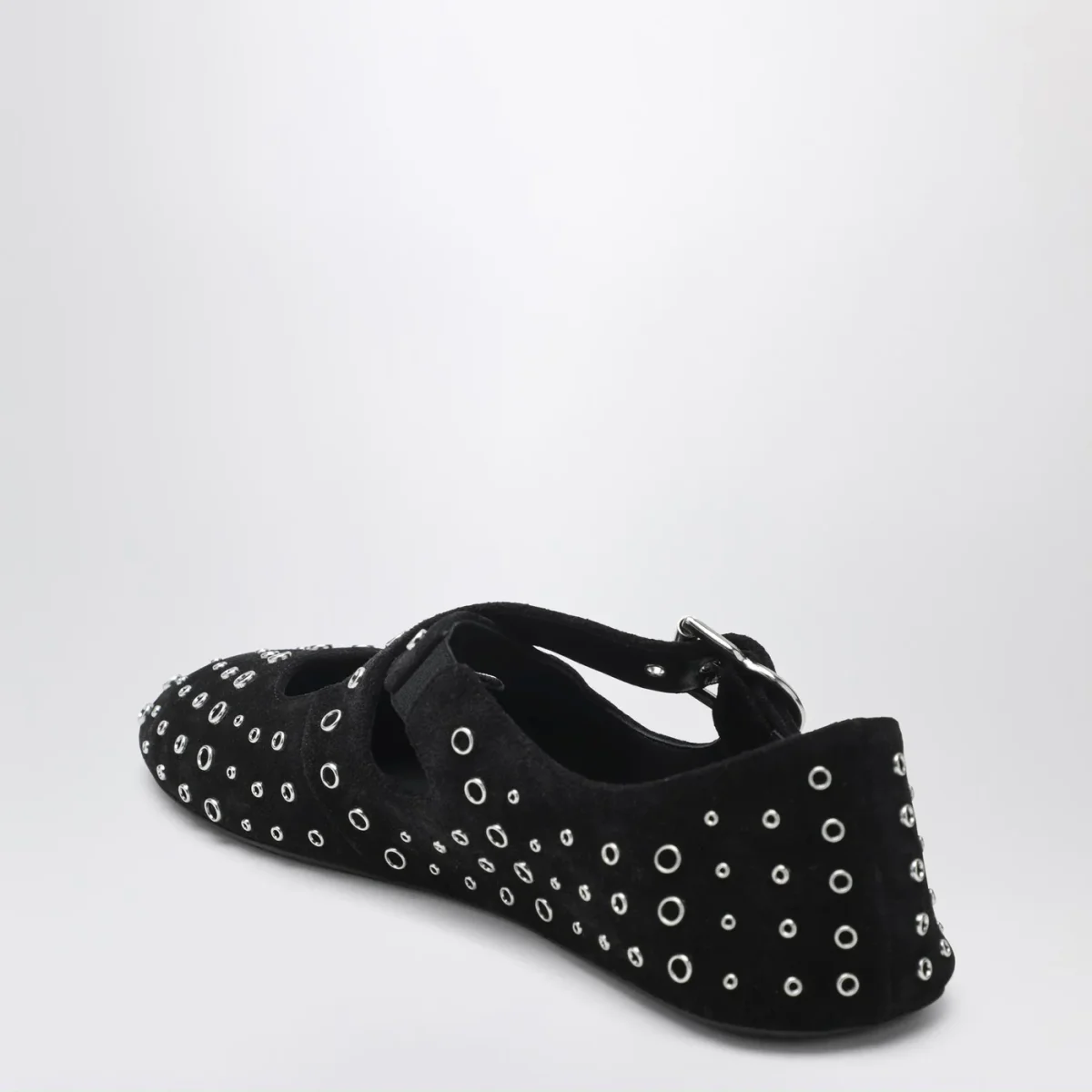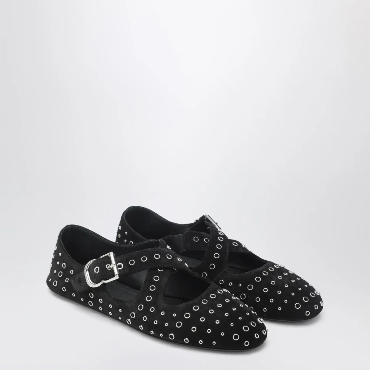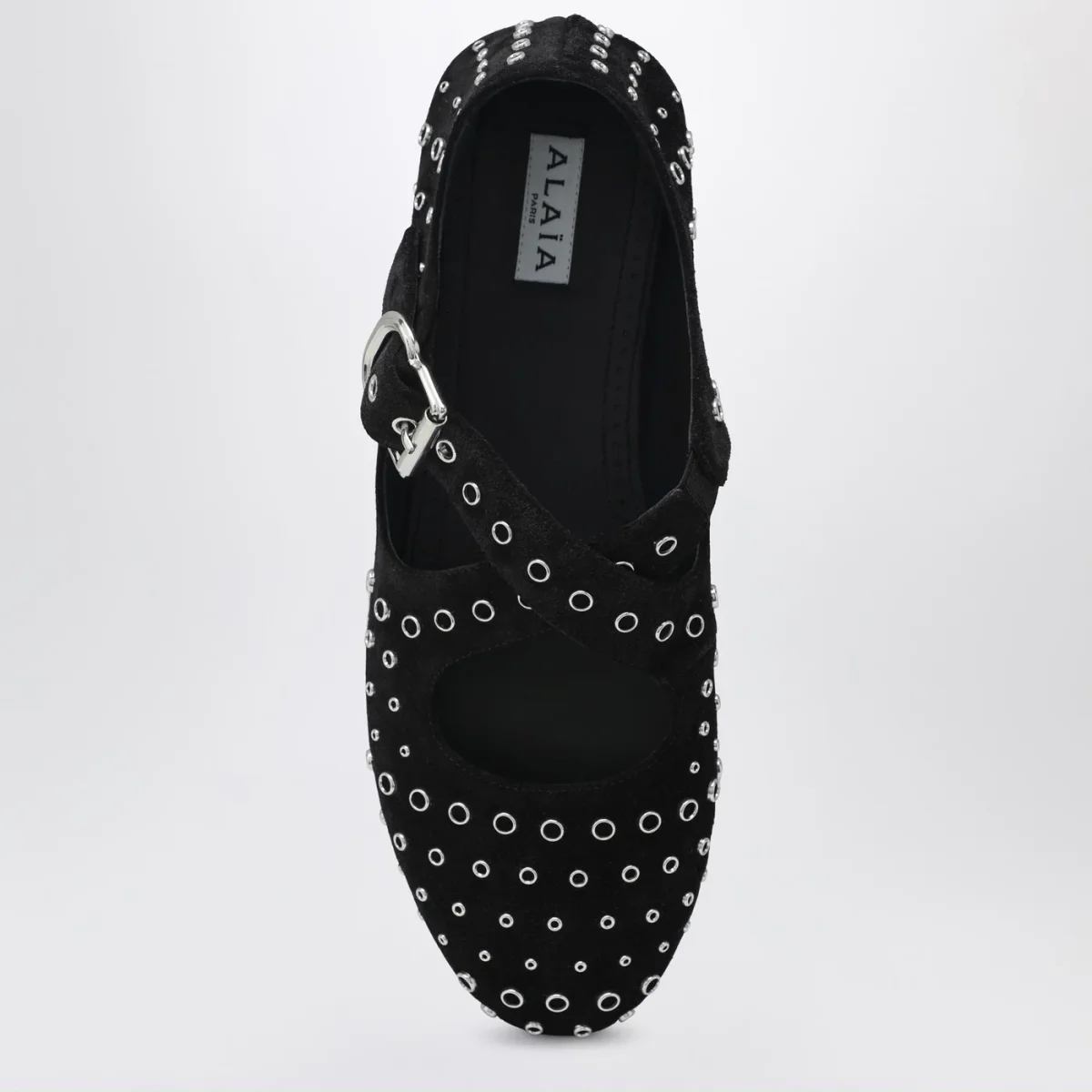 Ballerine flat di Alaia in pelle scamosciata nera• applicazione di occhielli metallici• cinturino incrociato con fibbia sulla parte superiore• suola in gomma