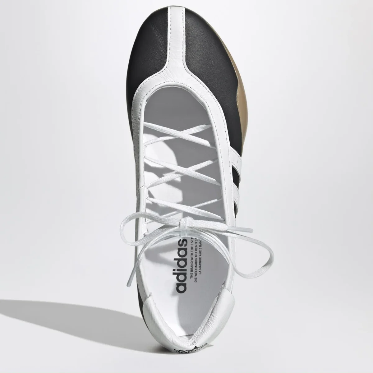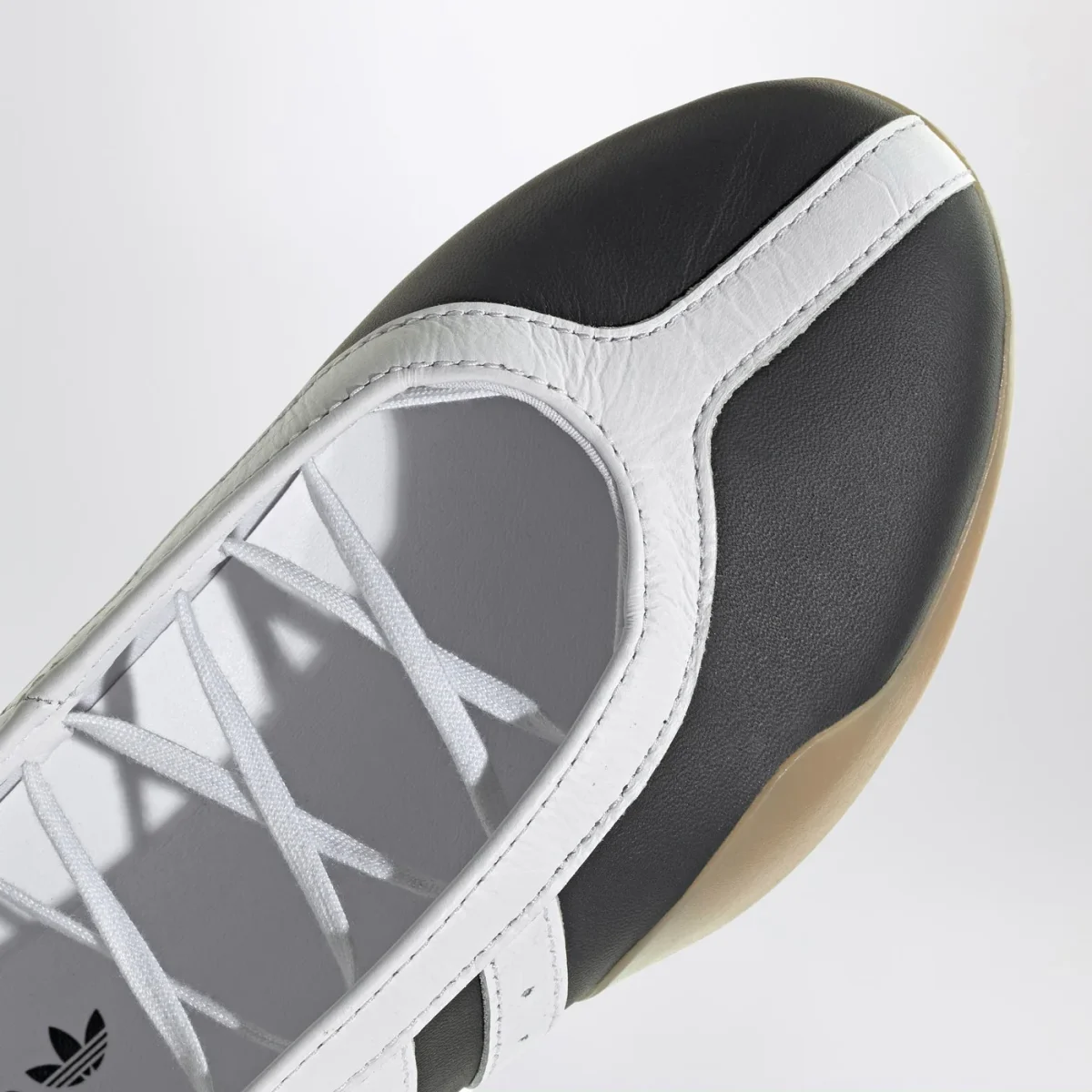 Ballerine di adidas Originals in pelle nere, caratterizzate da lacci incrociati sul davanti, bande bianche a contrasto laterali, punta tonda, tallone con logo a contrasto e suola in gomma.