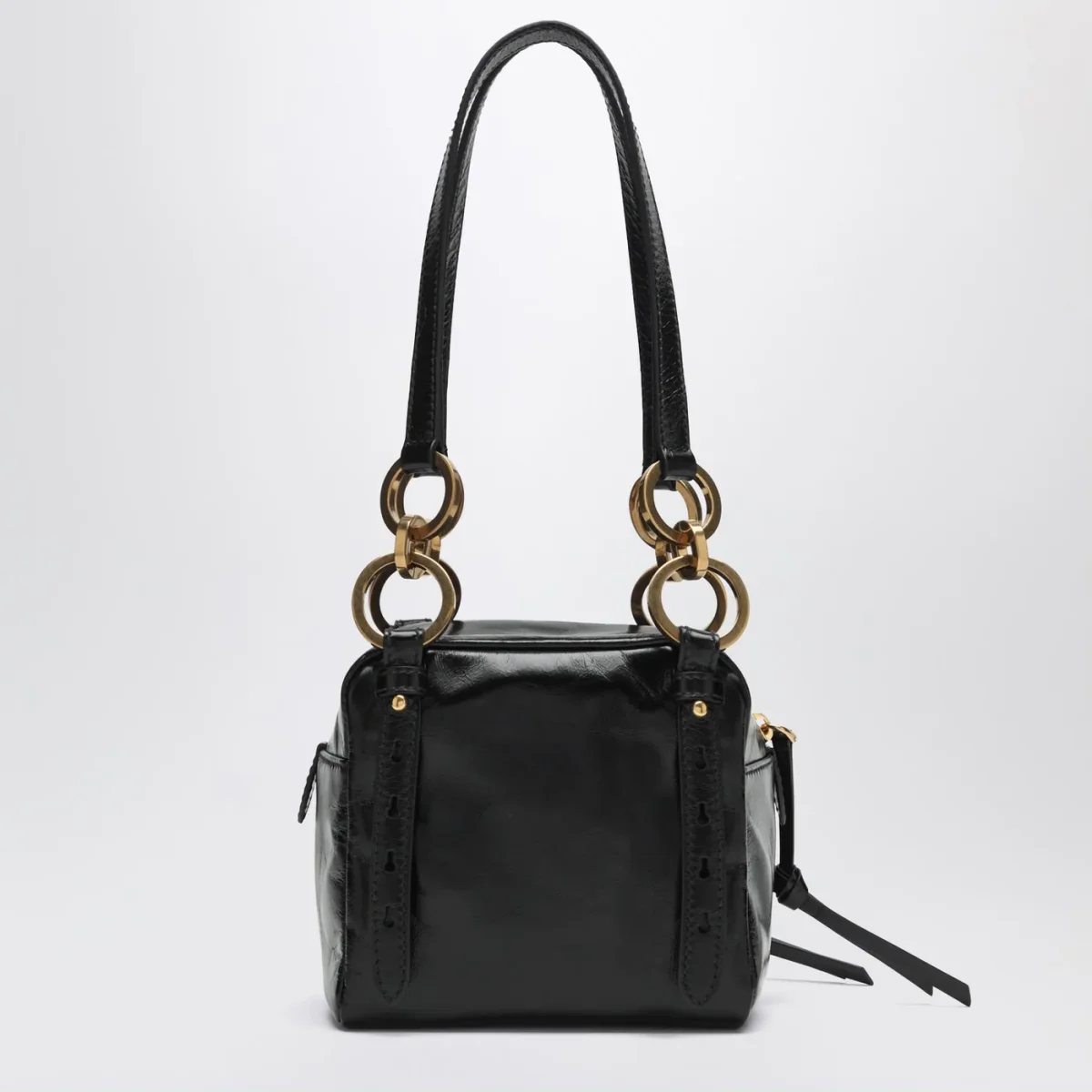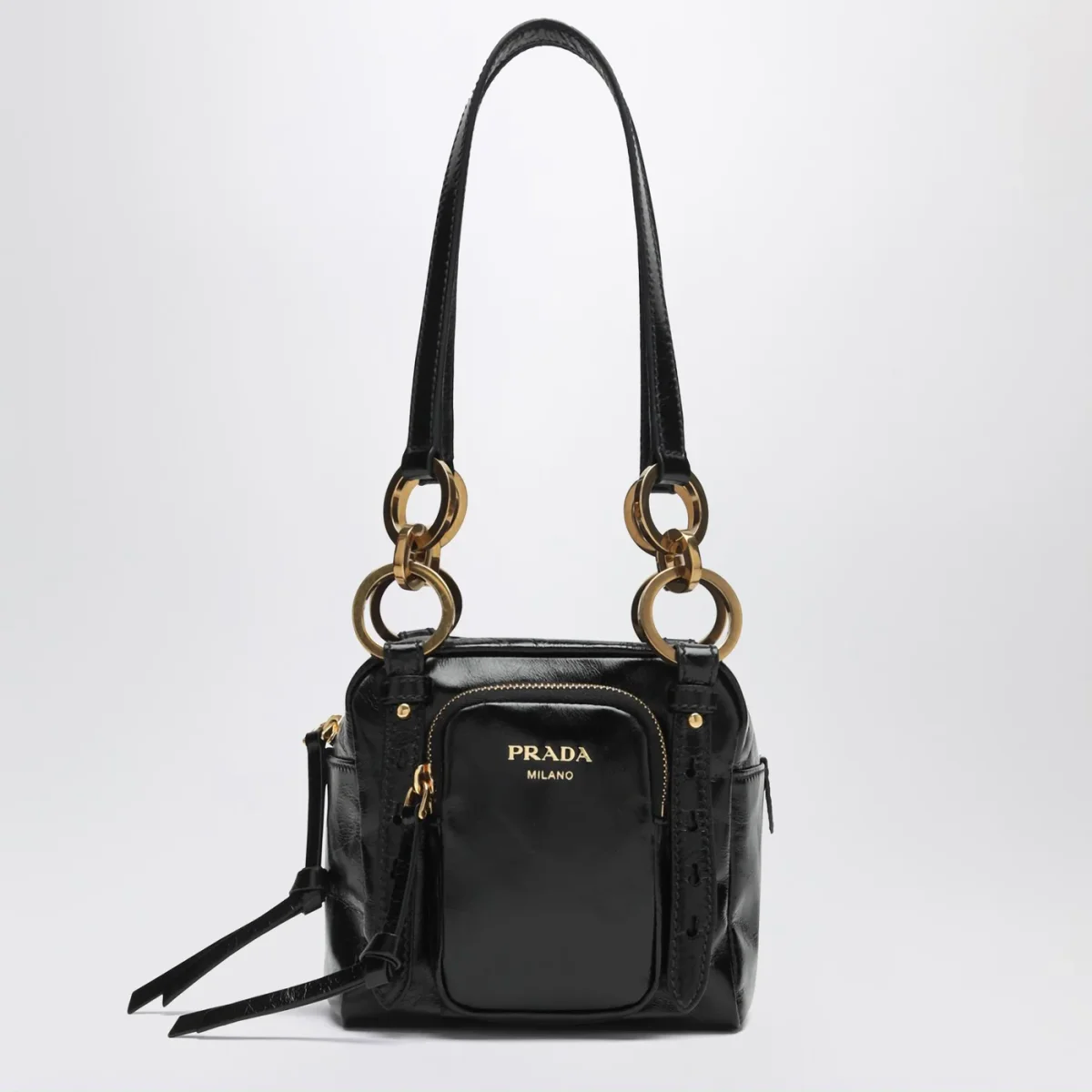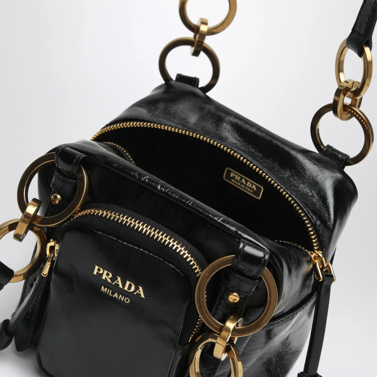 Bauletto mini di Prada in pelle nero, caratterizzato da design a forma cubica, finiture in metallo anticato, una tasca con zip frontale con logo lettering a contrasto, chiusura zip e interno in nylon siglato.