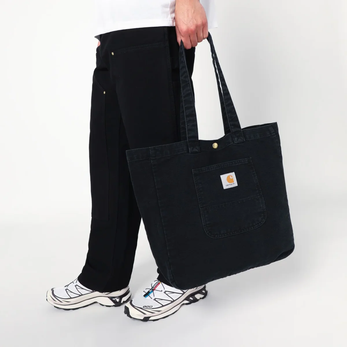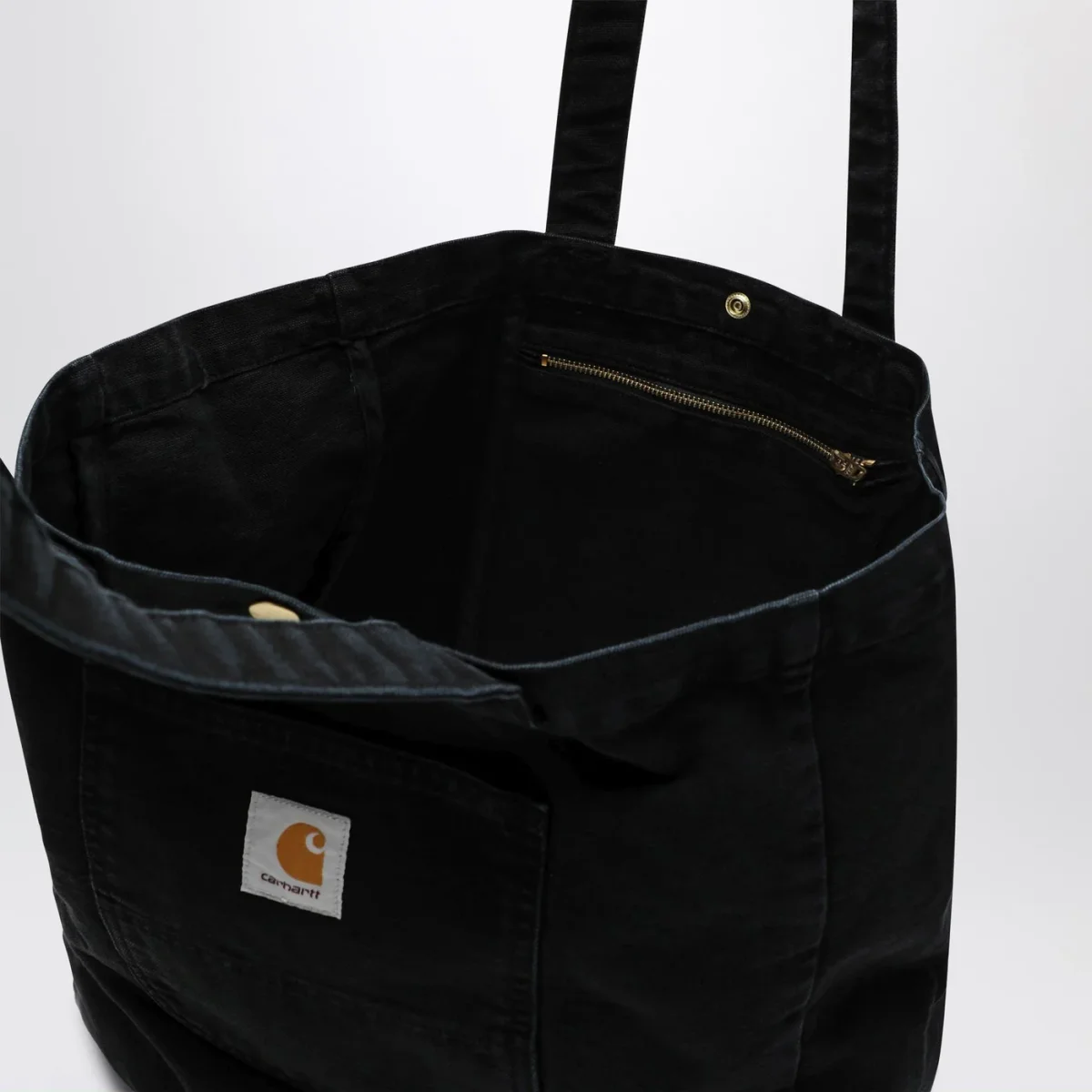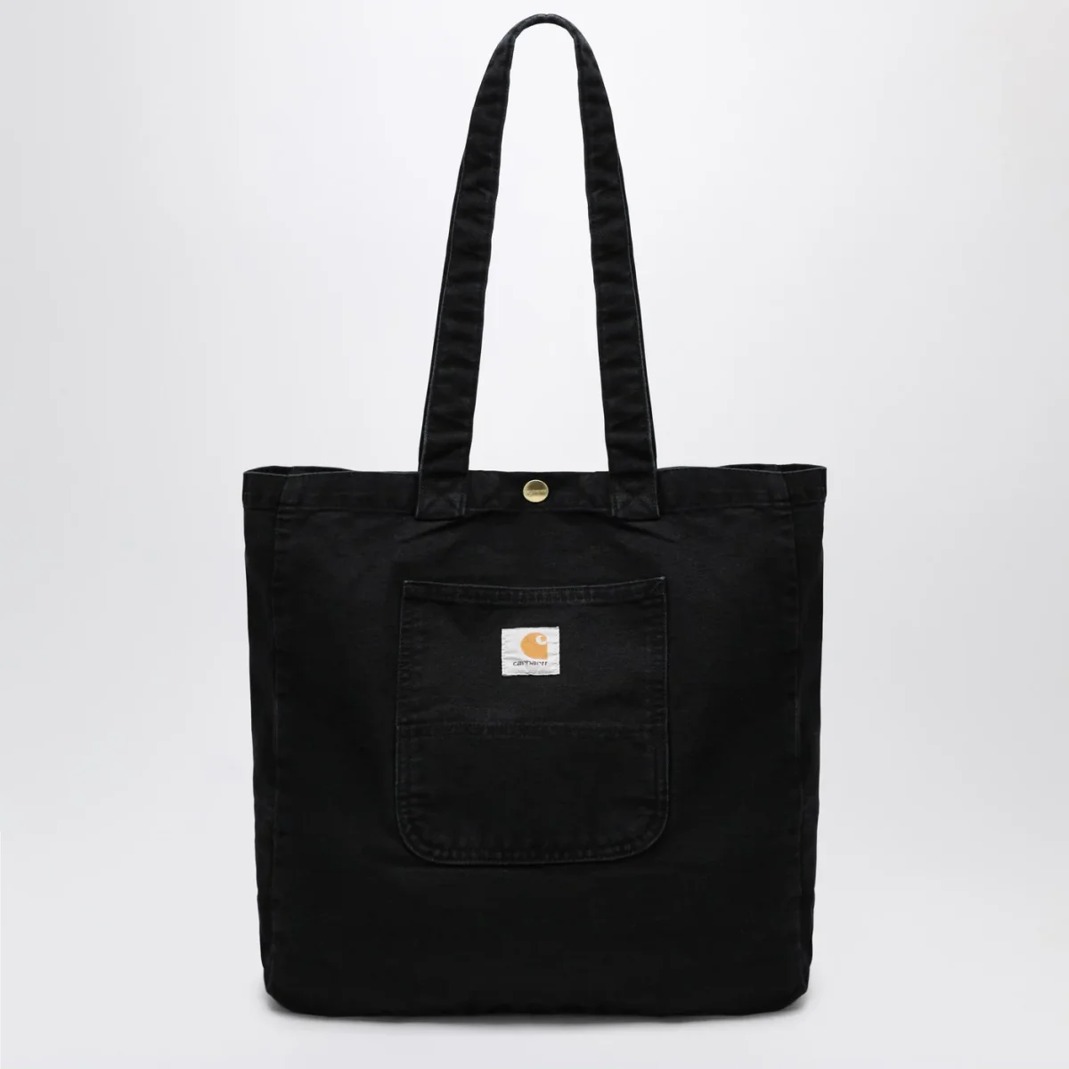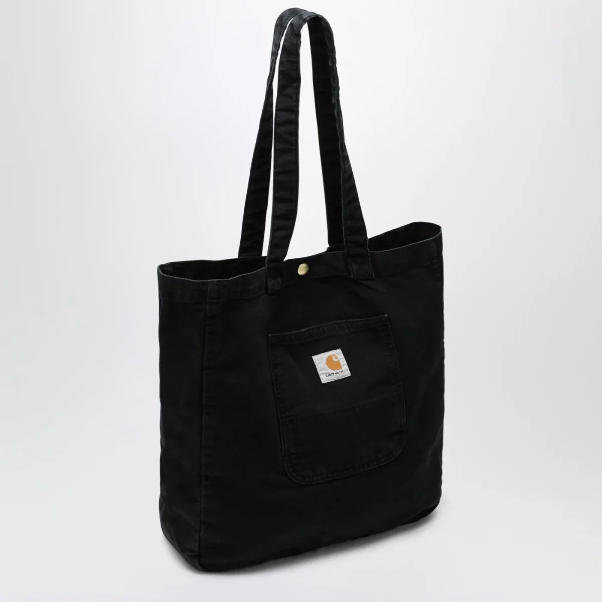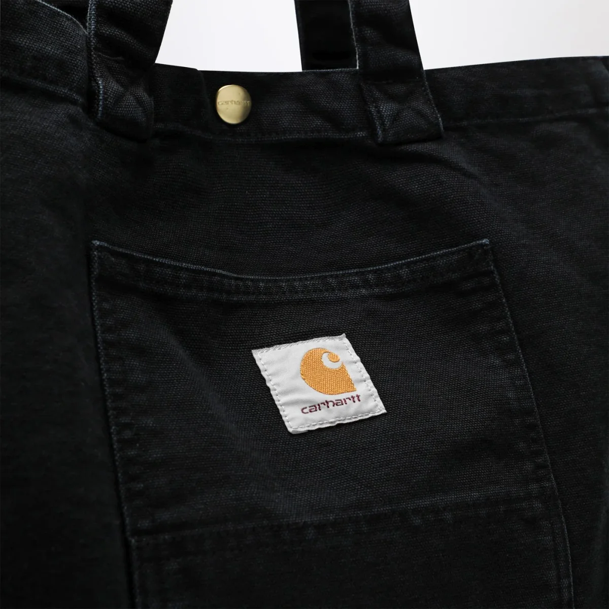 Tote piccola di Carhartt WIP in tela Dearborn da 340 grammi effetto sbiadito, caratterizzata da due manici, chiusura con bottone automatico, una tasca esterna con etichetta quadrata in tessuto e una tasca interna con zip.