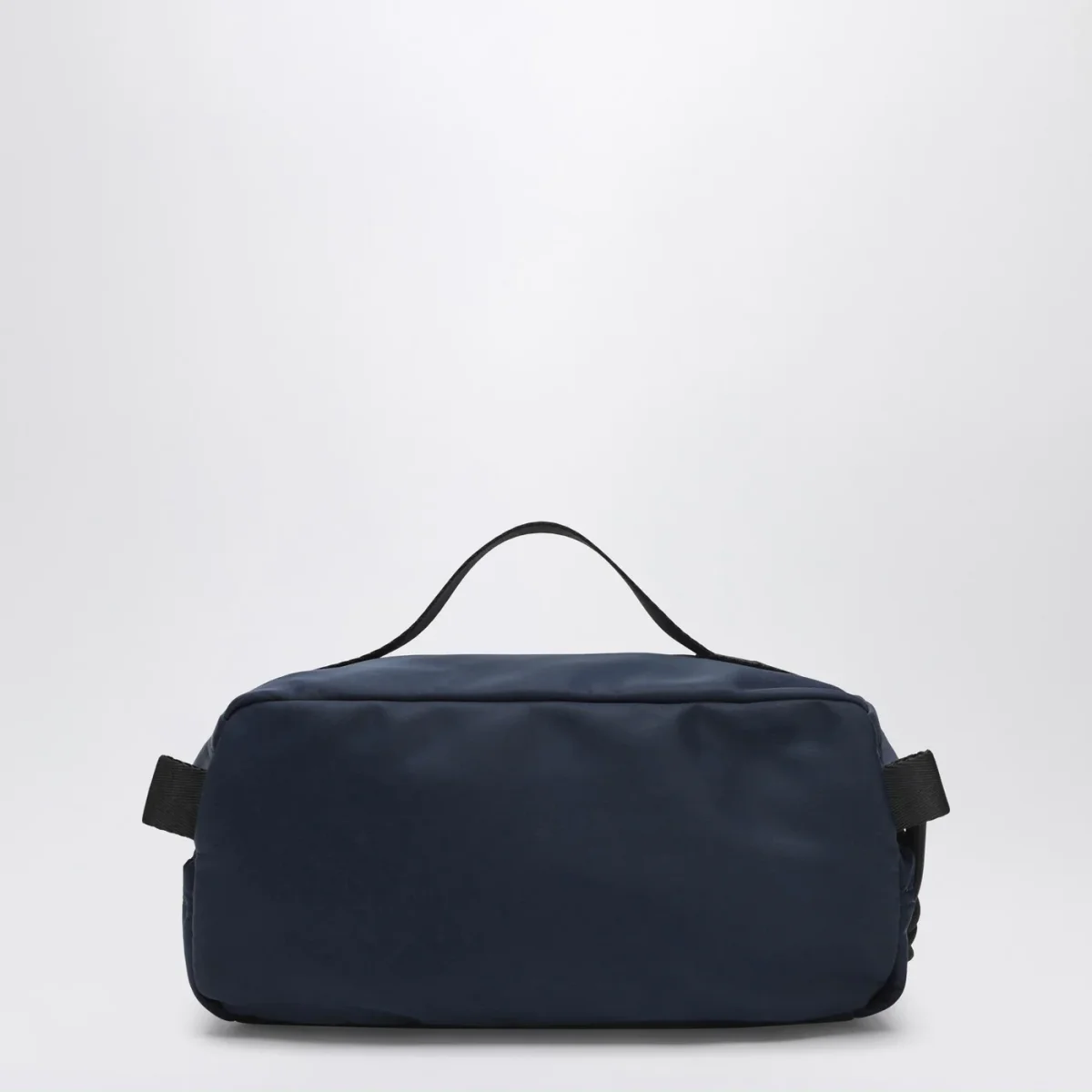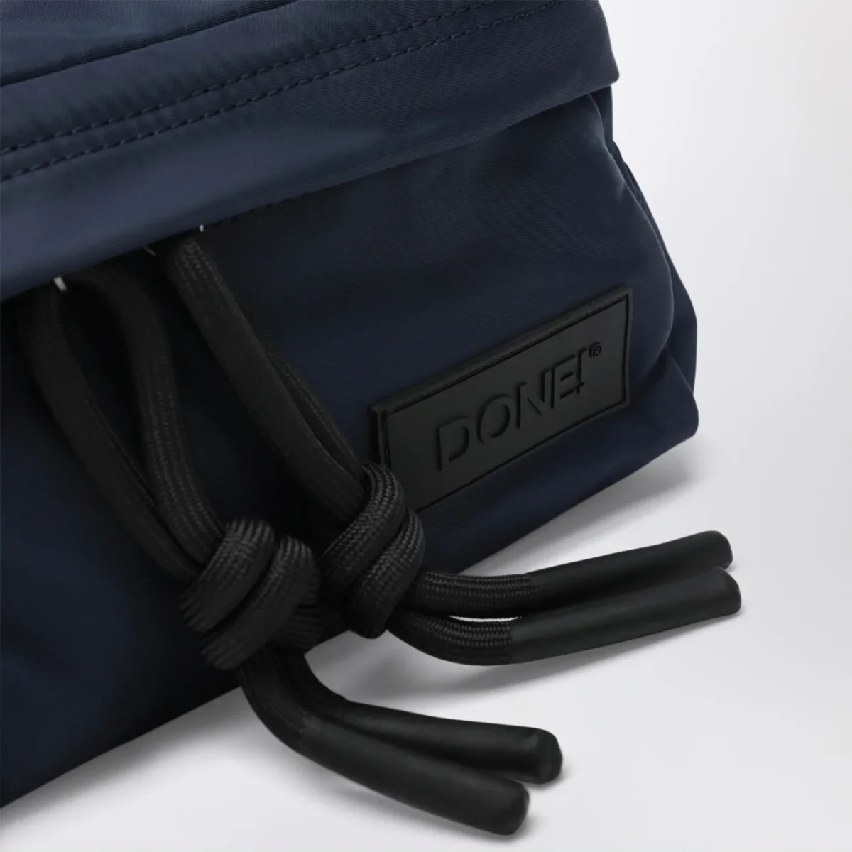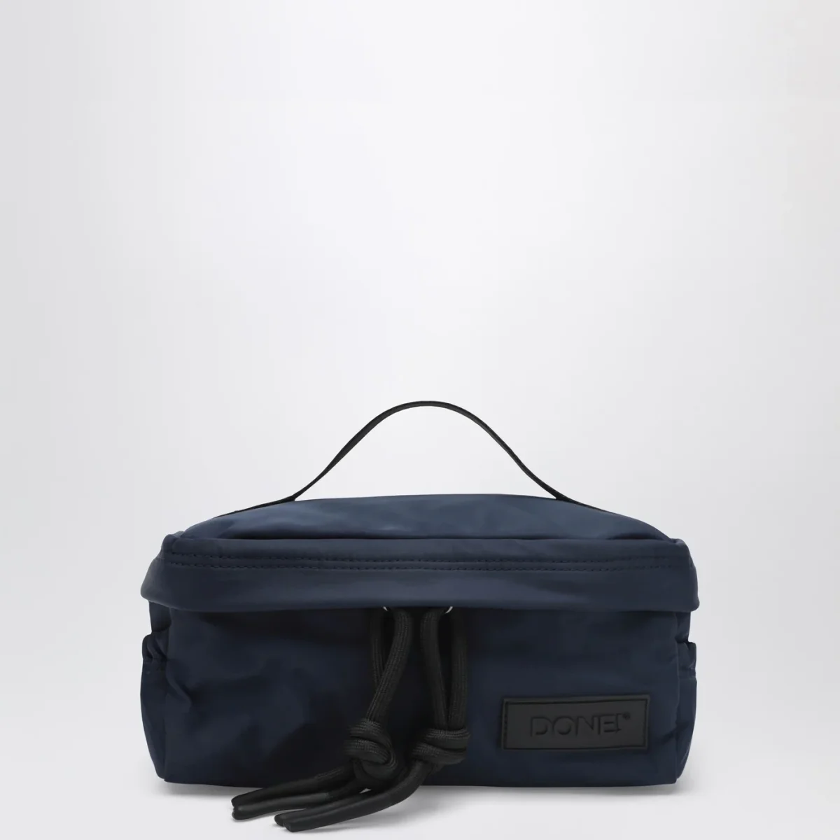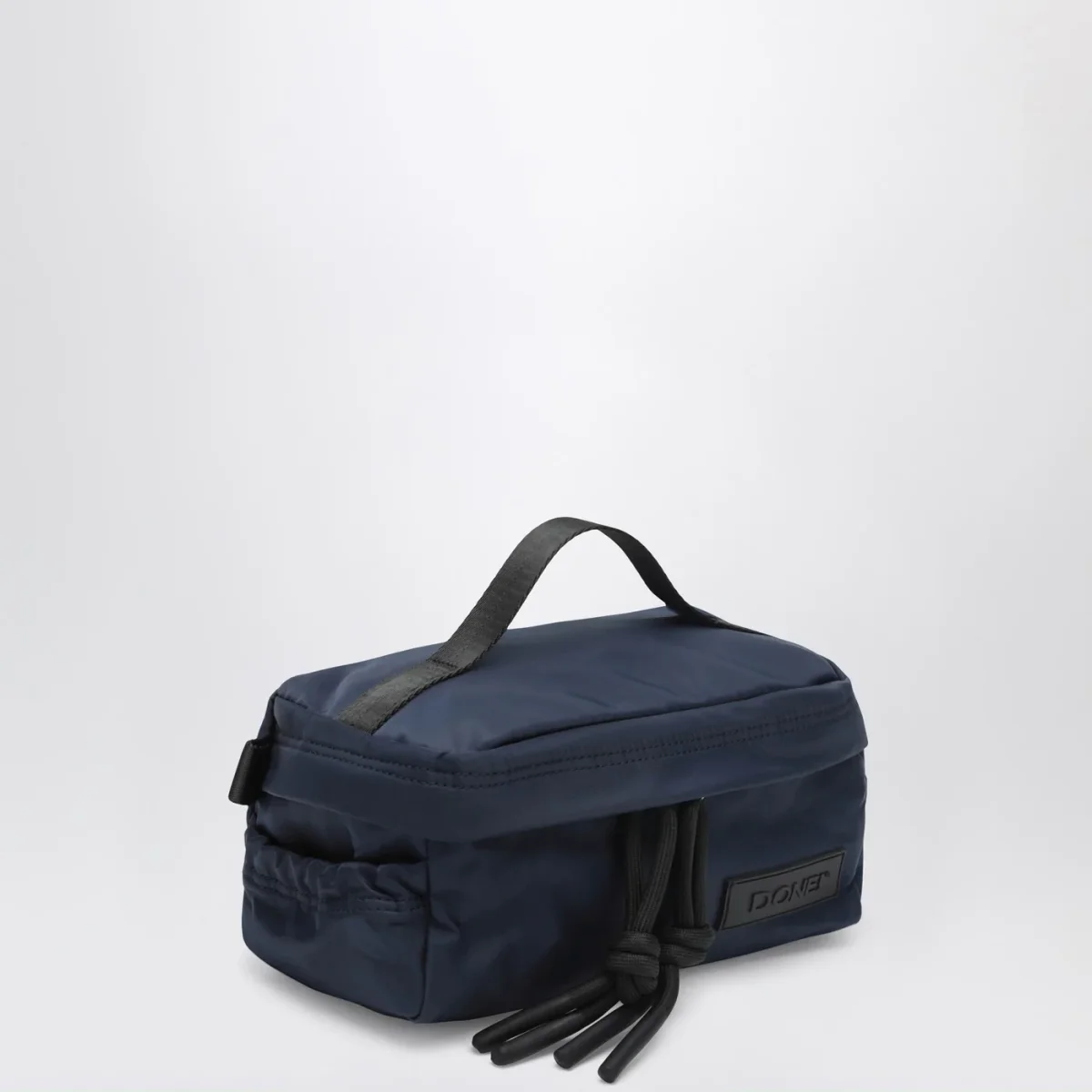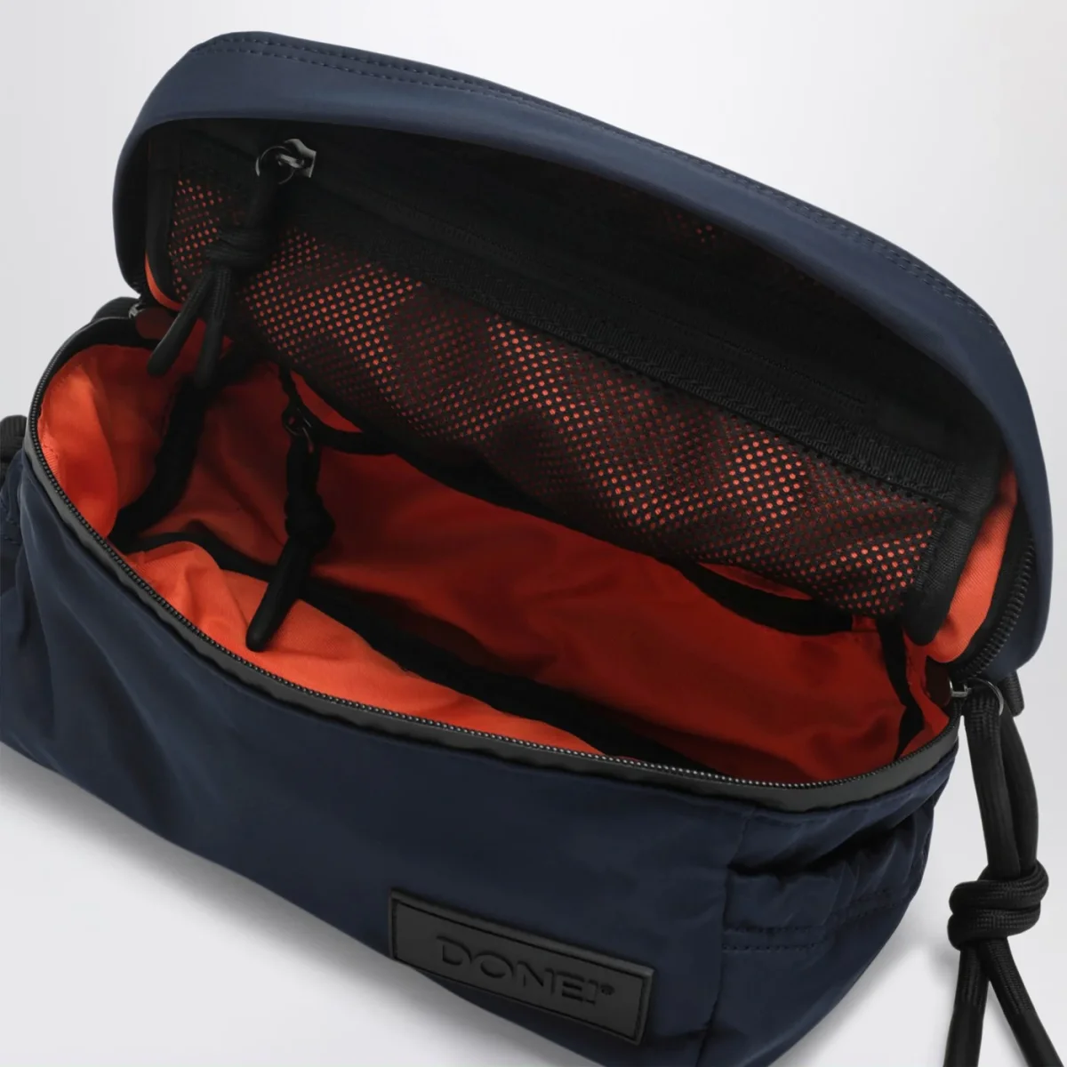 Beauty case di DONE! in nylon blu, caratterizzato da chiusura con cerniera rivestita, scomparto principale, due tasche laterali con chiusura a coulisse, tasca a rete interna porta oggetti, fodera interna in nylon arancione per garantire maggior visibilità, tasca interna con cerniera, tre scomparti porta spazzolino, due loop di nastri laterali per aggancio tracolla e una tasca posteriore con cerniera rivestita.