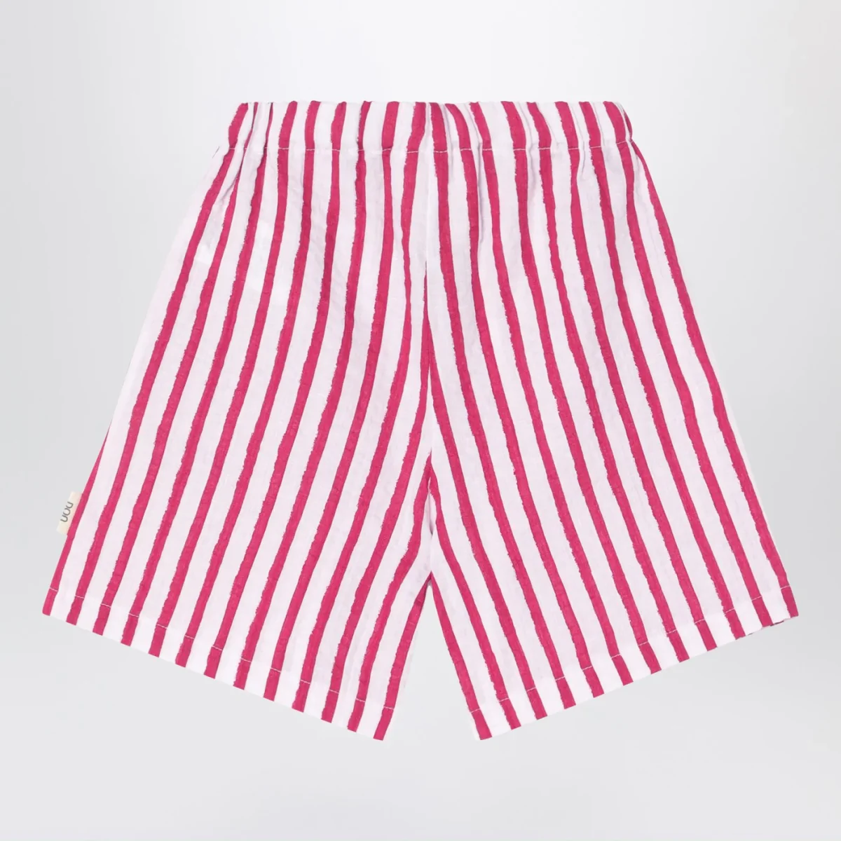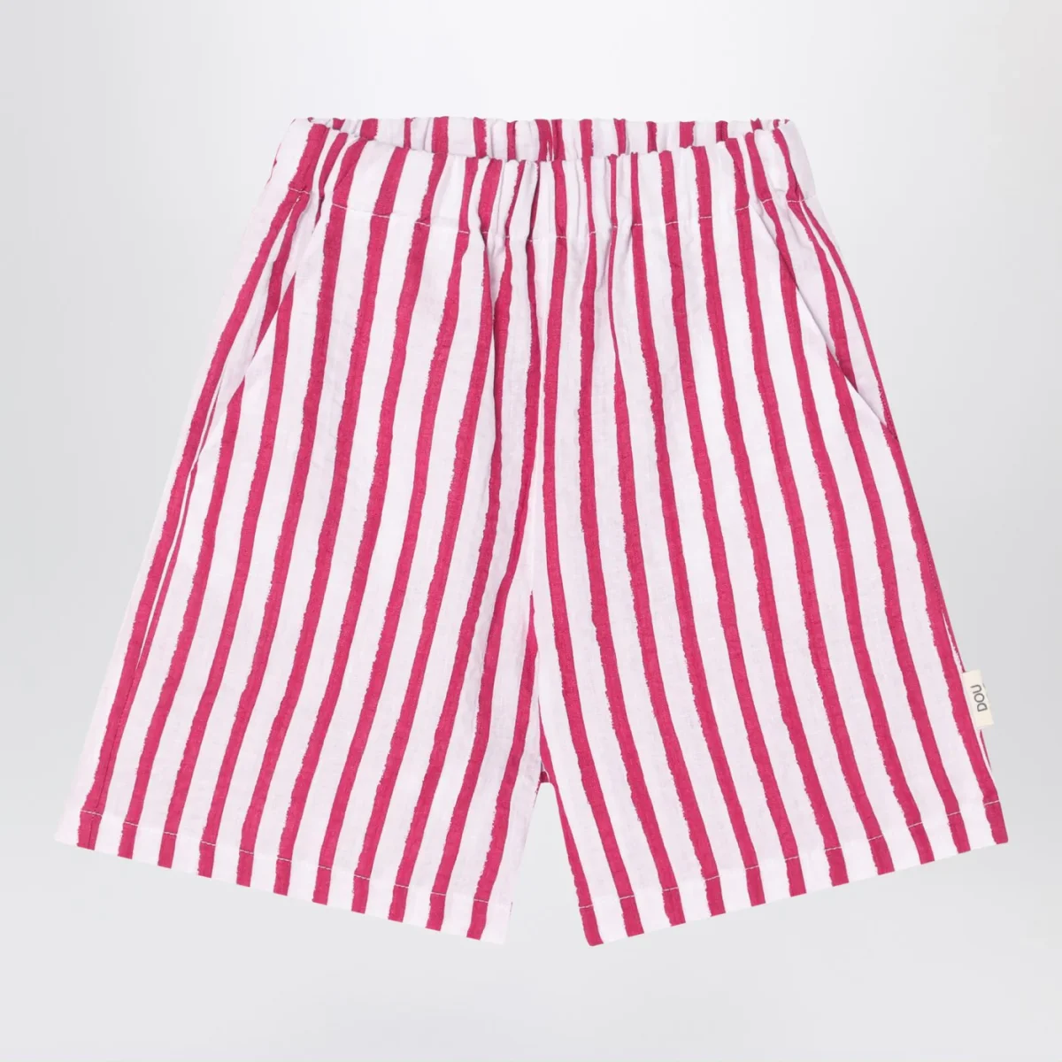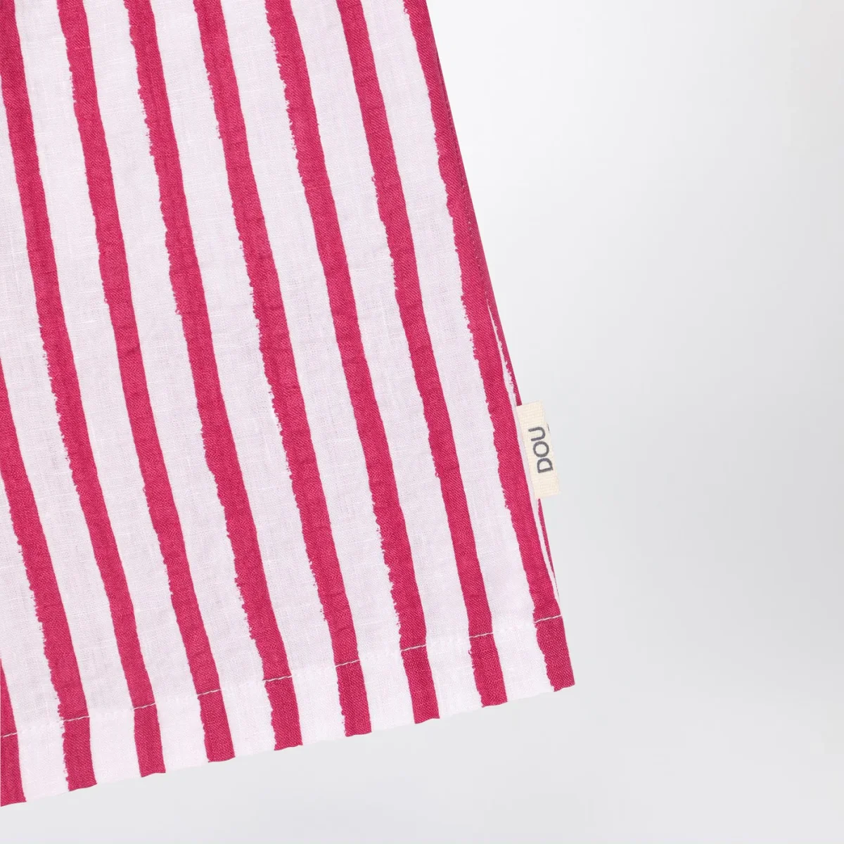 Bermuda di Douuod in lino bianco a righe rosse, caratterizzato da vita elasticizzata, due tasche a filetto e patch logo laterale.