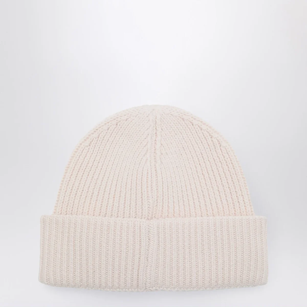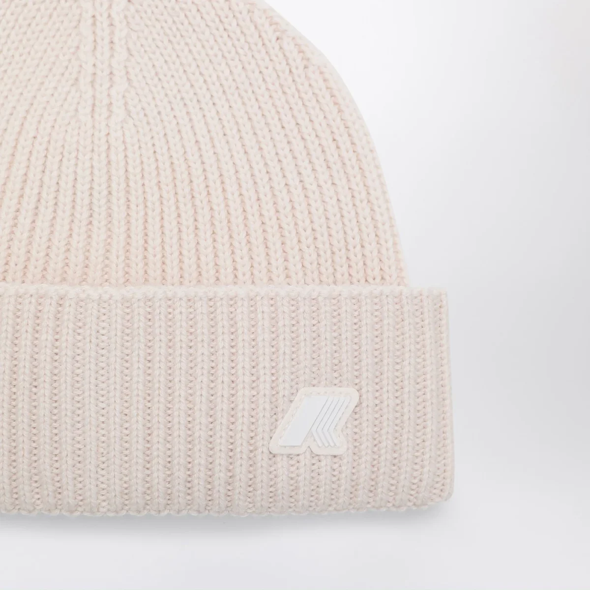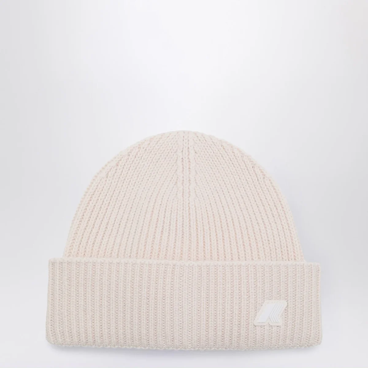 Berretto di K-Way in misto lana e cotone color bianco gardenia mélange, caratterizzato da design a costine e risvolto con patch logo in silicone sul davanti.
