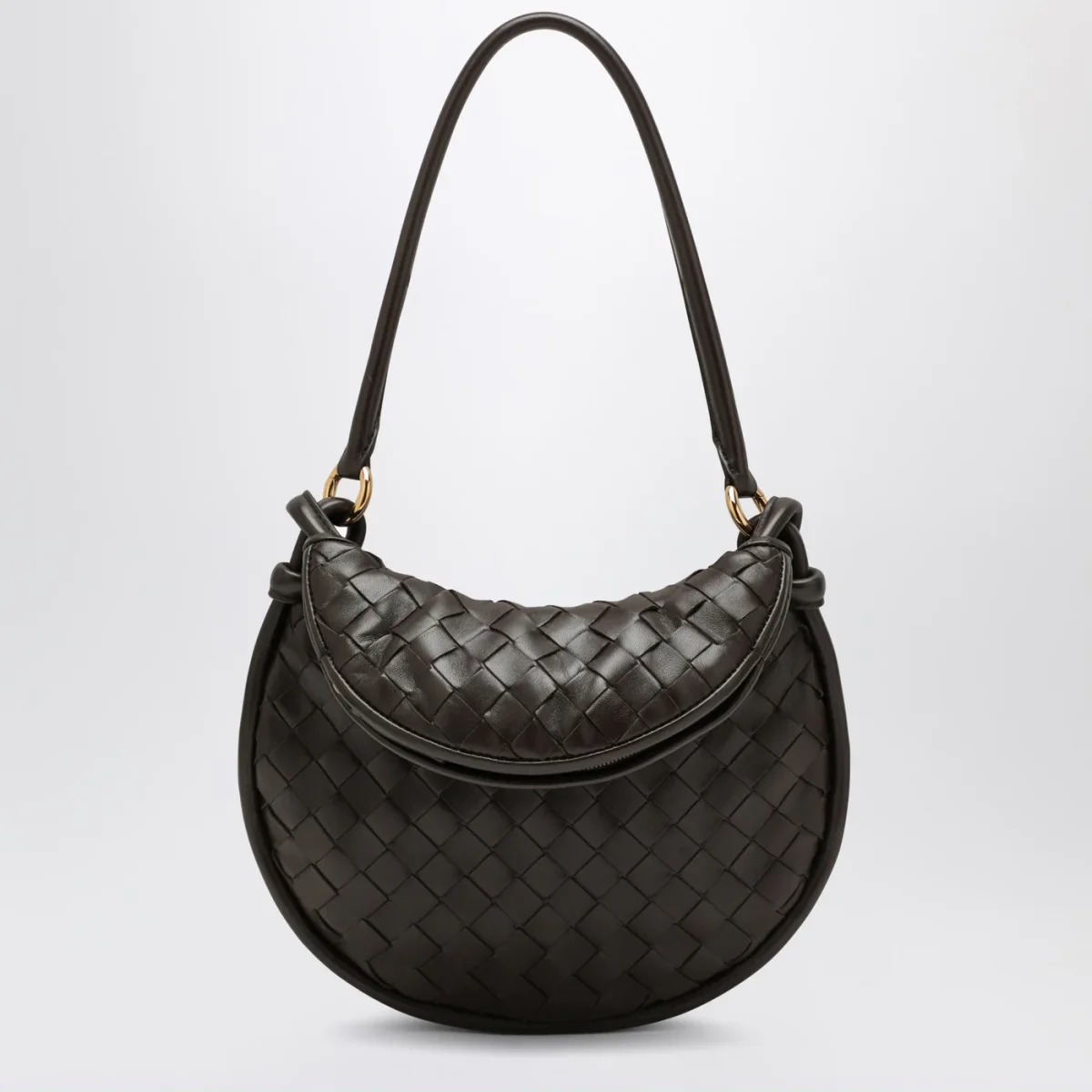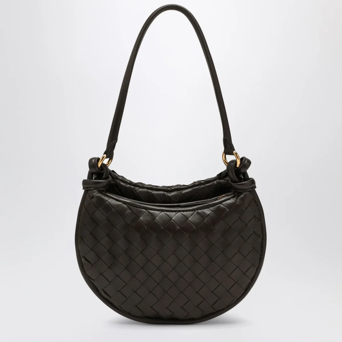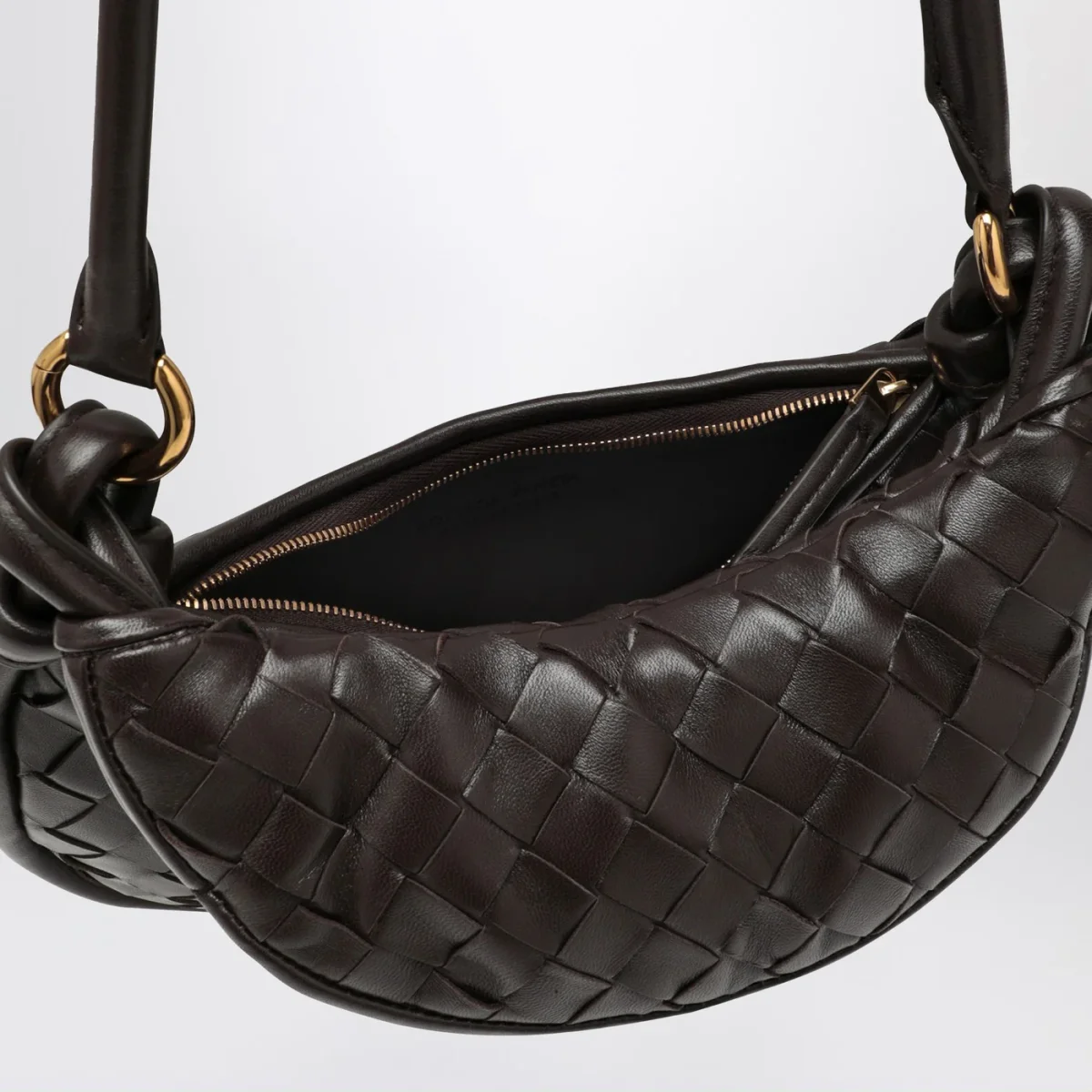 Borsa piccola di Bottega Veneta in pelle color fondente, motivo Intrecciato. Modello caratterizzato da manico superiore in pelle, chiusura tramite zip ed hardware in metallo color oro.