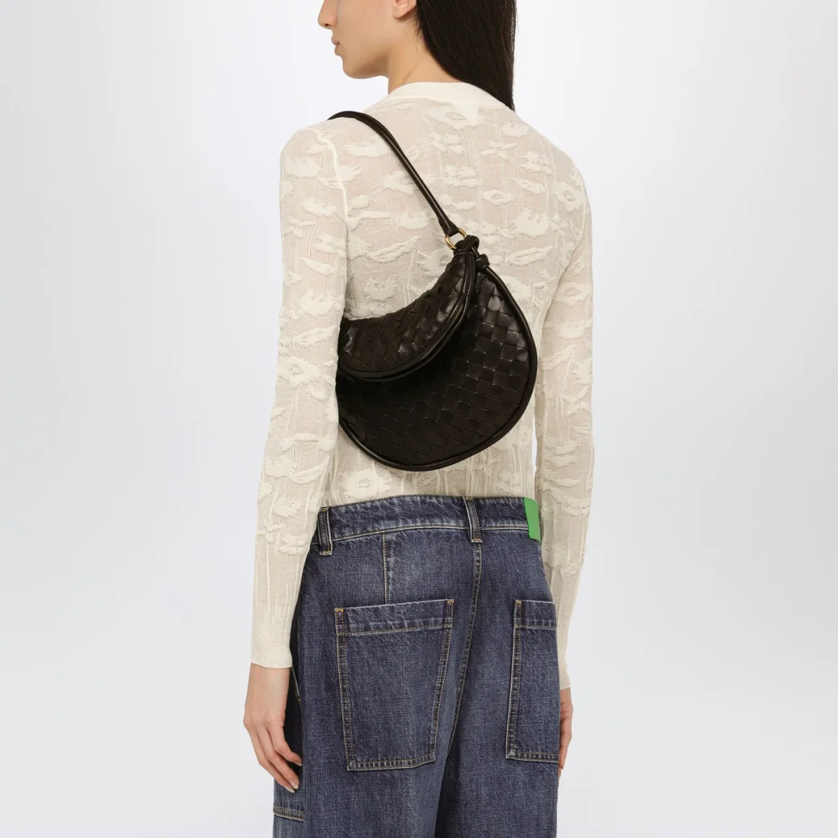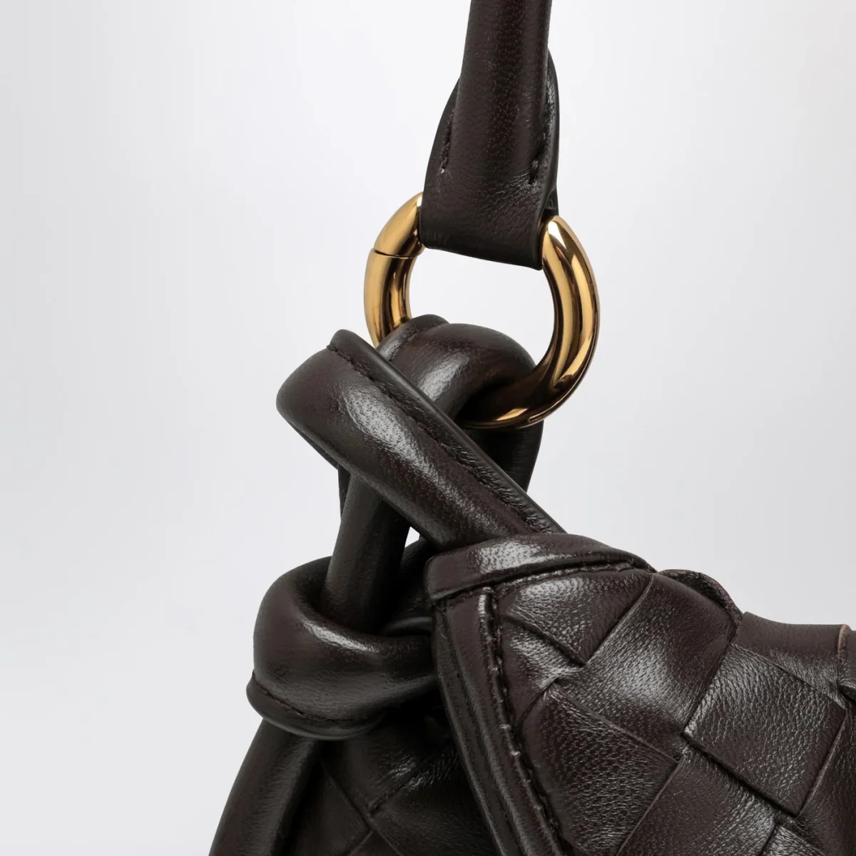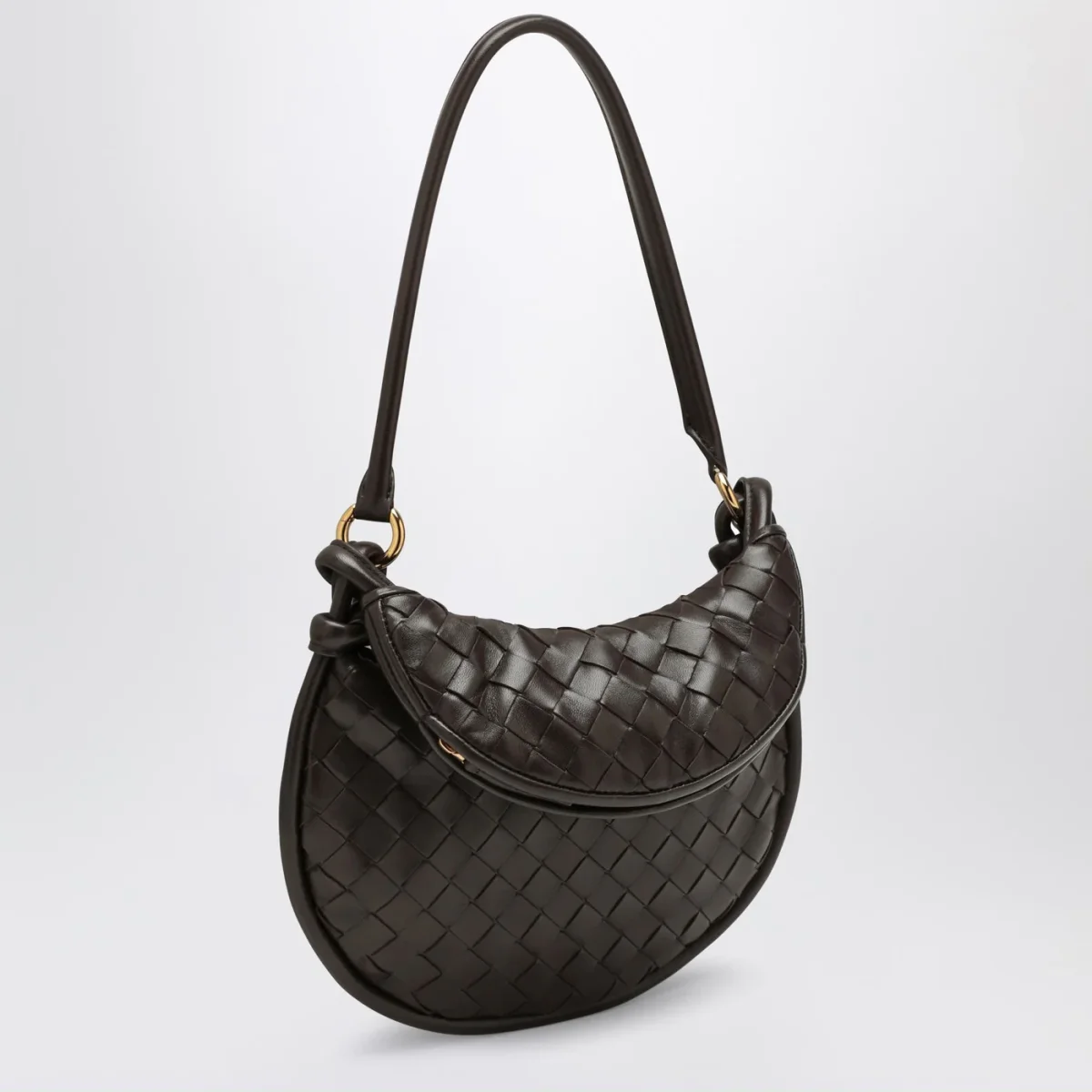 Borsa piccola di Bottega Veneta in pelle color fondente, motivo Intrecciato. Modello caratterizzato da manico superiore in pelle, chiusura tramite zip ed hardware in metallo color oro.