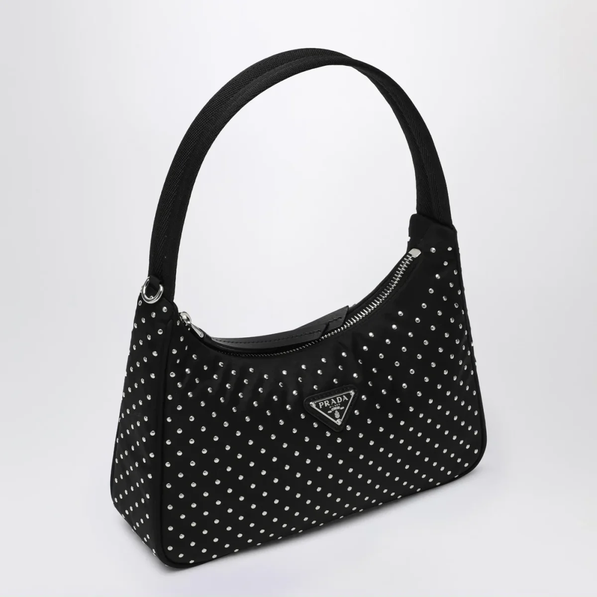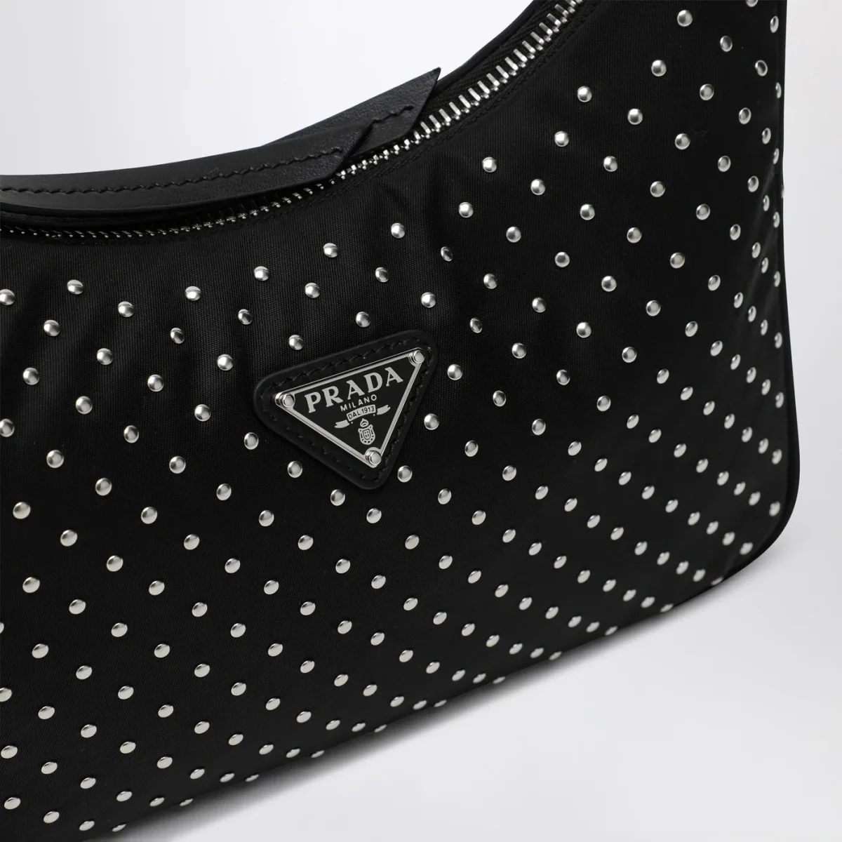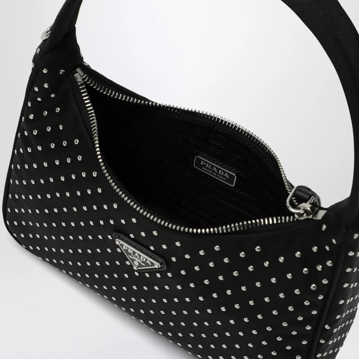 Borsa a mano di Prada in Nylon nera, caratterizzata da piccole borchie all over, chiusura con zip, manico in nastro, logo triangolo in metallo smaltato frontale e hardware in metallo color argento.
