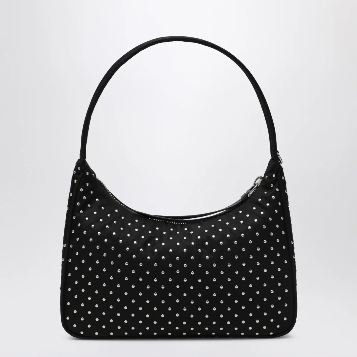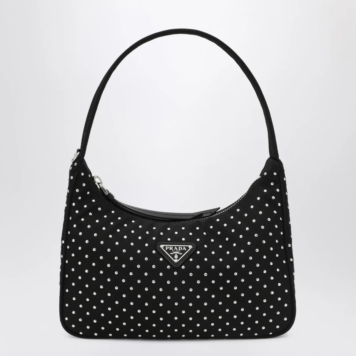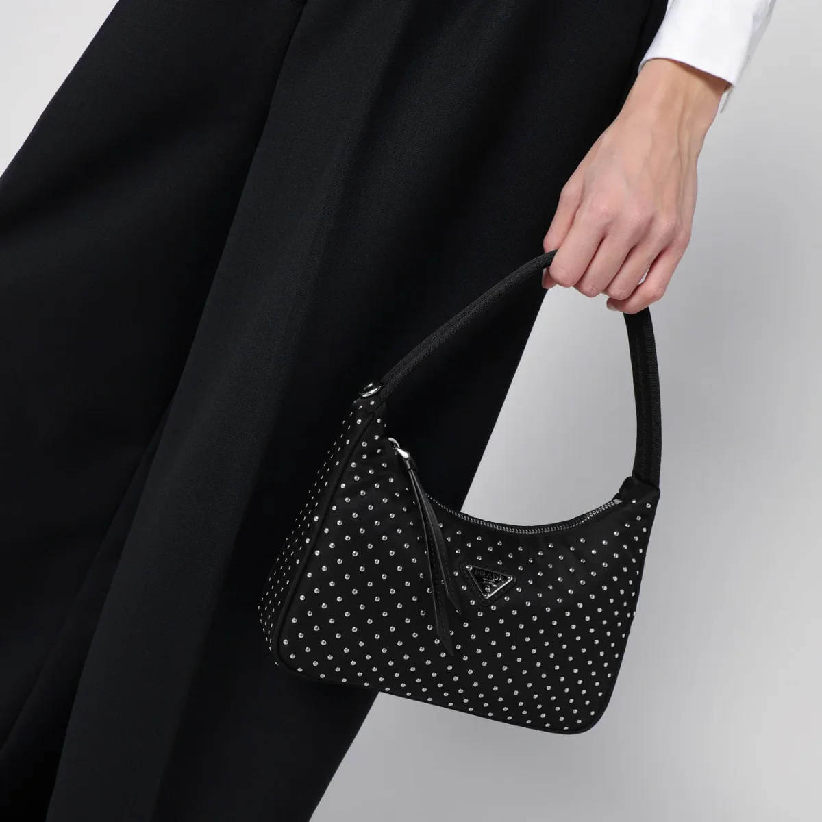 Borsa a mano di Prada in Nylon nera, caratterizzata da piccole borchie all over, chiusura con zip, manico in nastro, logo triangolo in metallo smaltato frontale e hardware in metallo color argento.