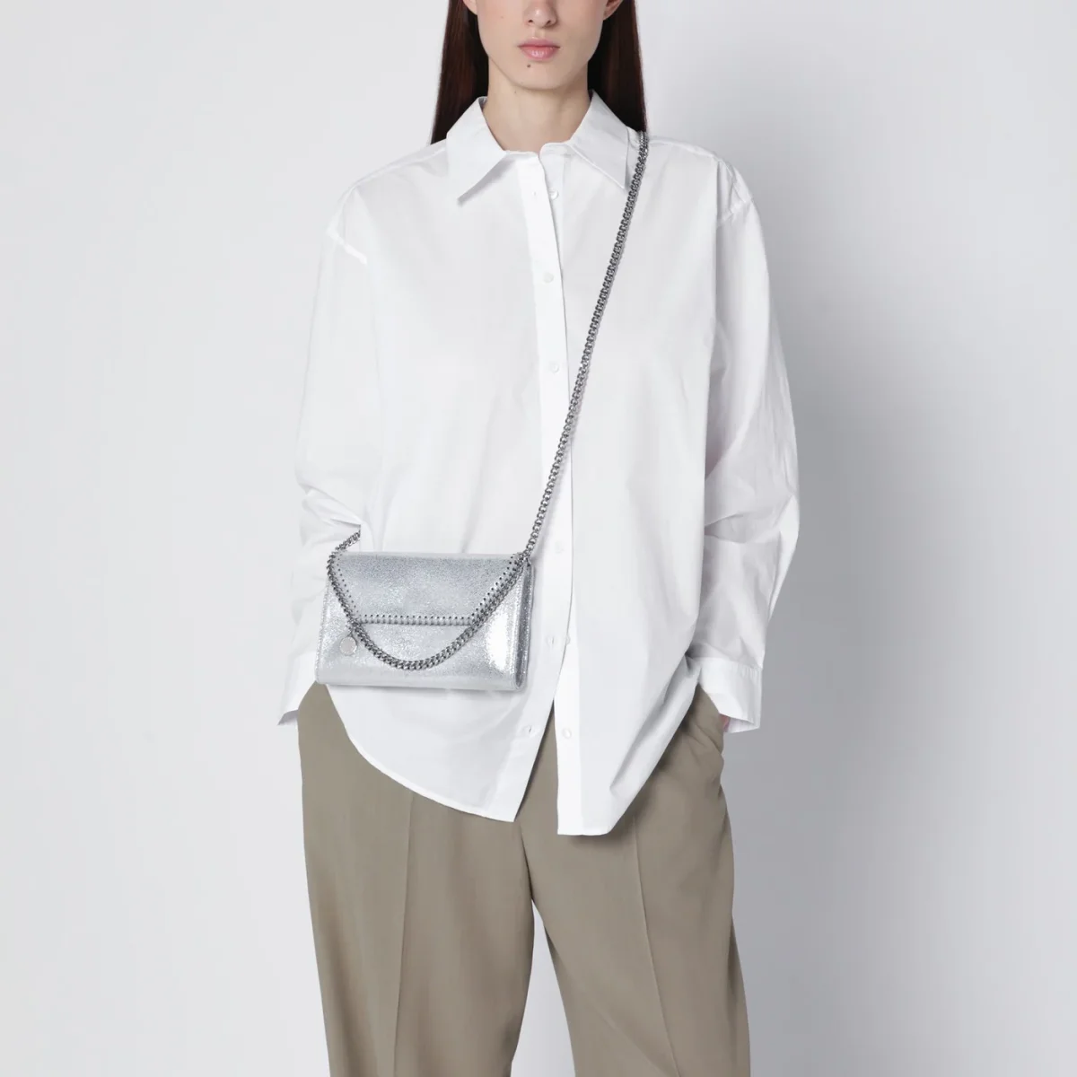 Borsa portafoglio di Stella McCartney in ecopelle argento metallizzato• tracolla con catena• chiusura con patta e bottone magnetico• una tasca piatta interna• hardware in metallo color argento