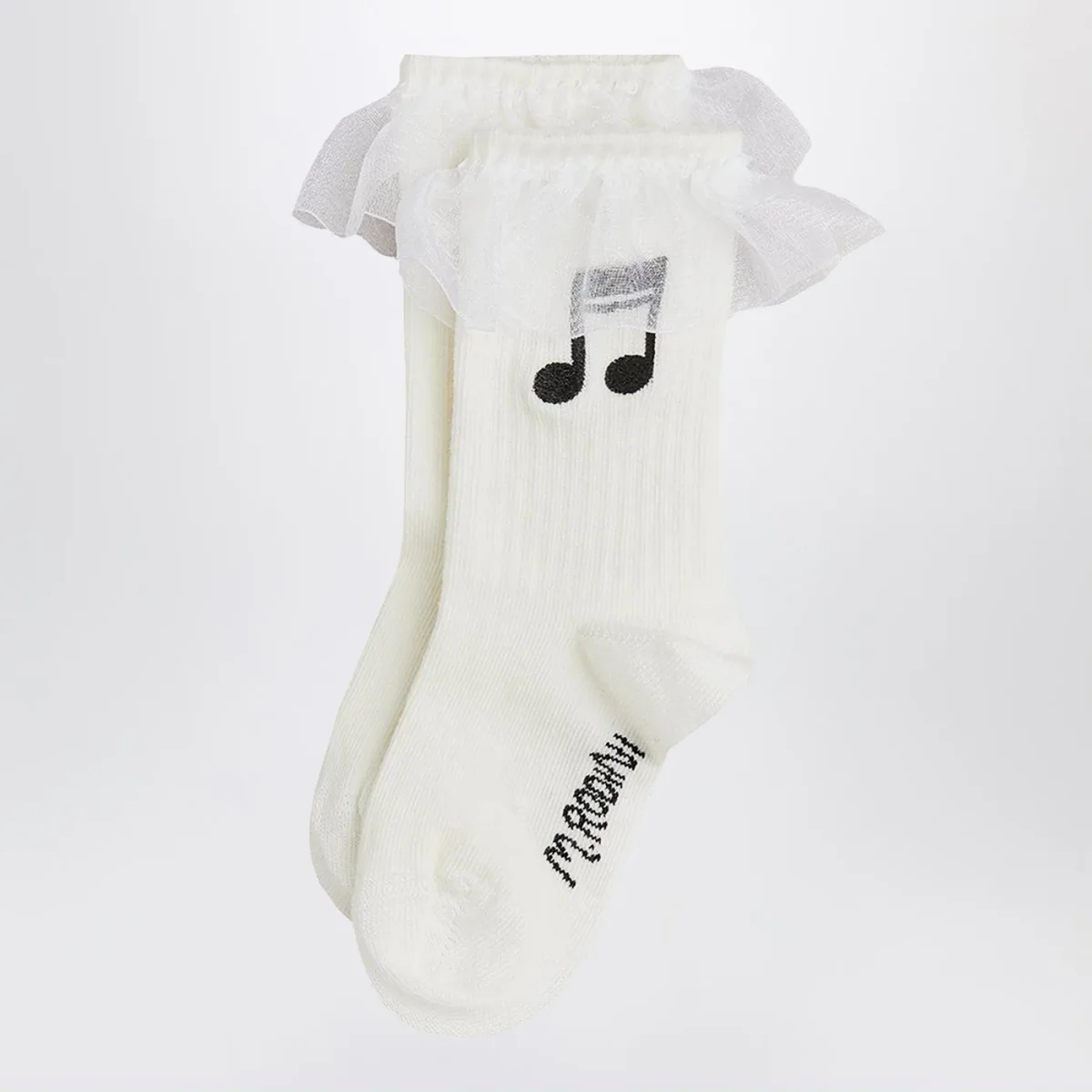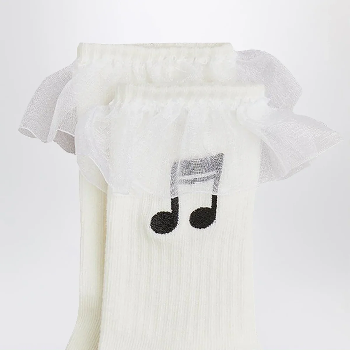 Calzini di Mini Rodini in misto cotone organico bianchi, caratterizzati da dettaglio con balza in volant, punta e tallone rinforzati e nota musicale a contrasto sul lato.