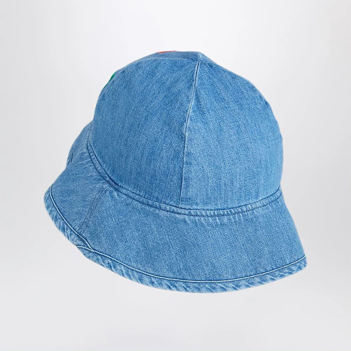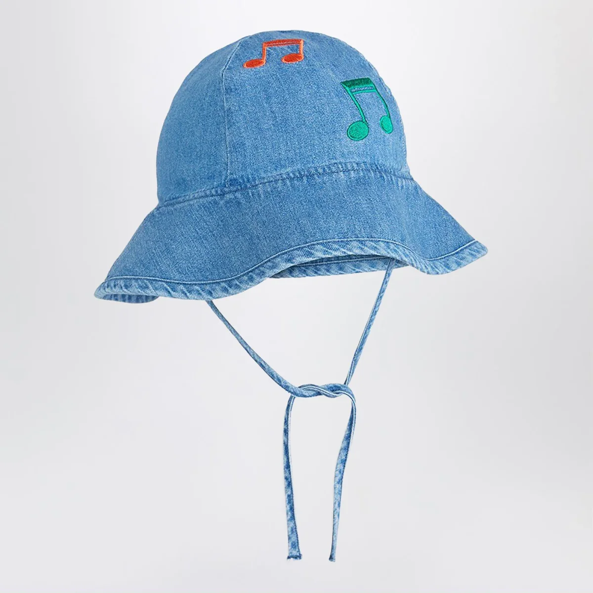 Cappello da pescatore di Mini Rodini in denim di cotone blu chiaro, caratterizzato da laccetti da annodare sotto il mento e ricami con note musicali colorate.