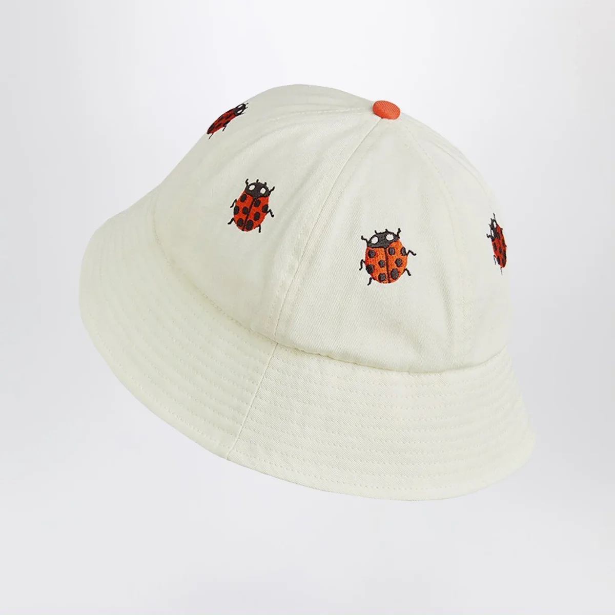 Cappello da pescatore di Mini Rodini in cotone bianco, caratterizzato da laccetti da annodare sotto il mento e ricami con coccinelle all over.