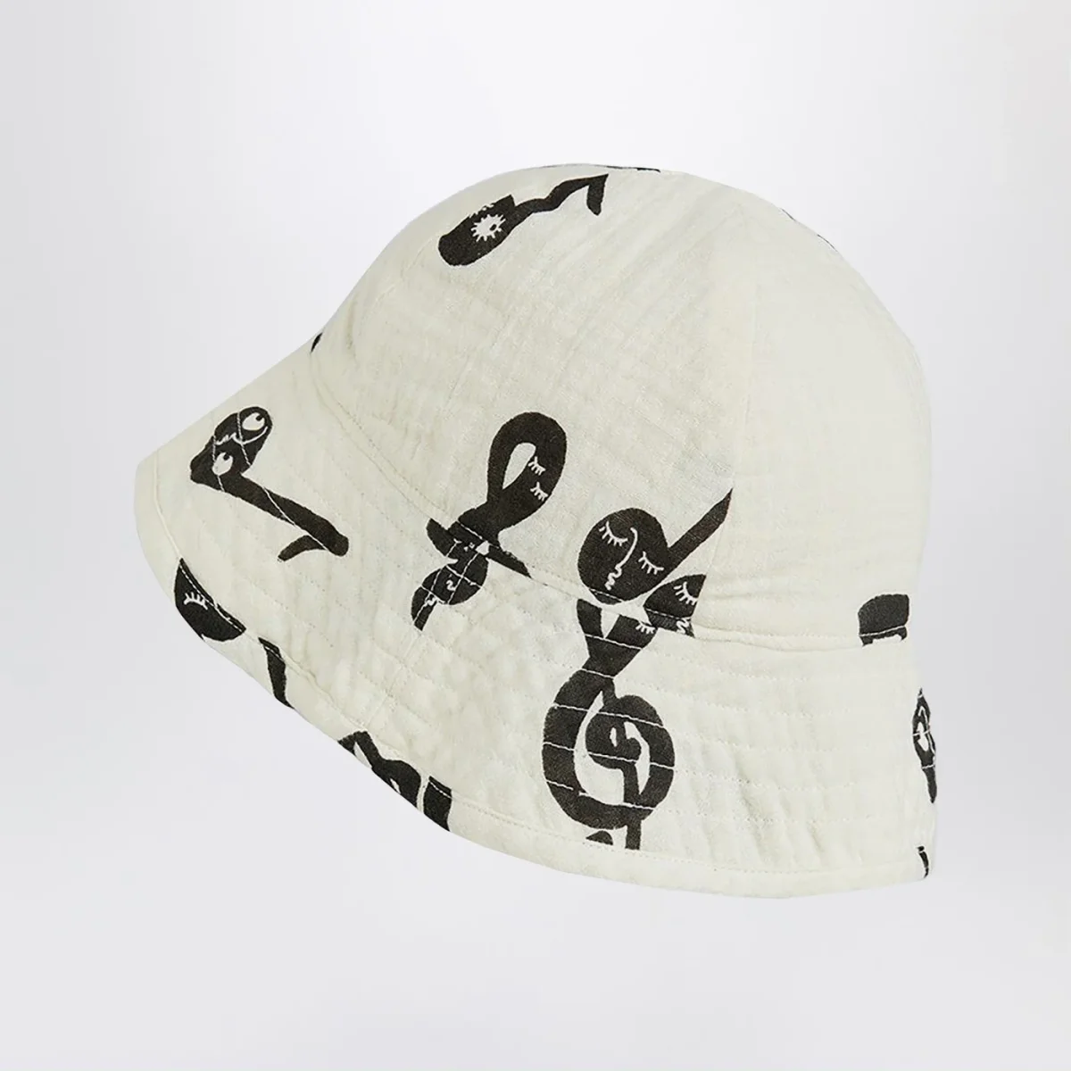 Cappello da pescatore di Mini Rodini in cotone bianco con note musicali a contrasto all over e laccetti da annodare sotto il mento.