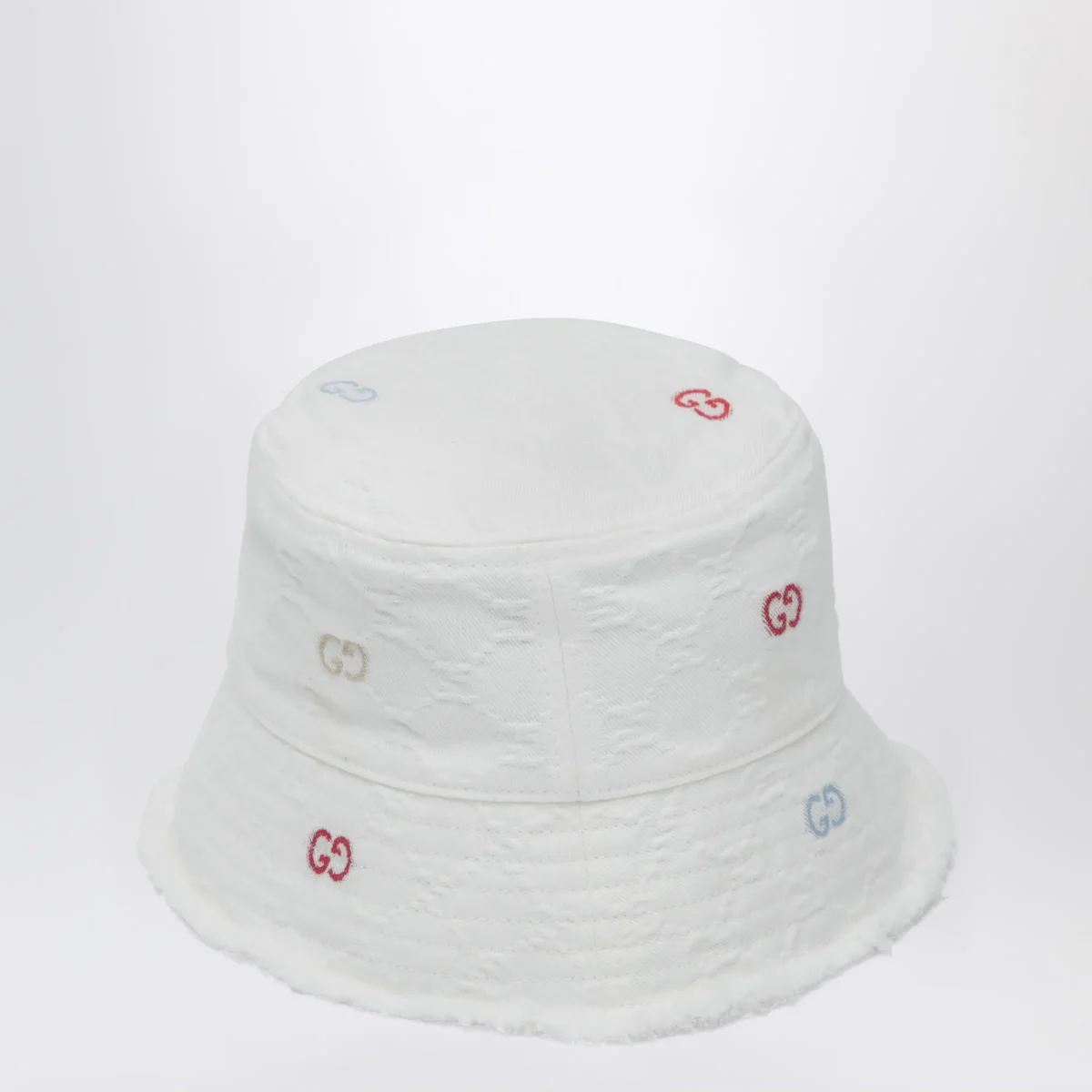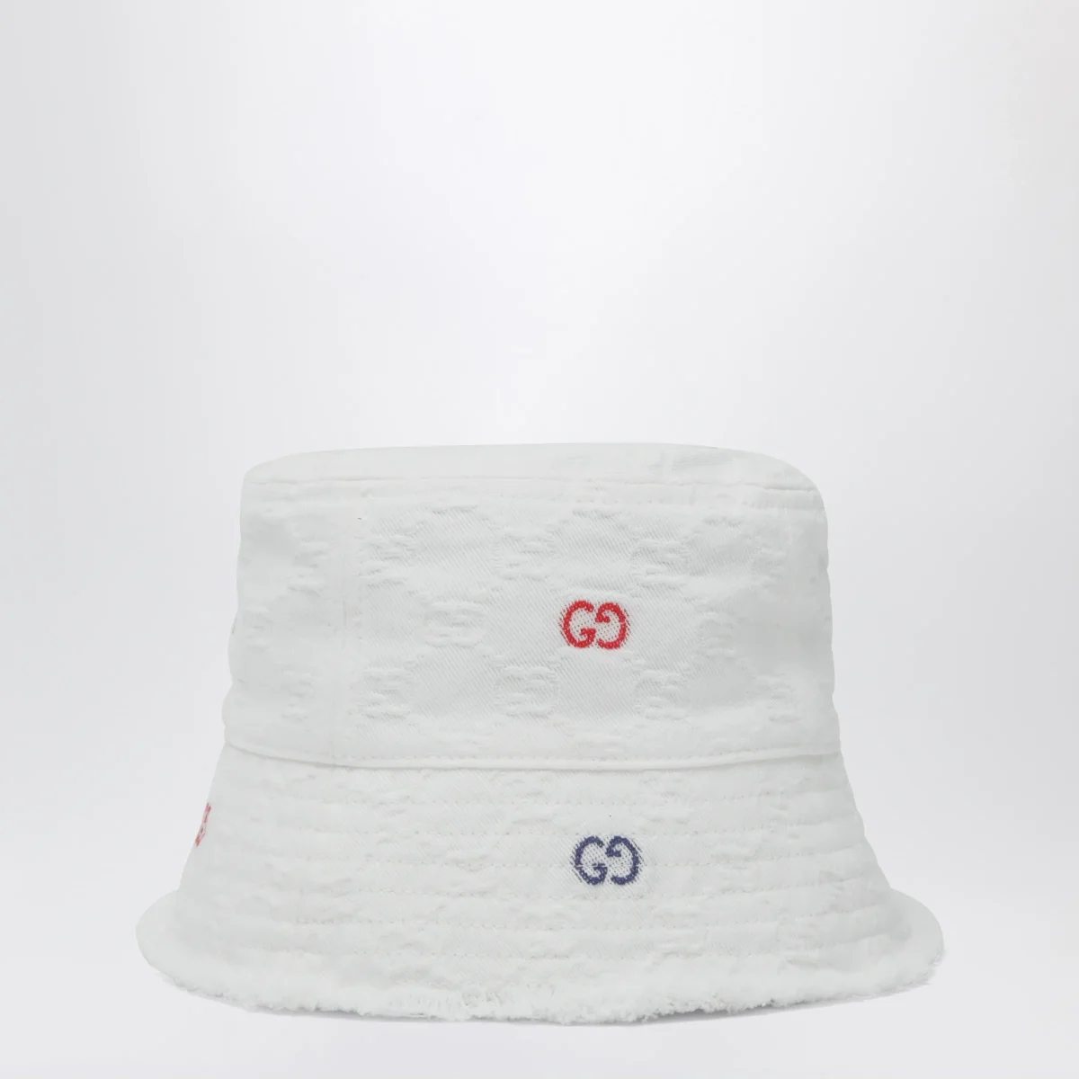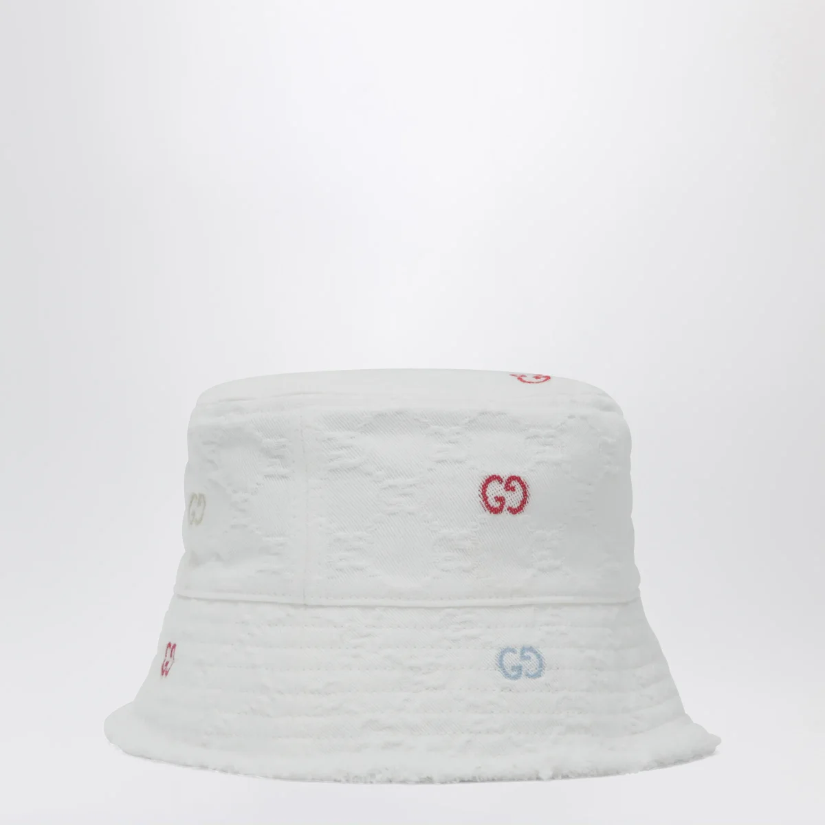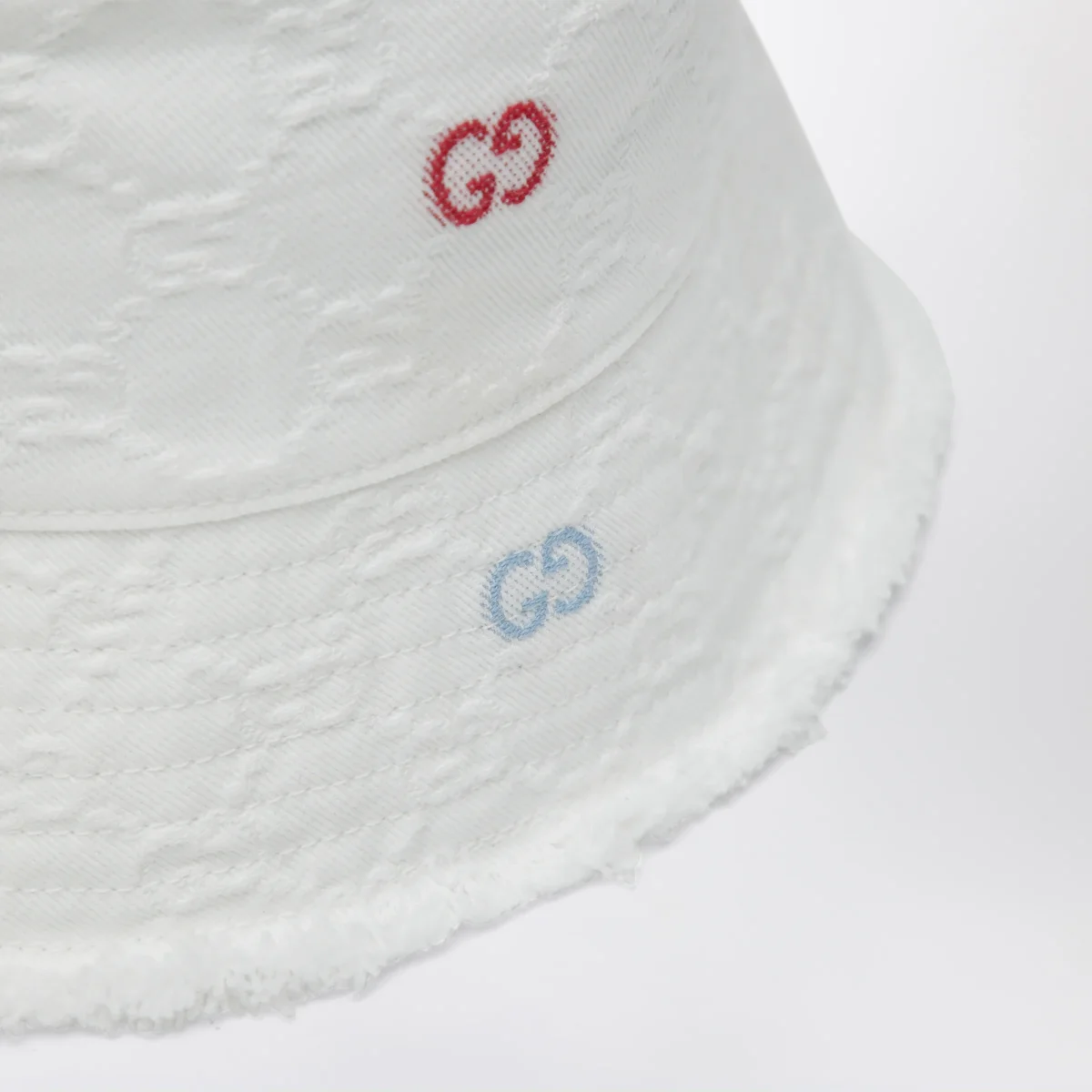 Cappello di Gucci in denim di cotone GG jacquard• Colore: Bianco• Finiture con frange• Motivo GG in fil coupé