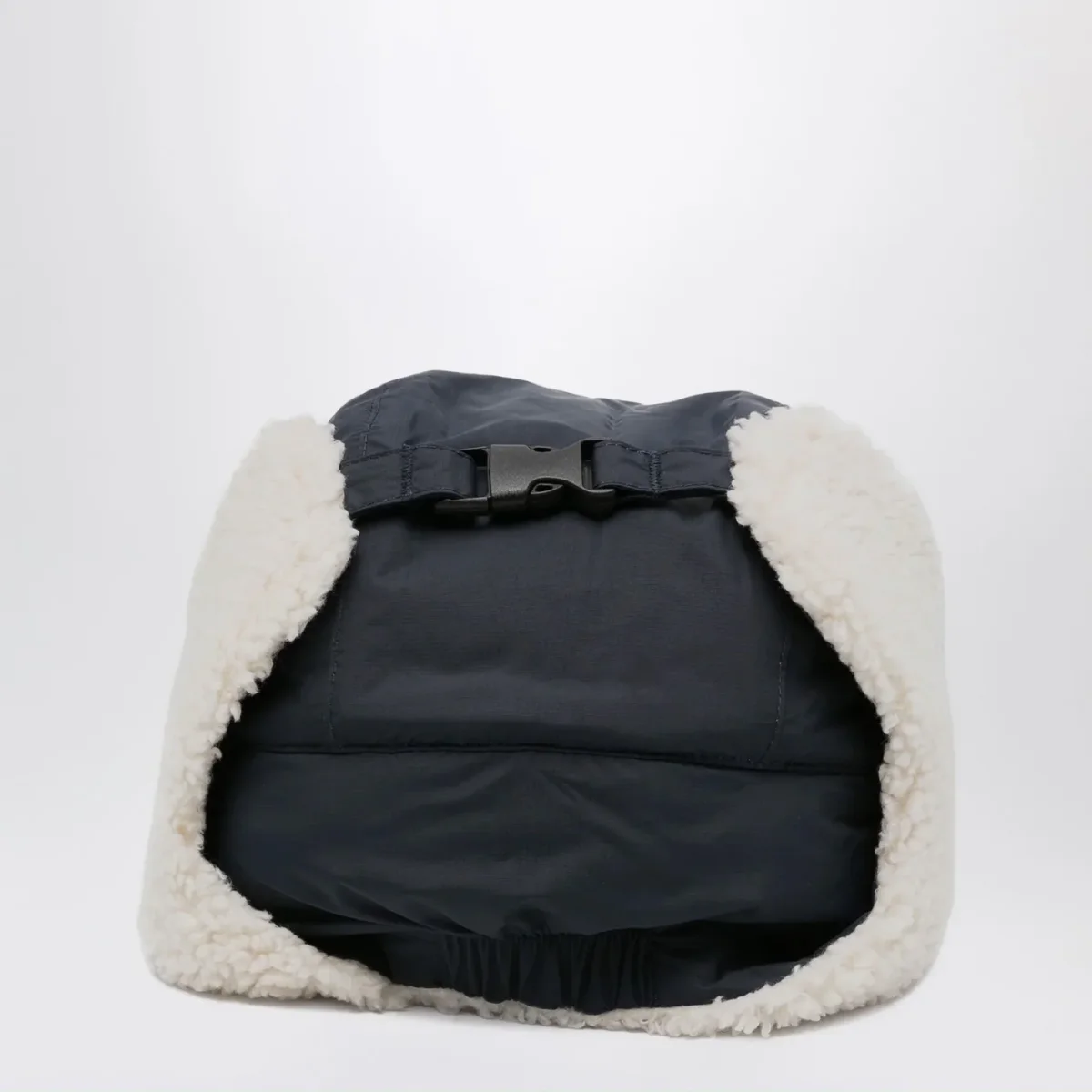 Cappello con paraorecchie di K-Way in nylon micro ripstop blu, caratterizzato da rivestimento interno in tessuto effetto sherpa a contrasto, sottogola regolabile con fibbia e logo stampato colorato sul lato.