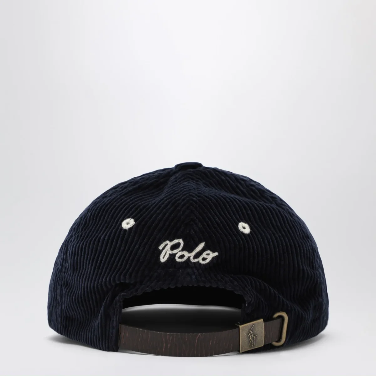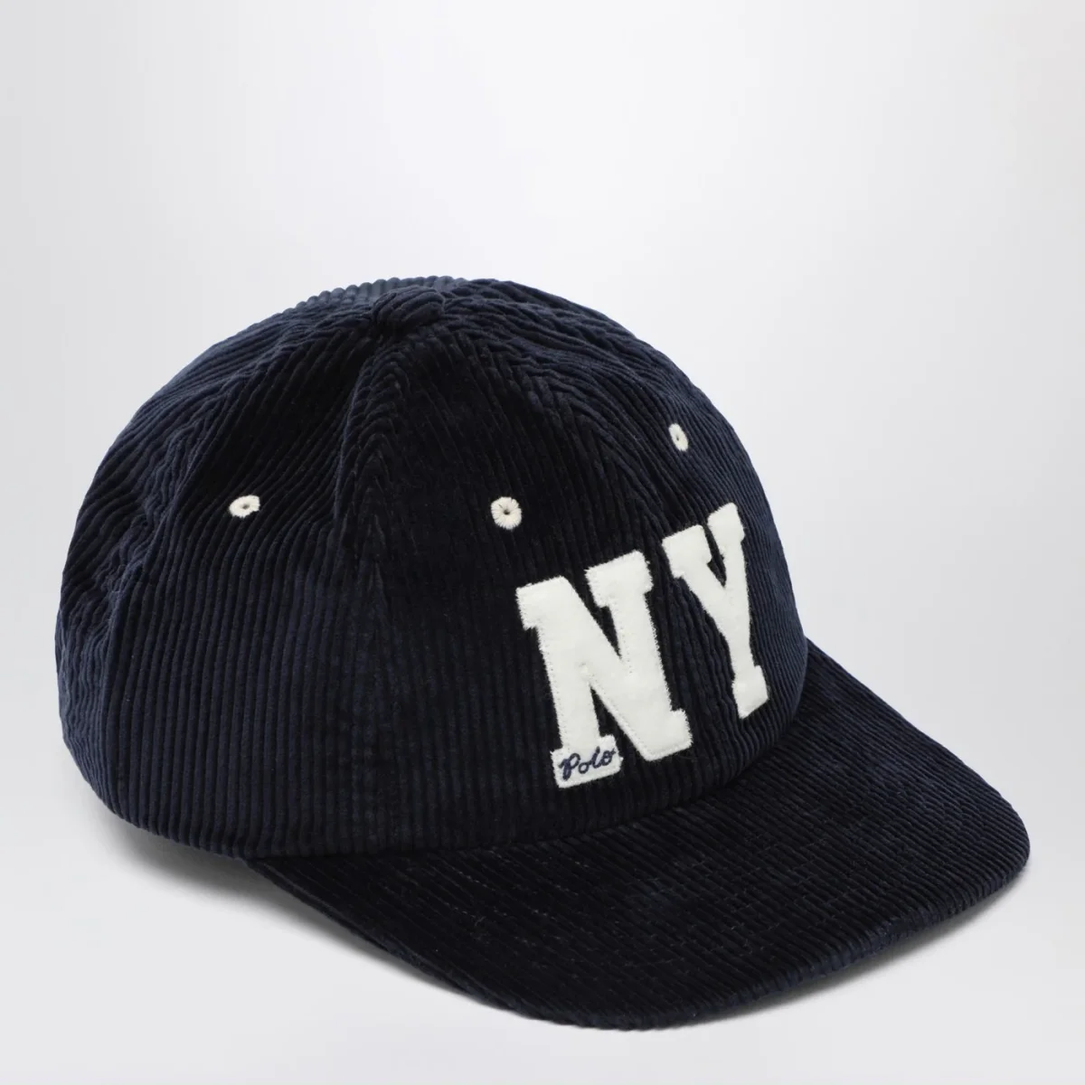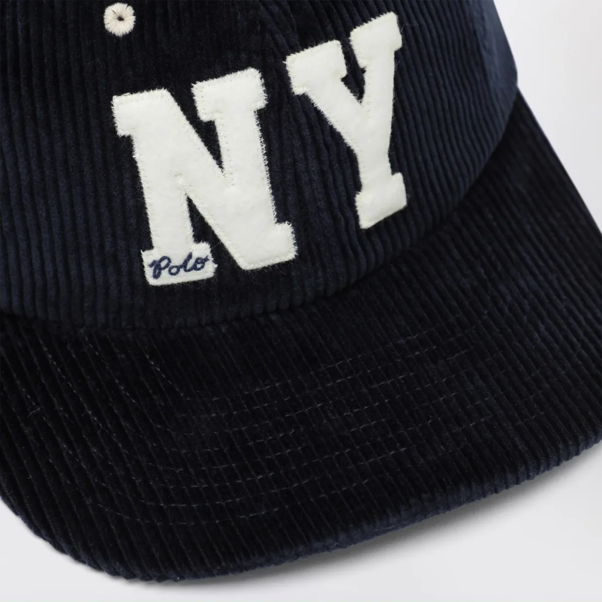 Cappello con visiera di Polo Ralph Lauren in velluto di cotone blu navy, caratterizzato da patch logo NY sul davanti a contrasto, logo lettering sul retro e misura regolabile con cinturino posteriore con logo in rilievo.