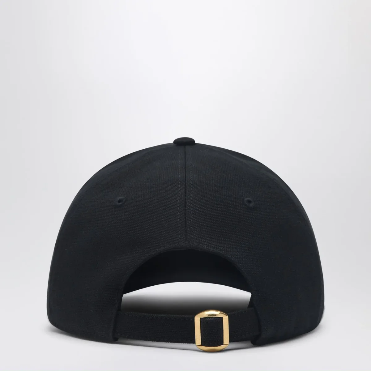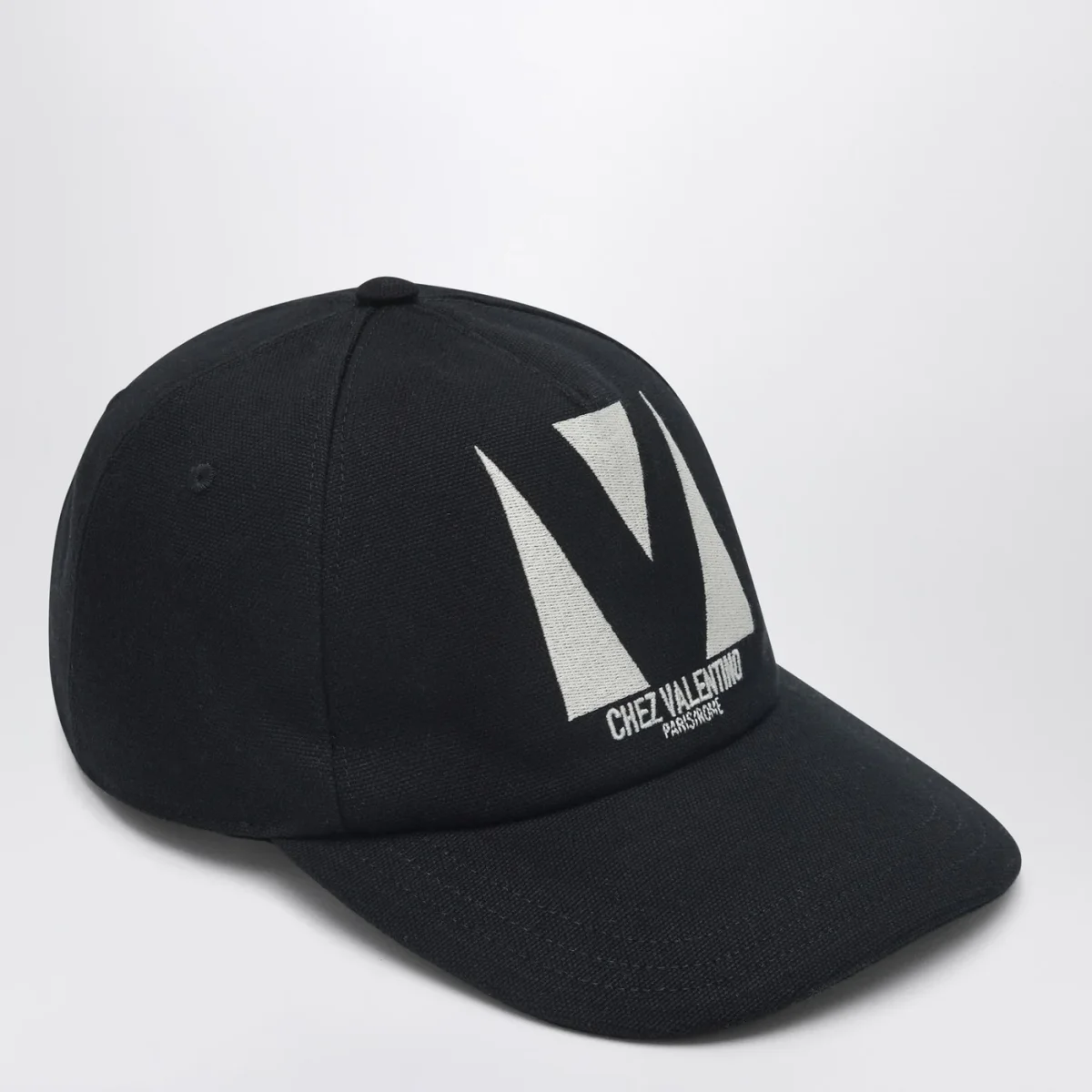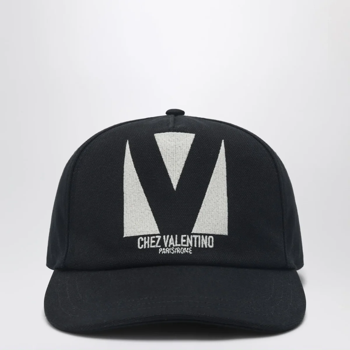 Cappello da baseball di Valentino Garavani in cotone nero, caratterizzato da ricamo Chez Valentino frontale, ricamo Paris/Rome sul retro e cinturino regolabile posteriore.