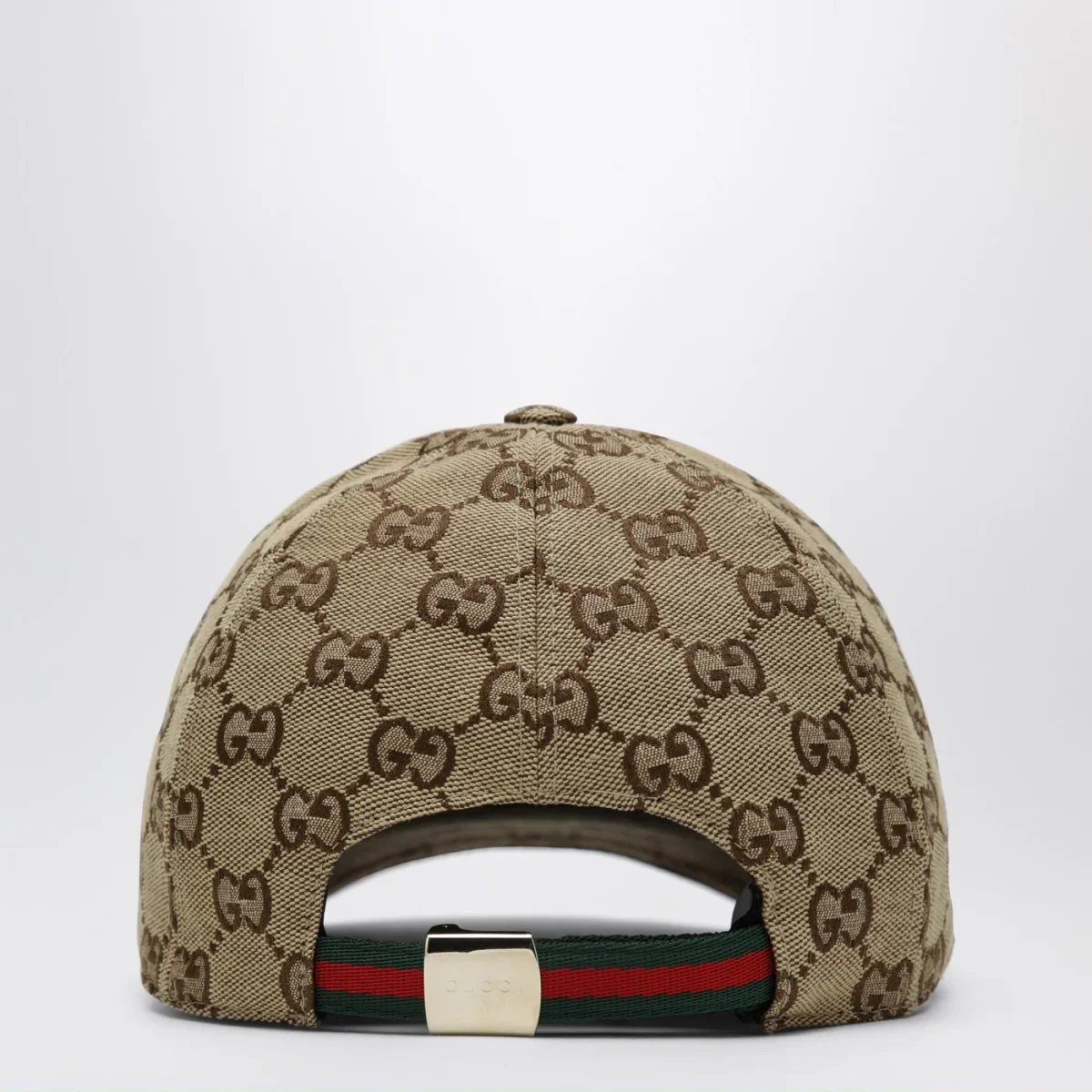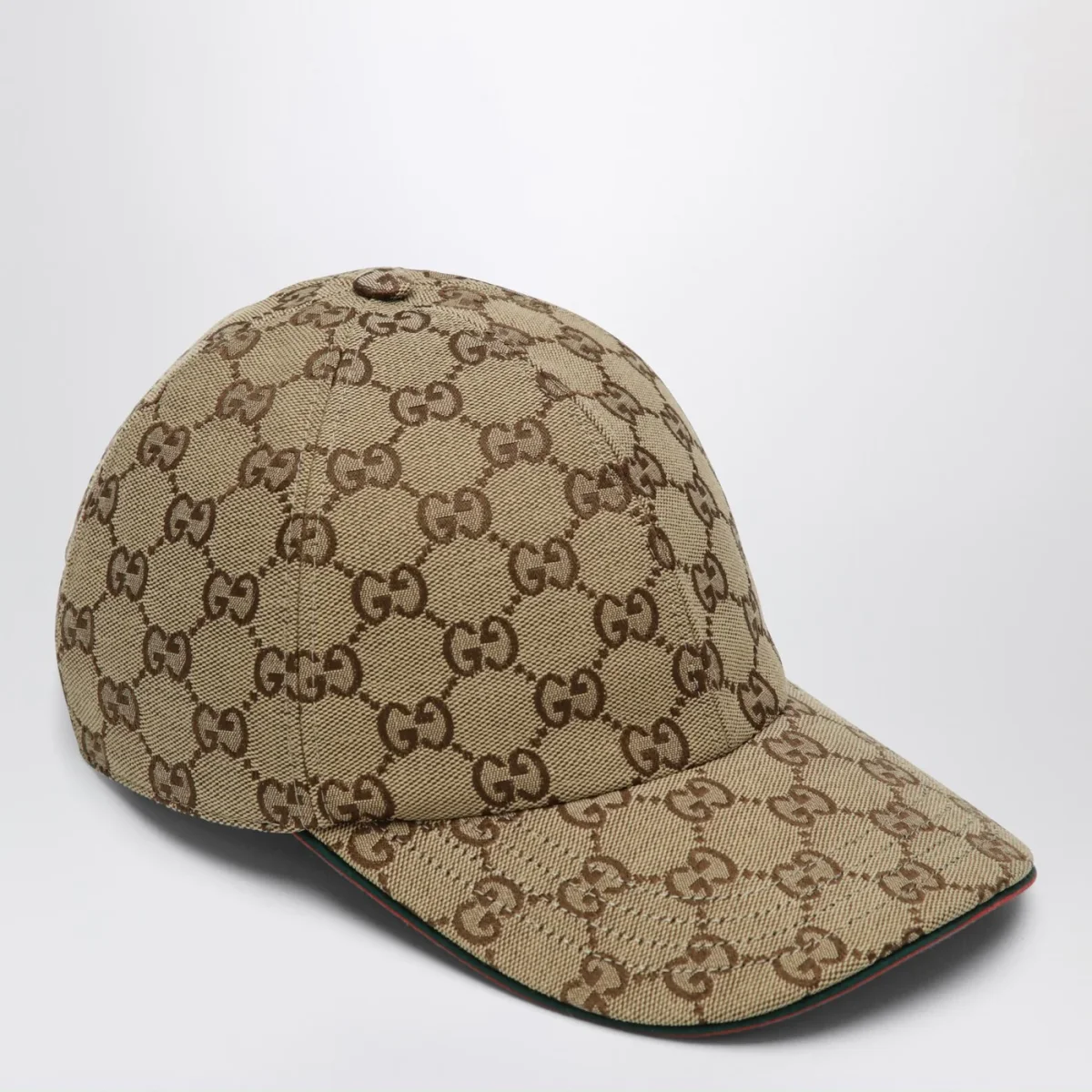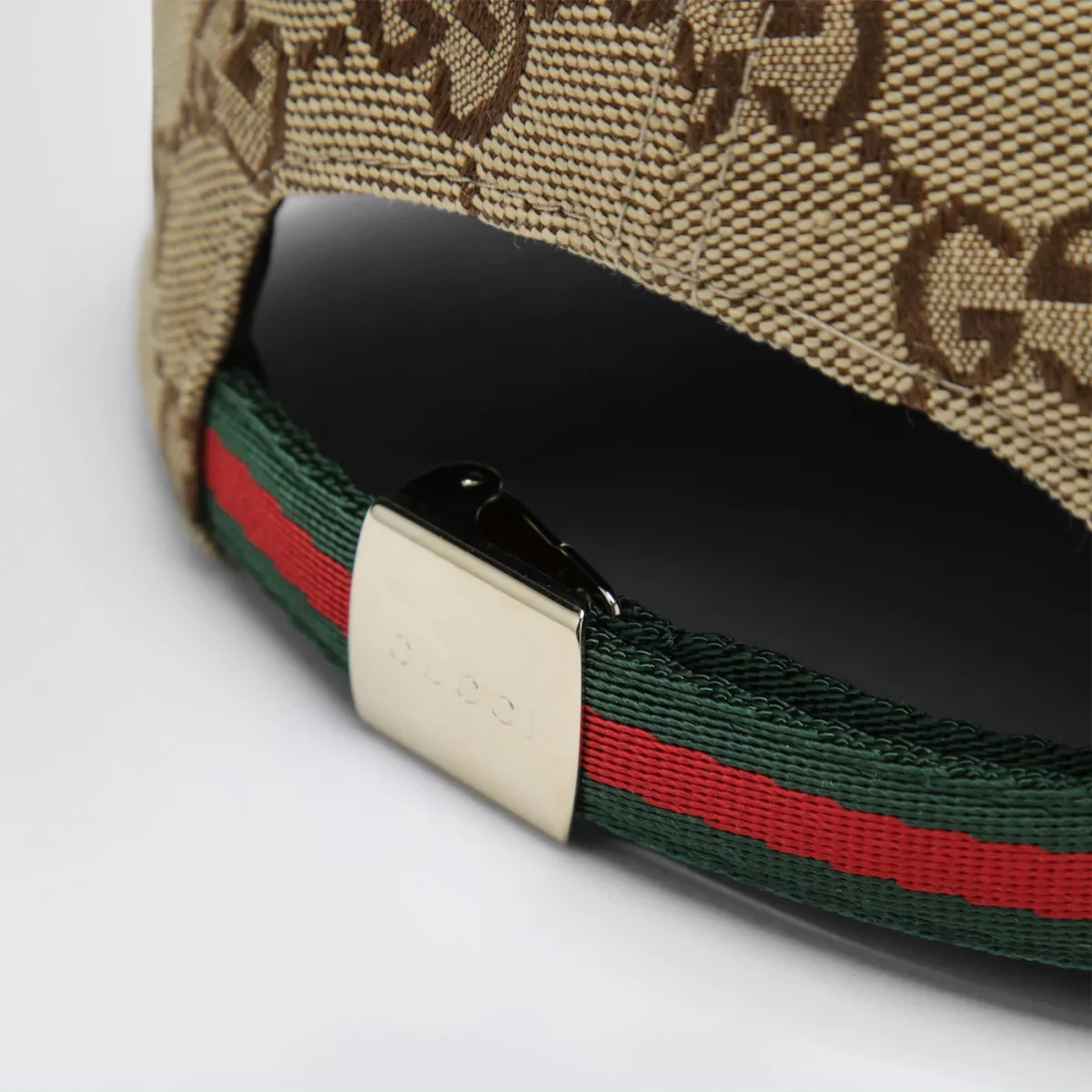 Cappello di Gucci in tessuto GG di misto cotone beige• Marrone scuro• Visiera con bordo con finiture con motivo Web verde/rosso/verde• Chiusura regolabile con motivo Web• Fibbia con logo lettering inciso