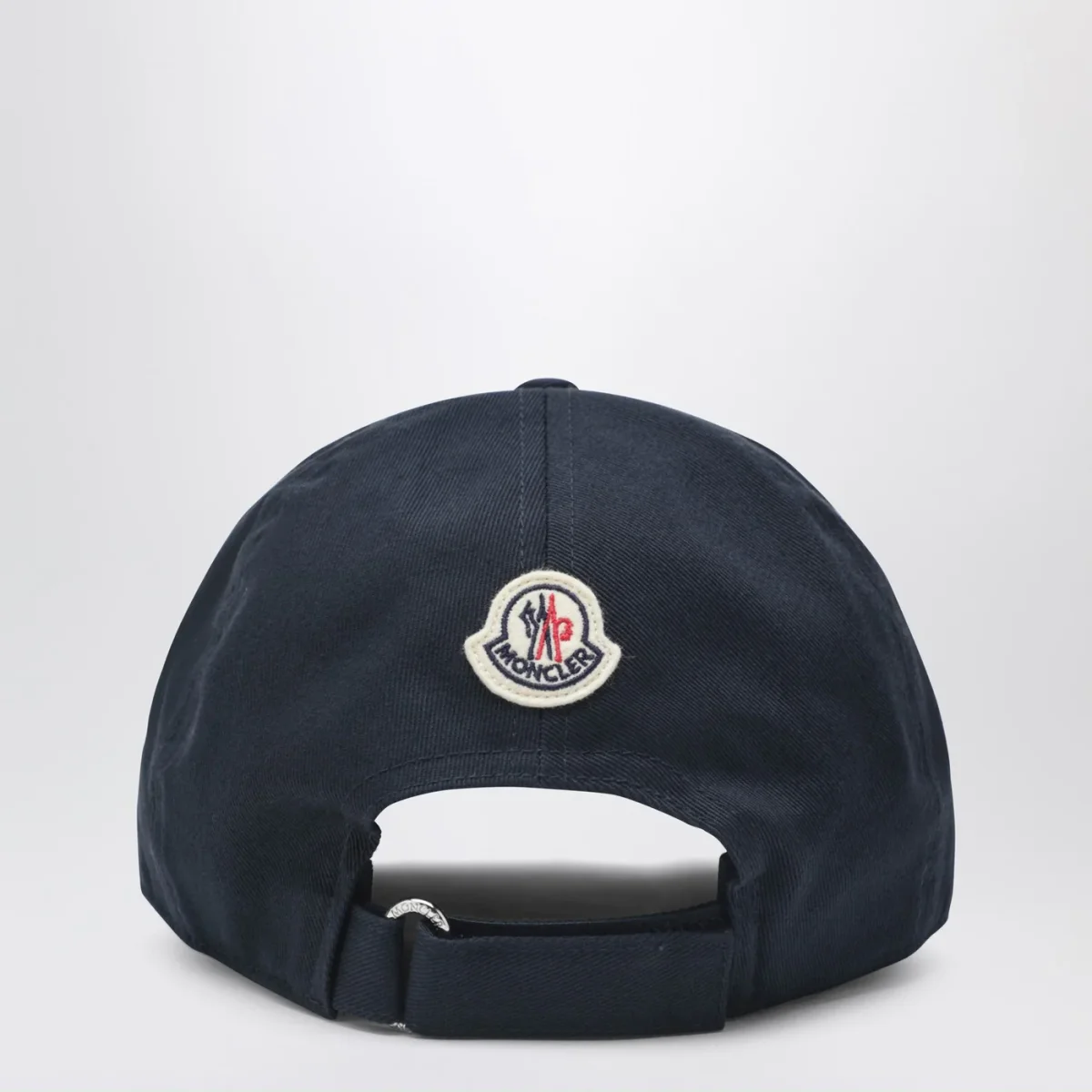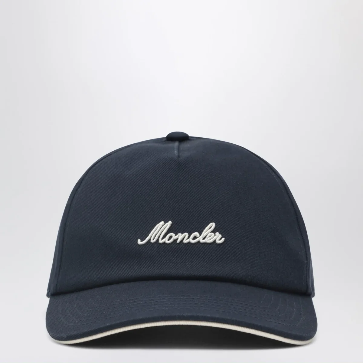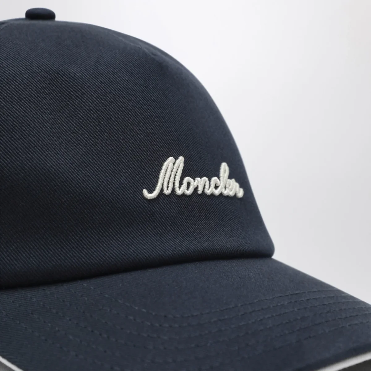 Cappello con visiera di Moncler in cotone blu navy• profili bianchi a contrasto• ricamo logo frontale• cinturino regolabile sul retro
