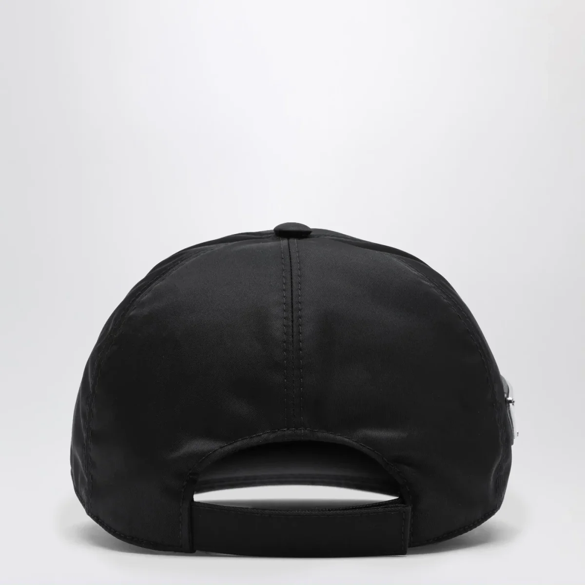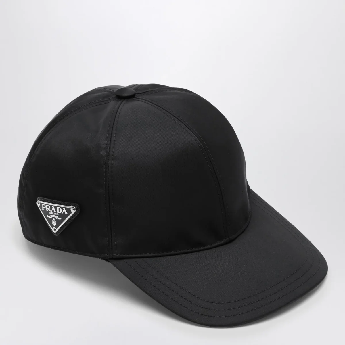 Cappello con visiera di Prada in Re-nylon nero, caratterizzato da chiusura regolabile a strappo sul retro, interno foderato in cotone e logo triangolo in metallo smaltato sul lato.