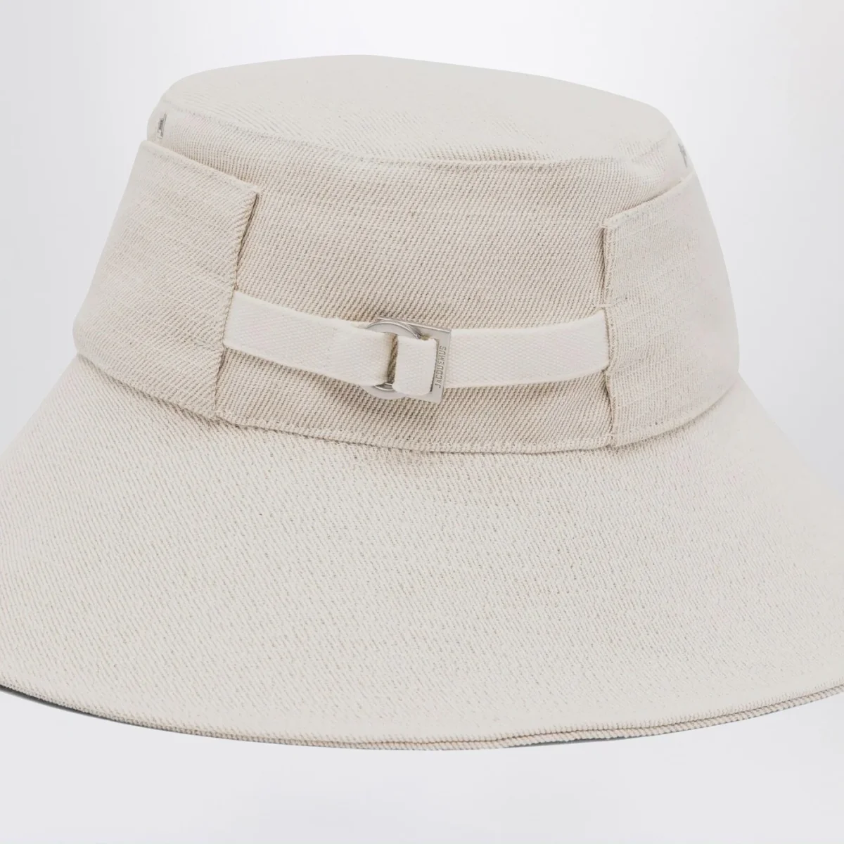 Cappello da pescatore di Jacquemus in canvas bianco• cinturino lungo e regolabile• visiera impunturata• bottoni automatici laterali• occhielli di ventilazione a forma di cerchio e quadrato• coulisse a cerchio• quadrato sul retro• logo in metallo argentato