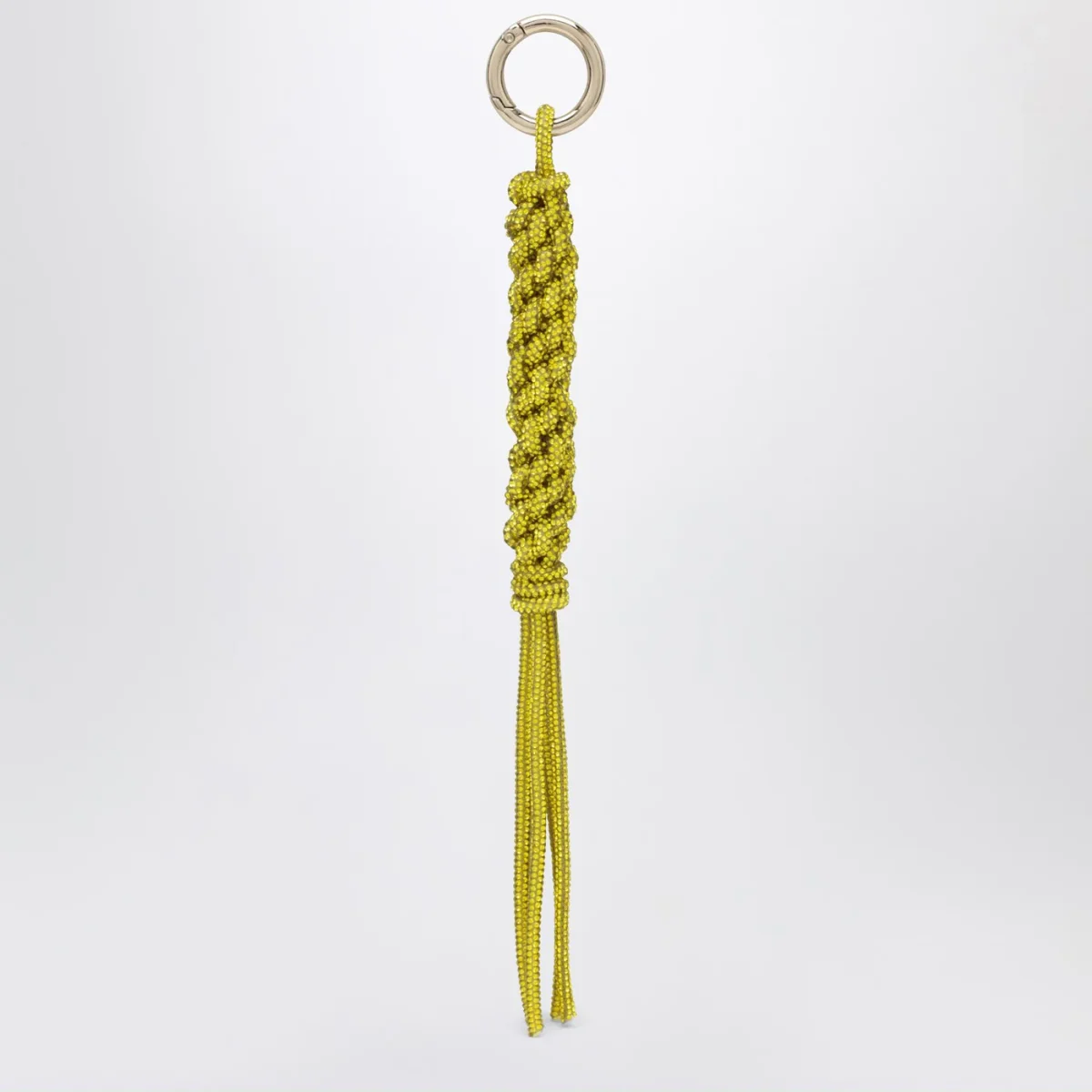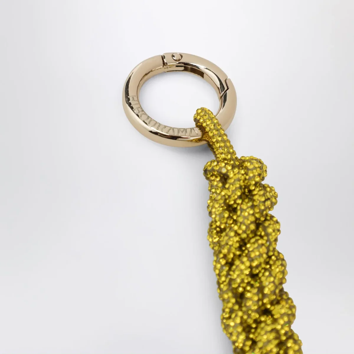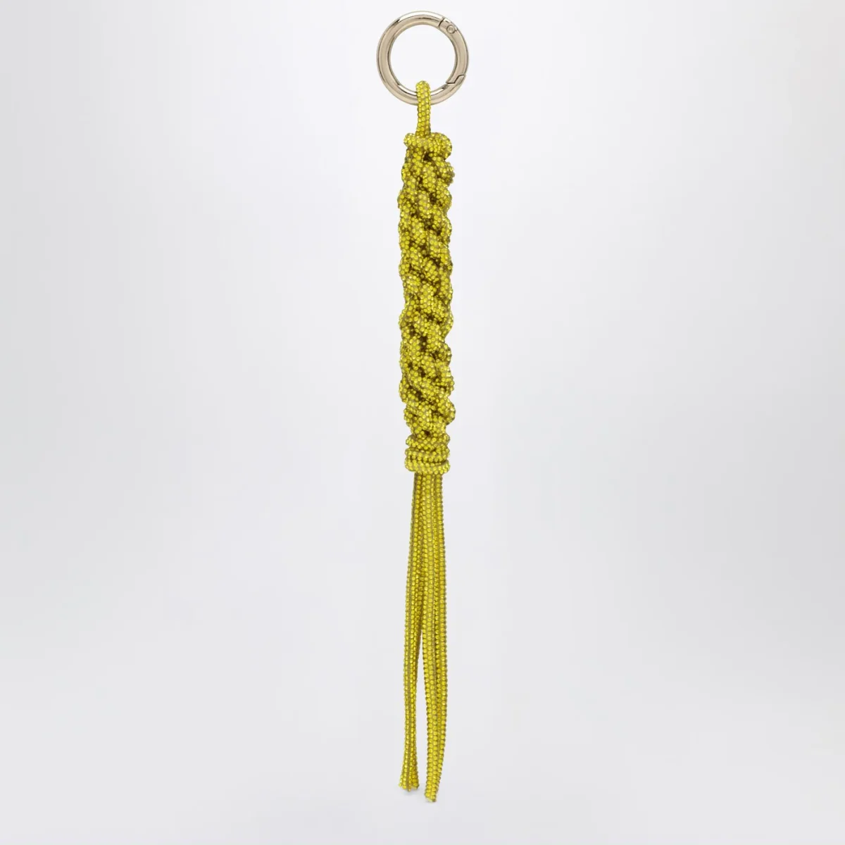 Charm di Hibourama con ciondolo intrecciato a mano ricoperto di cristalli gialli e moschettone ad anello in metallo.
