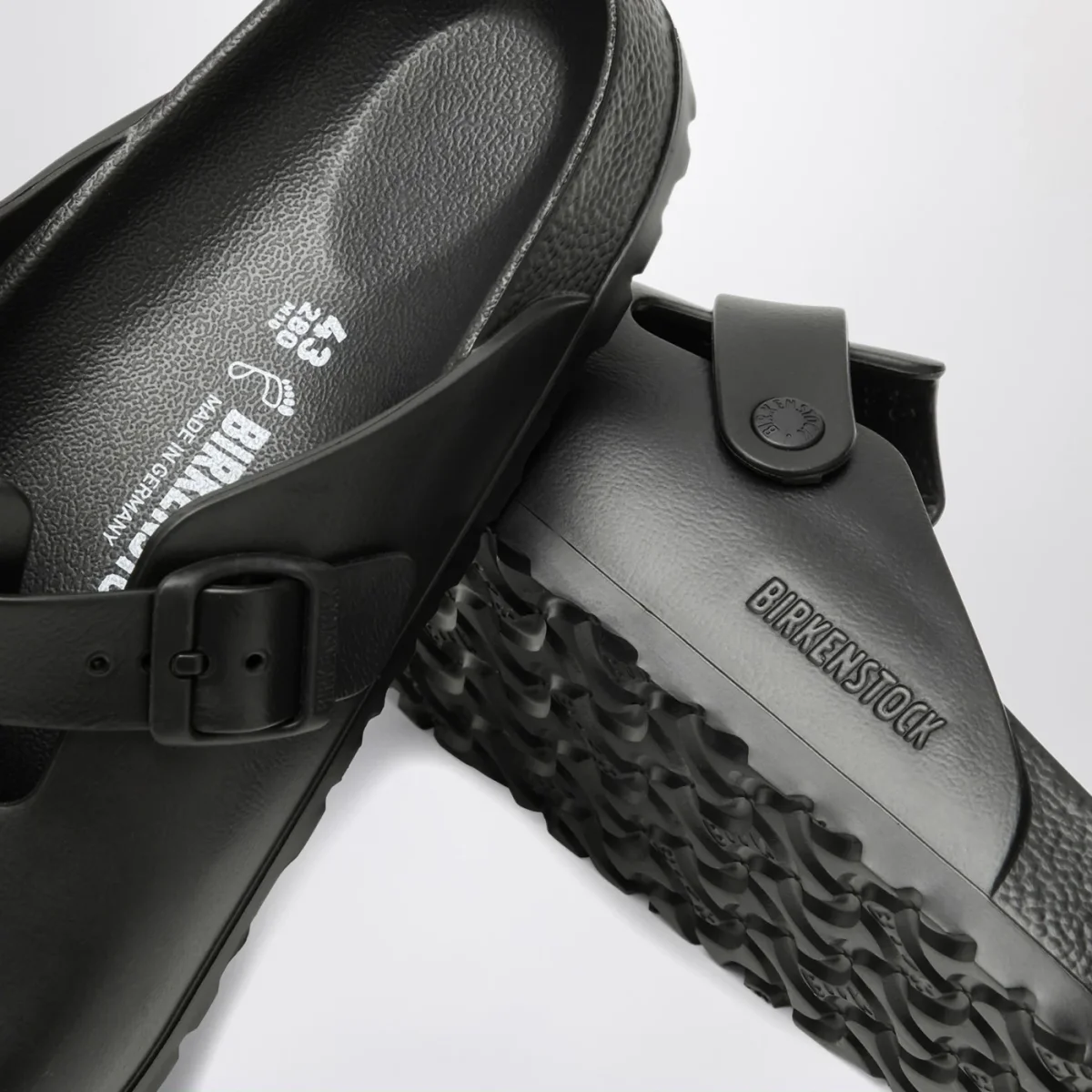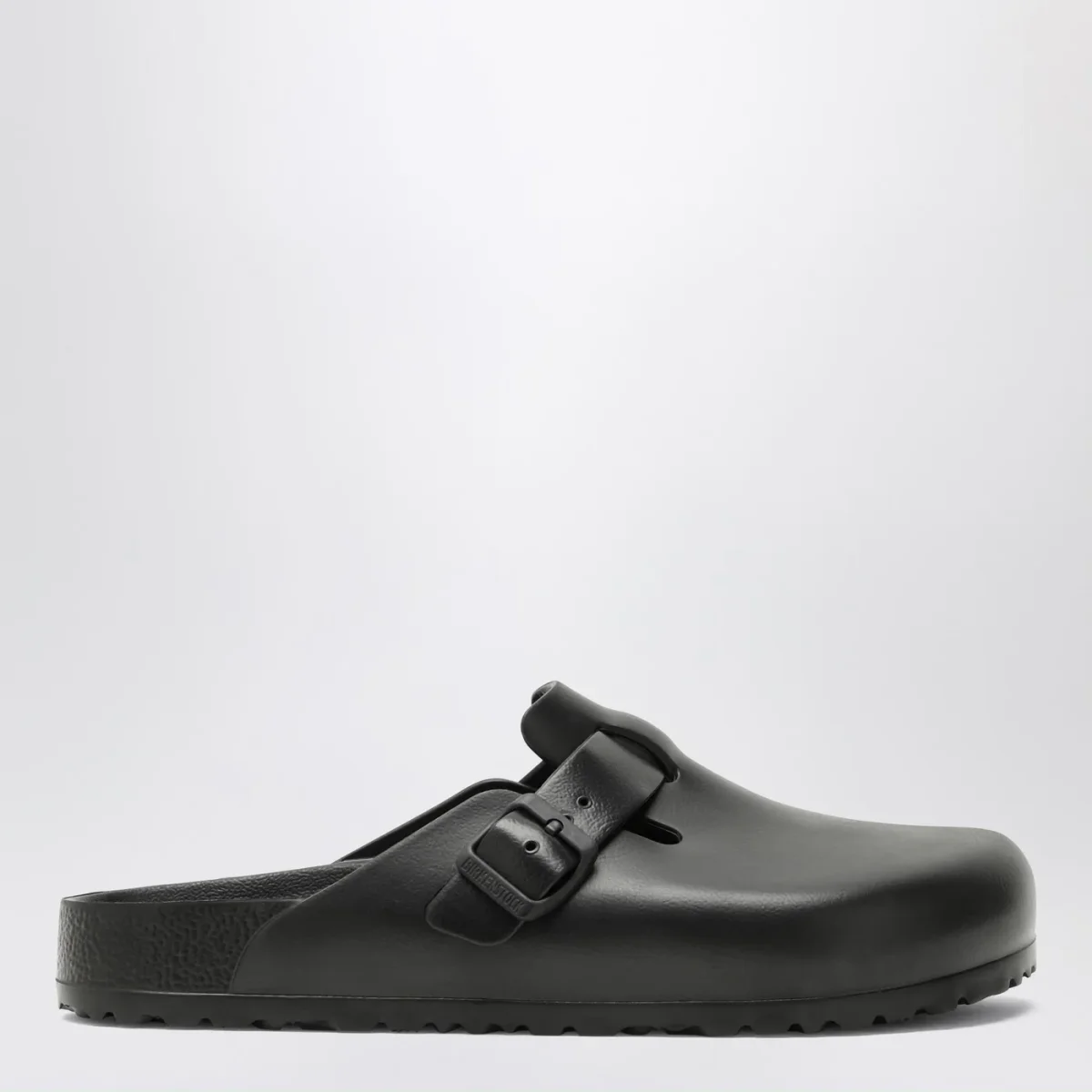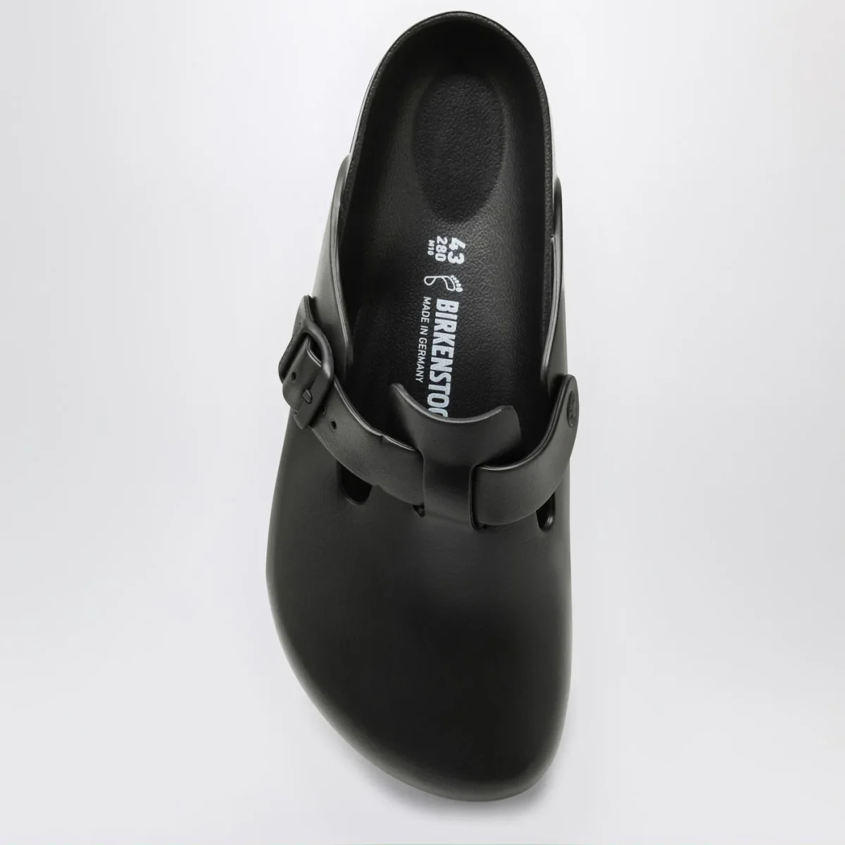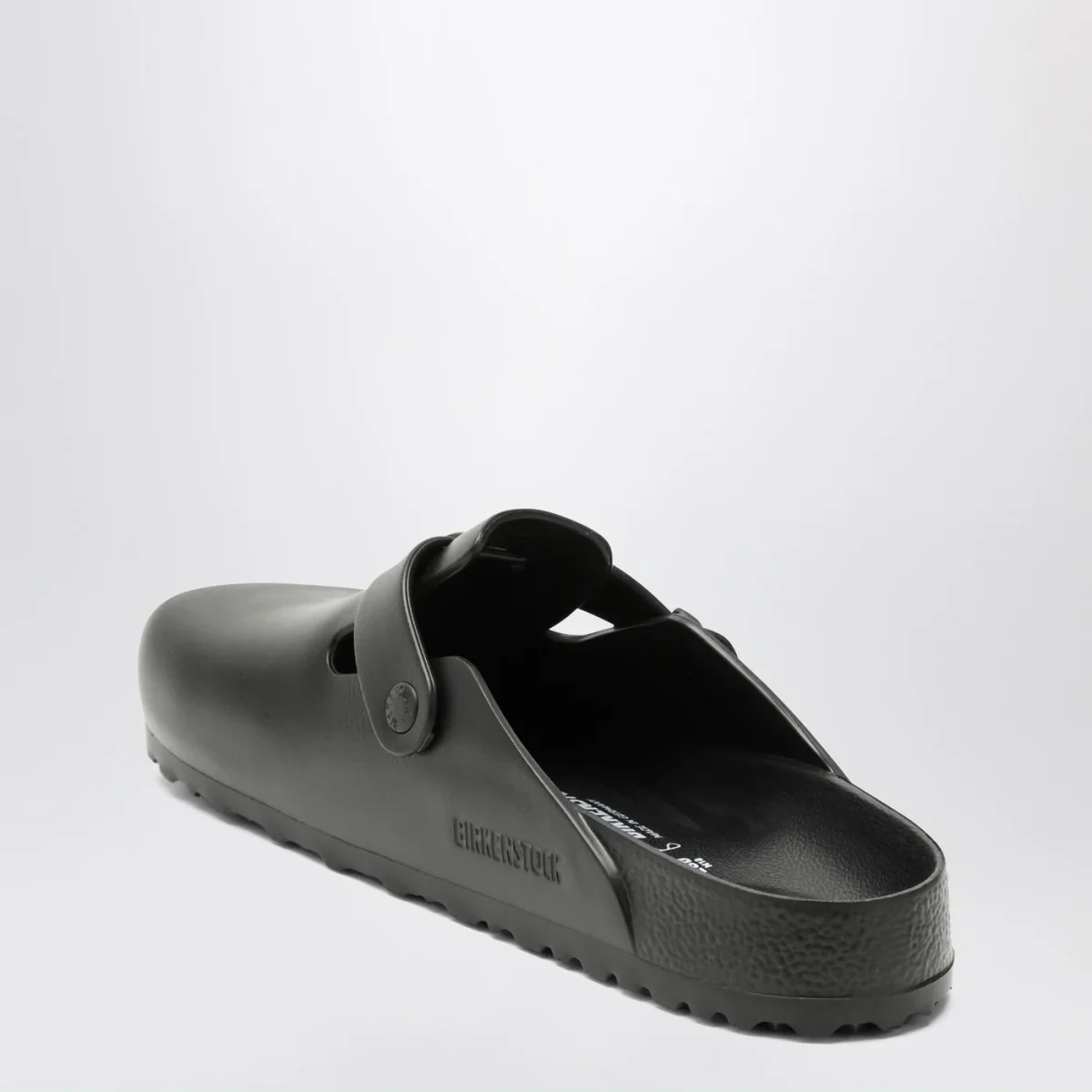 Ciabatta di Birkenstock in gomma eva nera• Punta tonda• Cinturino con fibbia regolabile• Plantare dalla forma anatomica• Calzata normale• Suola in gomma eva