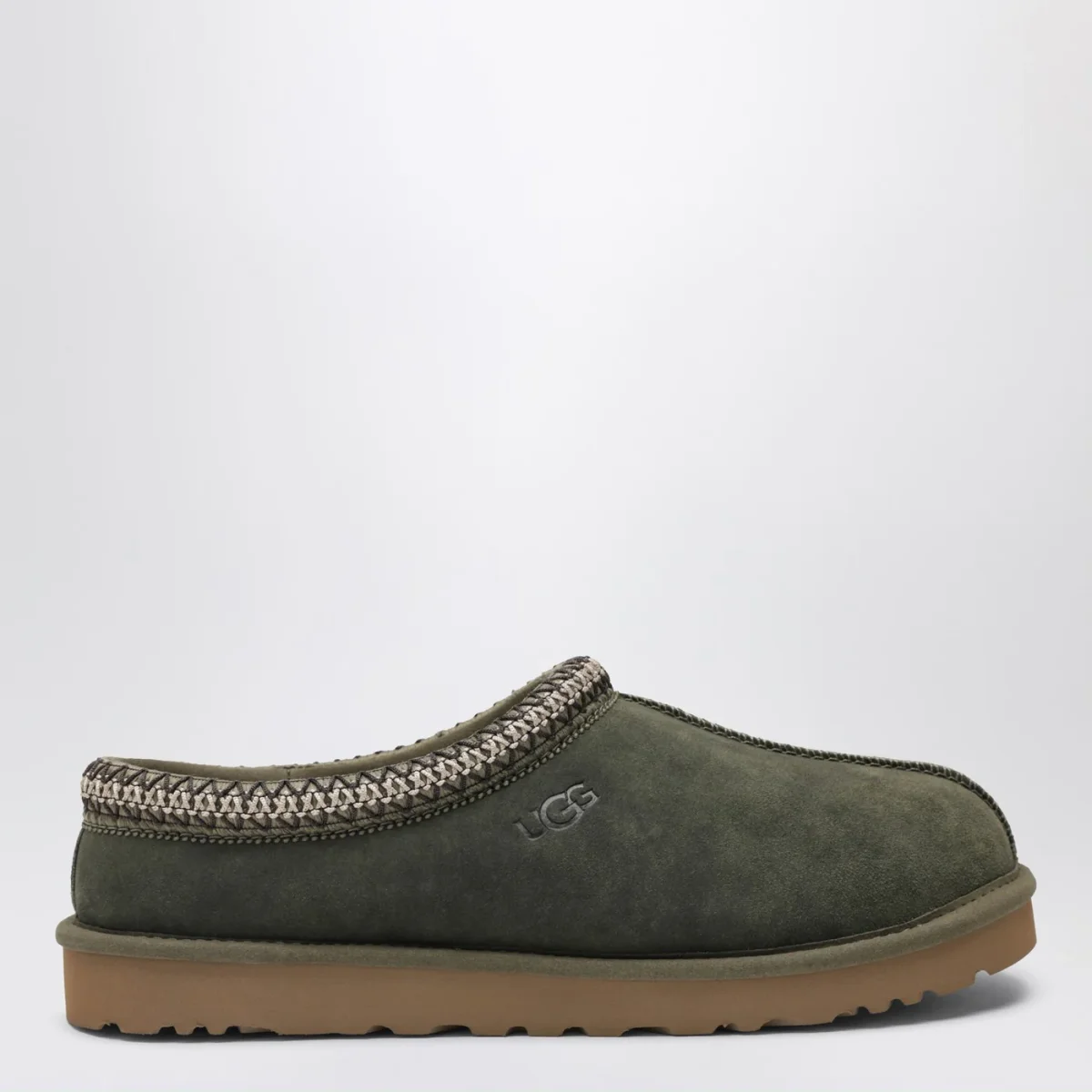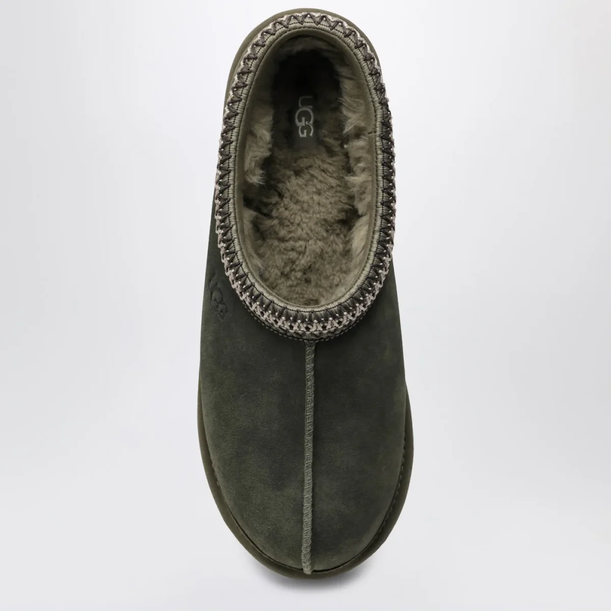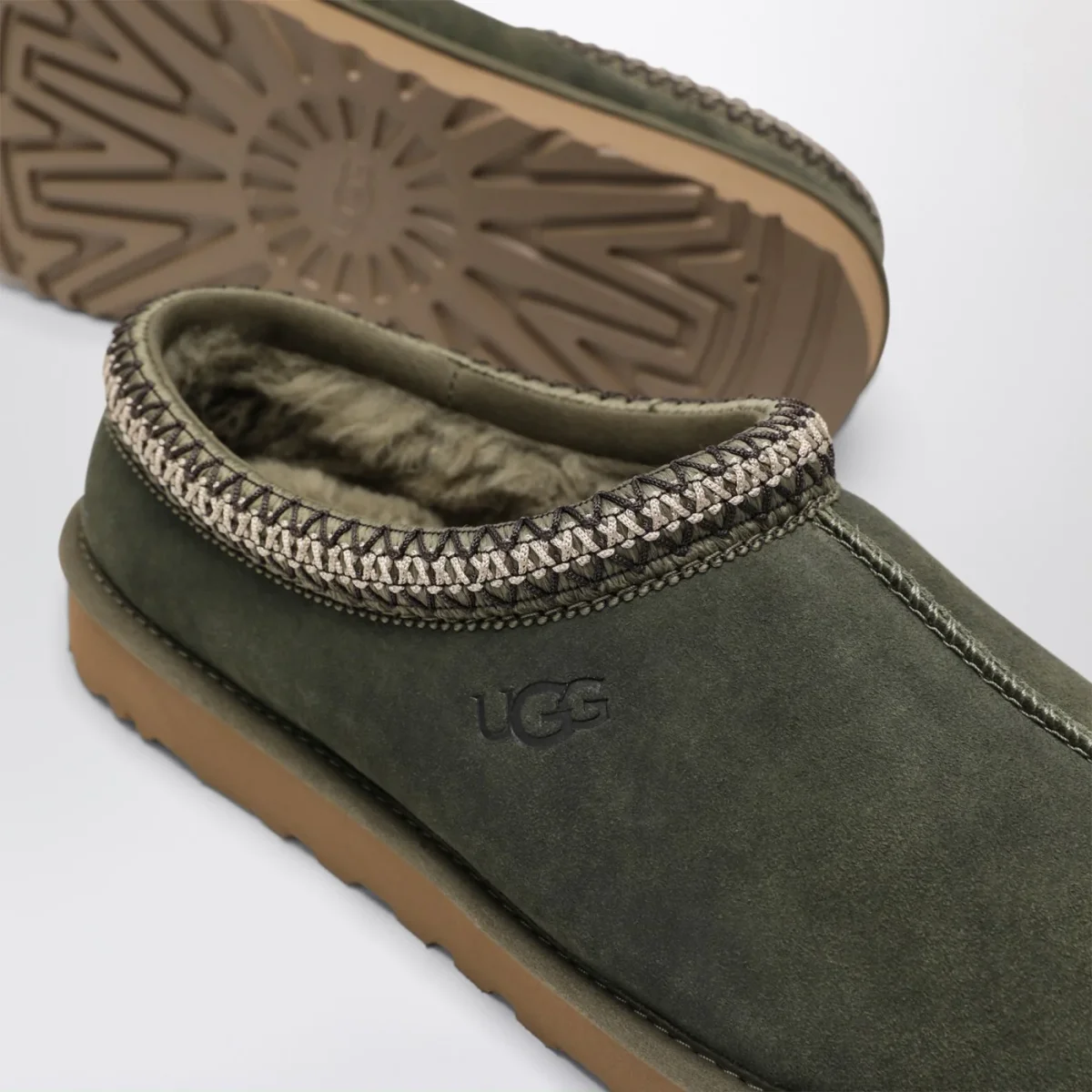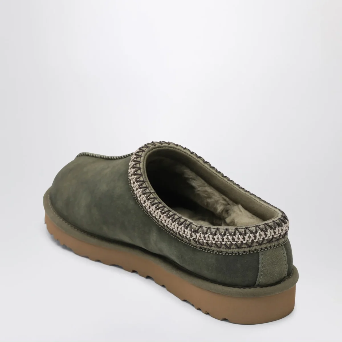 Ciabatta di UGG in camoscio color verde oliva, caratterizzata da fodera in montone, punta tonda, ricamo azzurro sul bordo e suola in gomma.