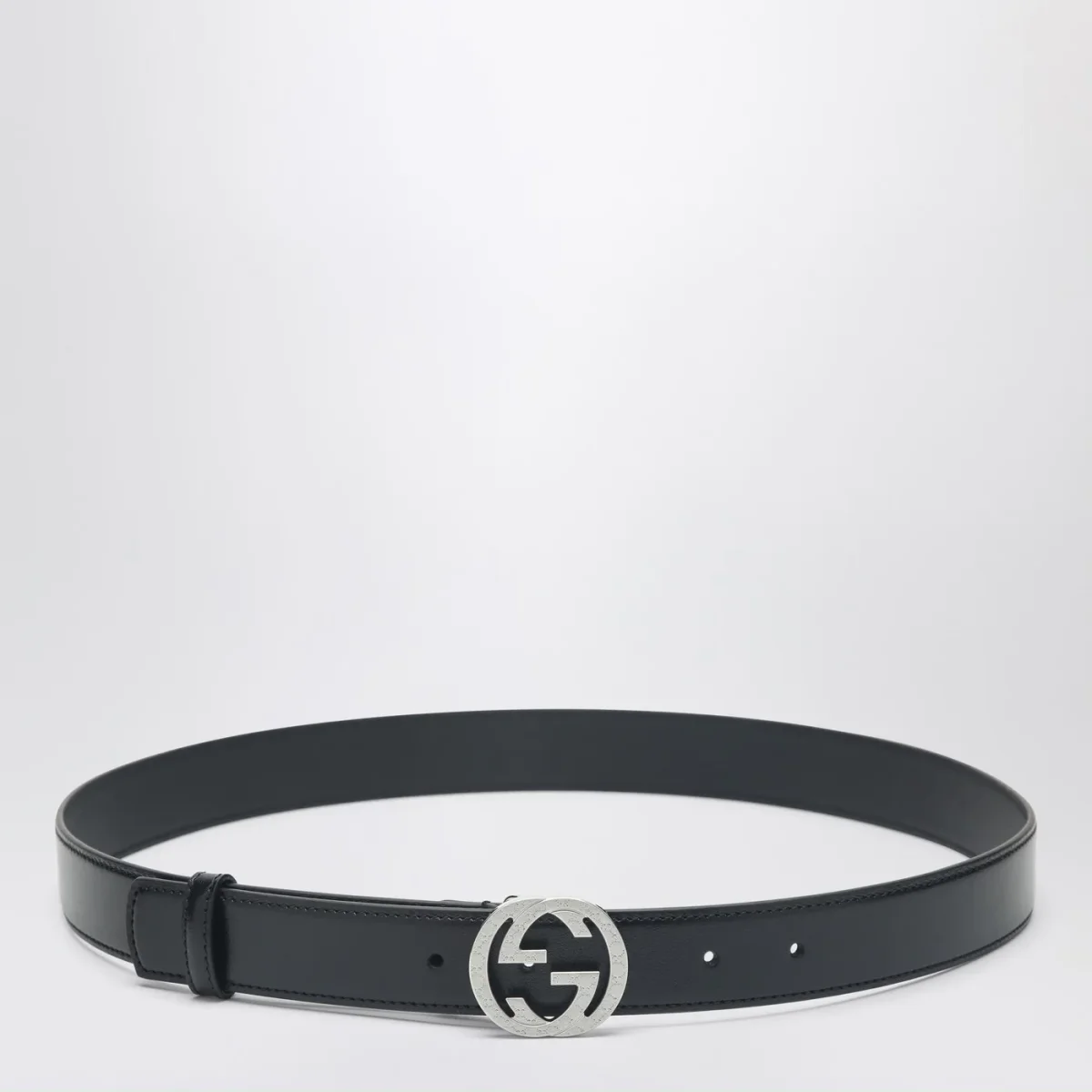 Cintura di Gucci in pelle nera, caratterizzata da fibbia Incrocio GG con incisione GG in metallo color argento.