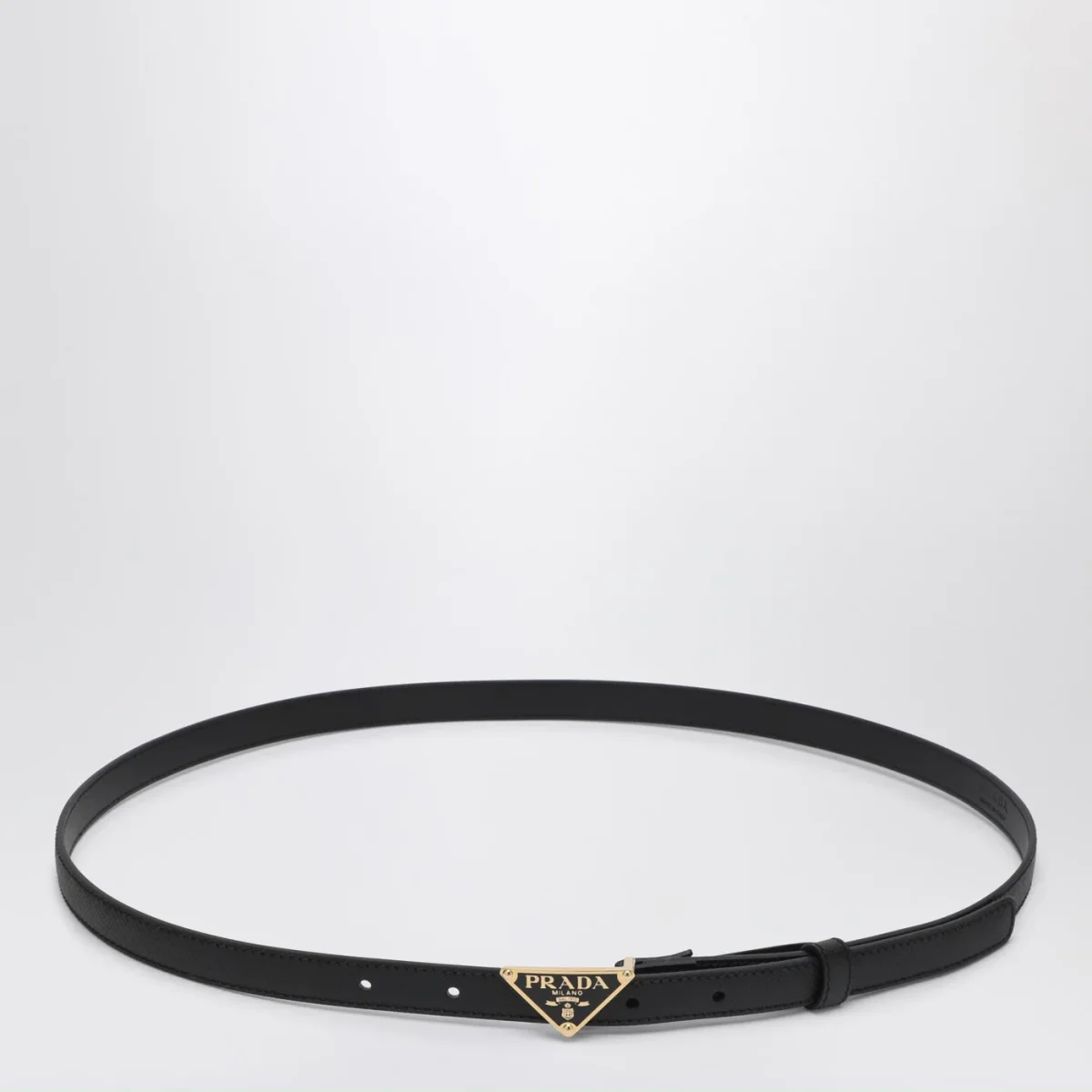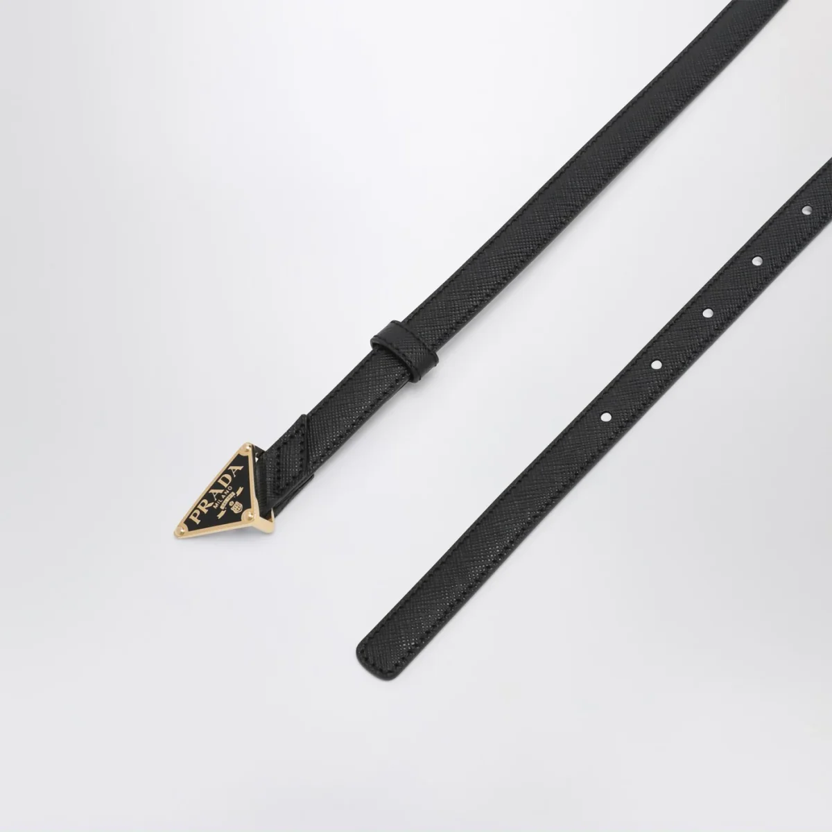 Cintura di Prada in pelle Saffiano nera, caratterizzata da chiusura regolabile con fibbia triangolo in metallo con logo lettering e finiture di colore oro.