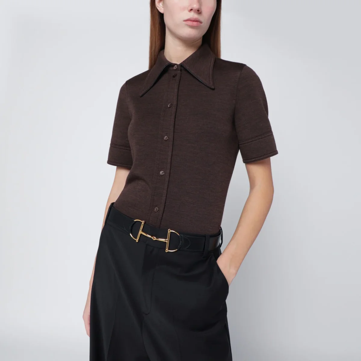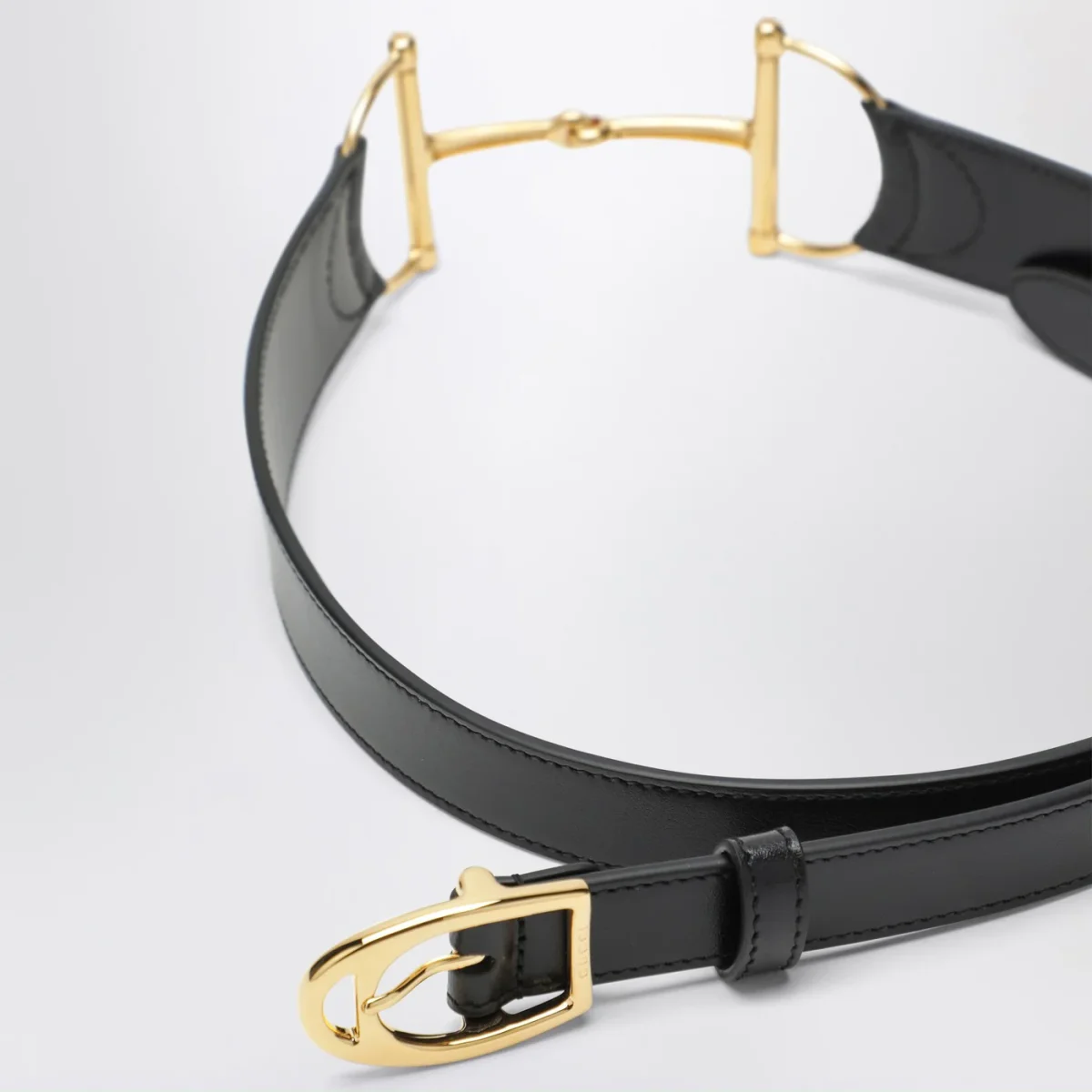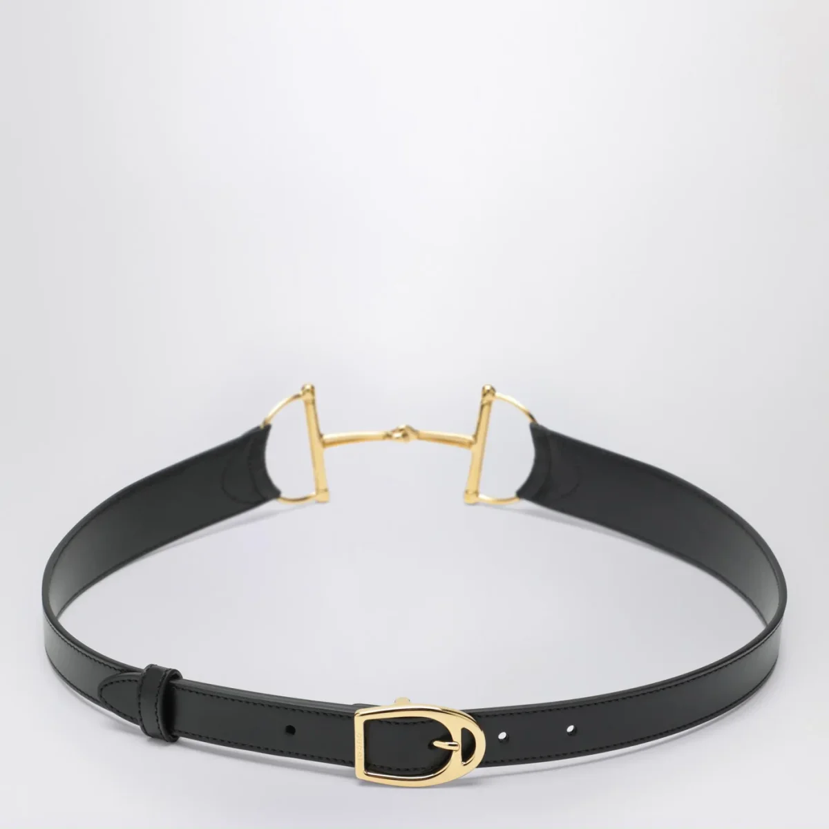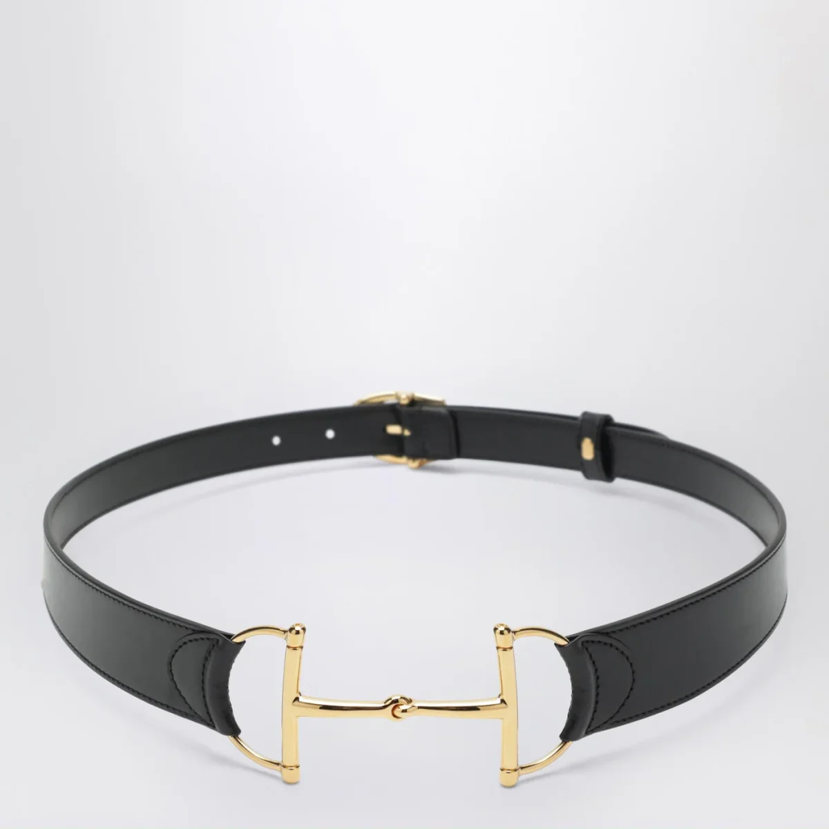 Cintura di Gucci in pelle nera, caratterizzata da chiusura con fibbia e Morsetto oversize in metallo color oro.