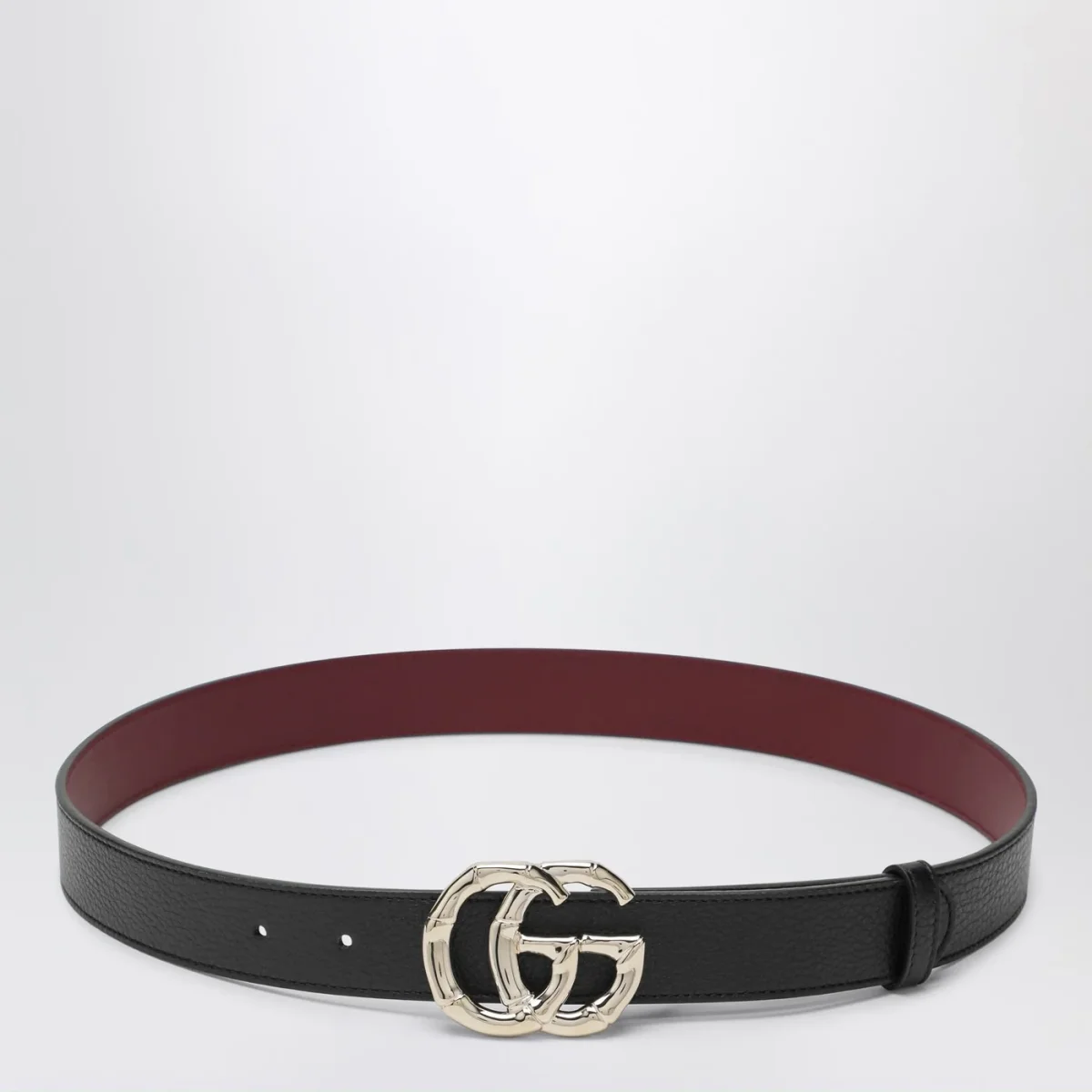 Cintura di Gucci in pelle granata nera, caratterizzata da misura regolabile, fibbia GG a forma di bambù in metallo, passante e interno bordeaux a contrasto.