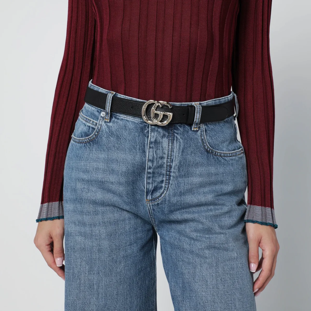 Cintura nera in pelle con fibbia GG Marmont bambù