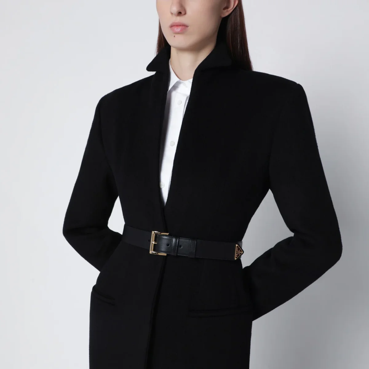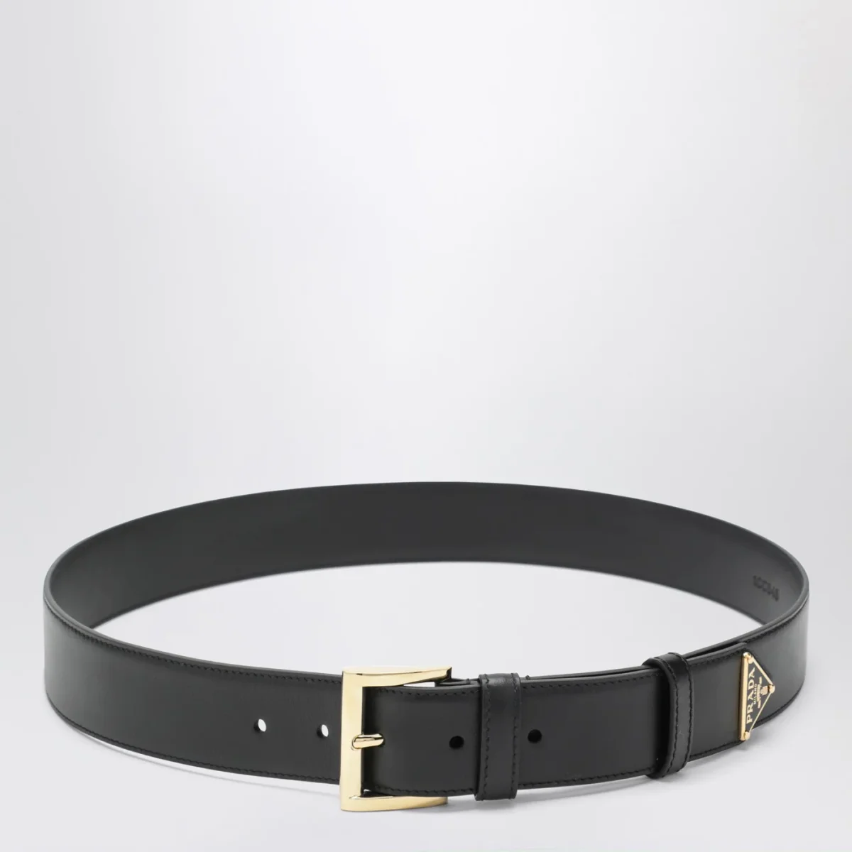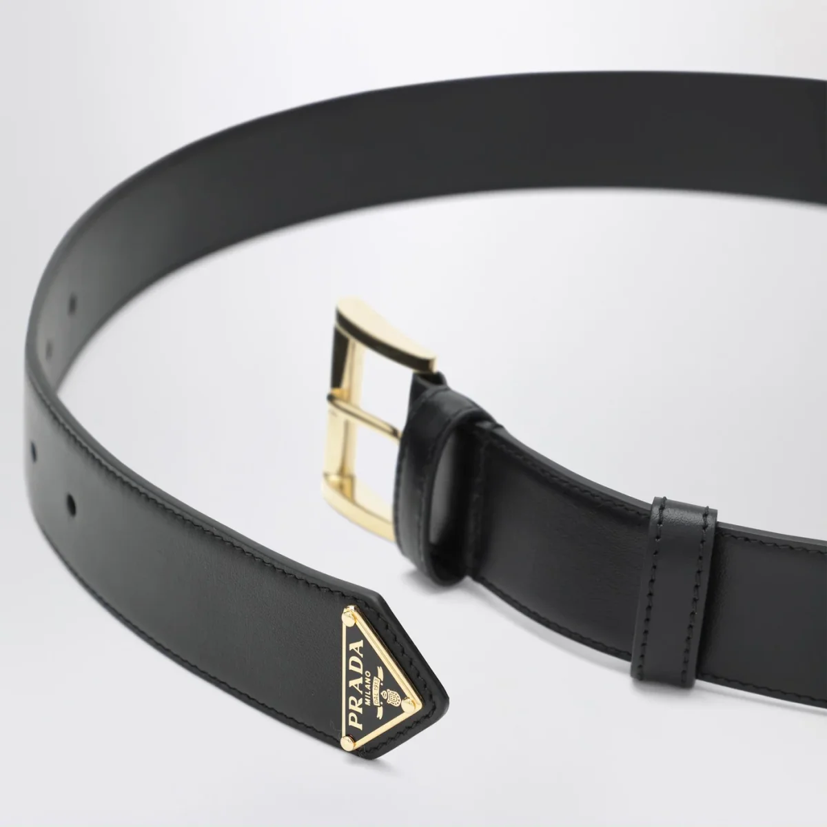 Cintura di Prada in pelle nera• misura regolabile con fibbia in metallo• doppio passante• triangolo logo in metallo smaltato• hardware color oro