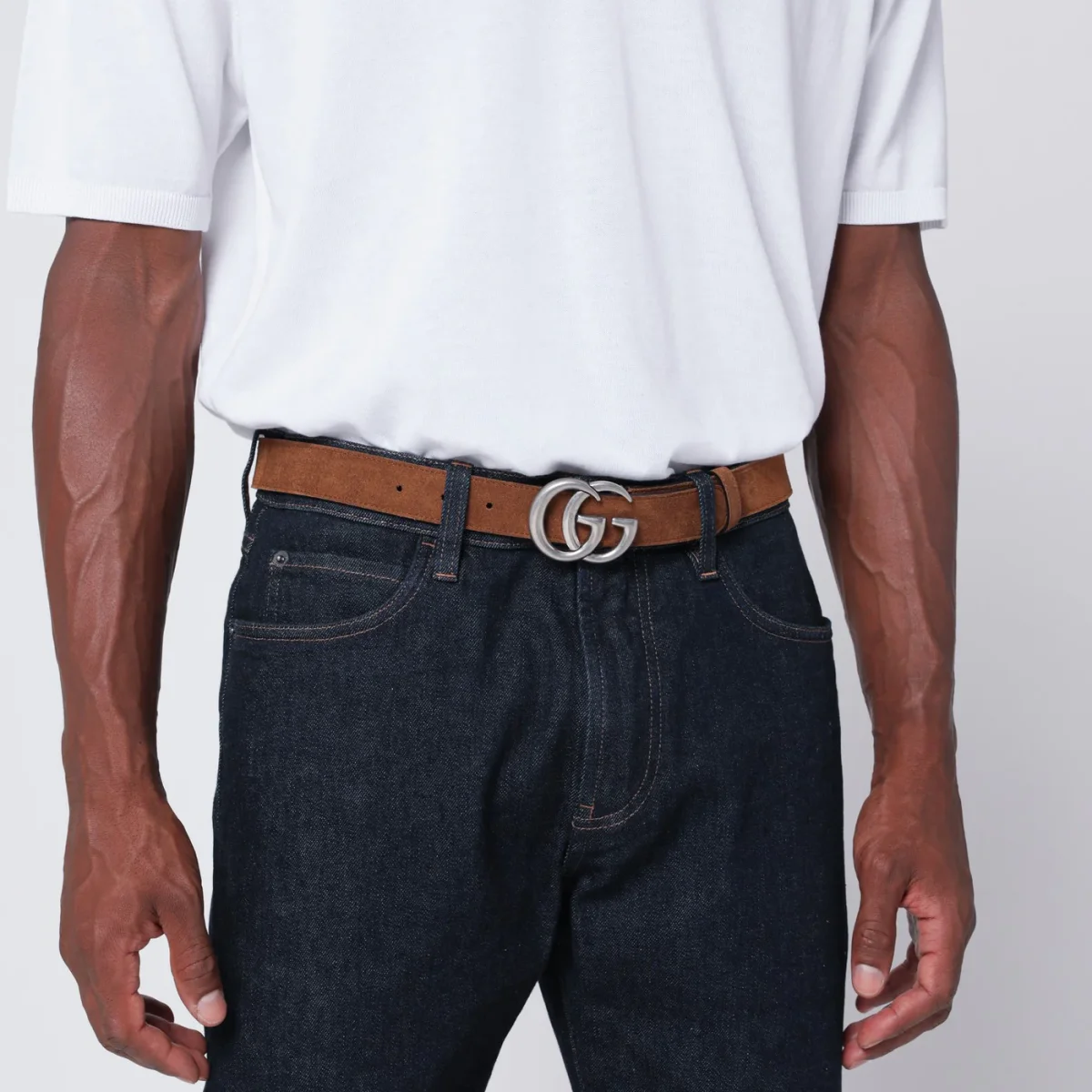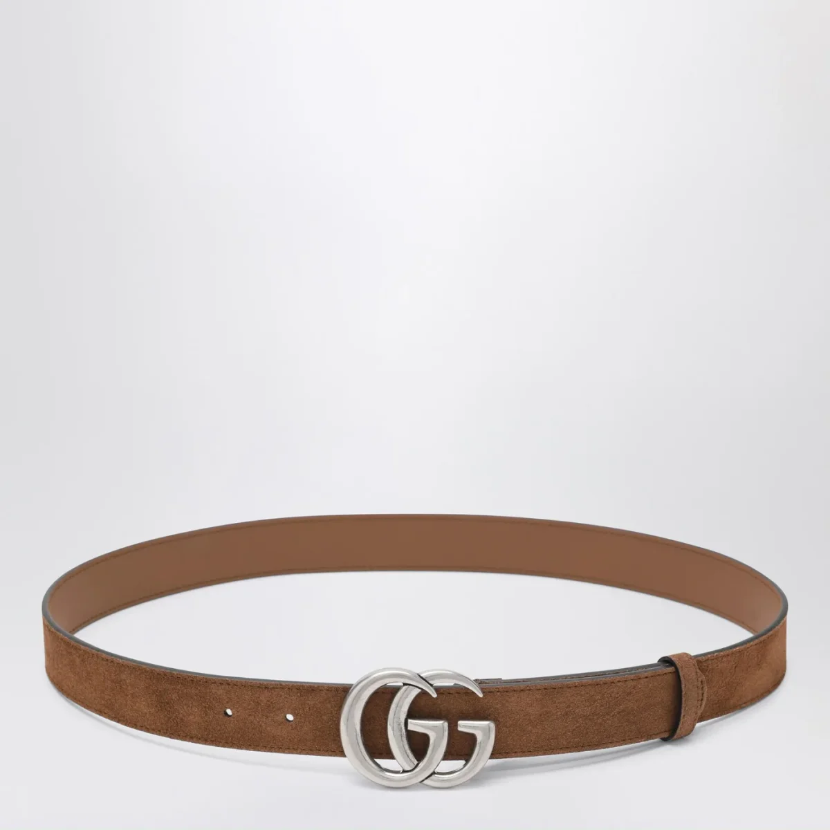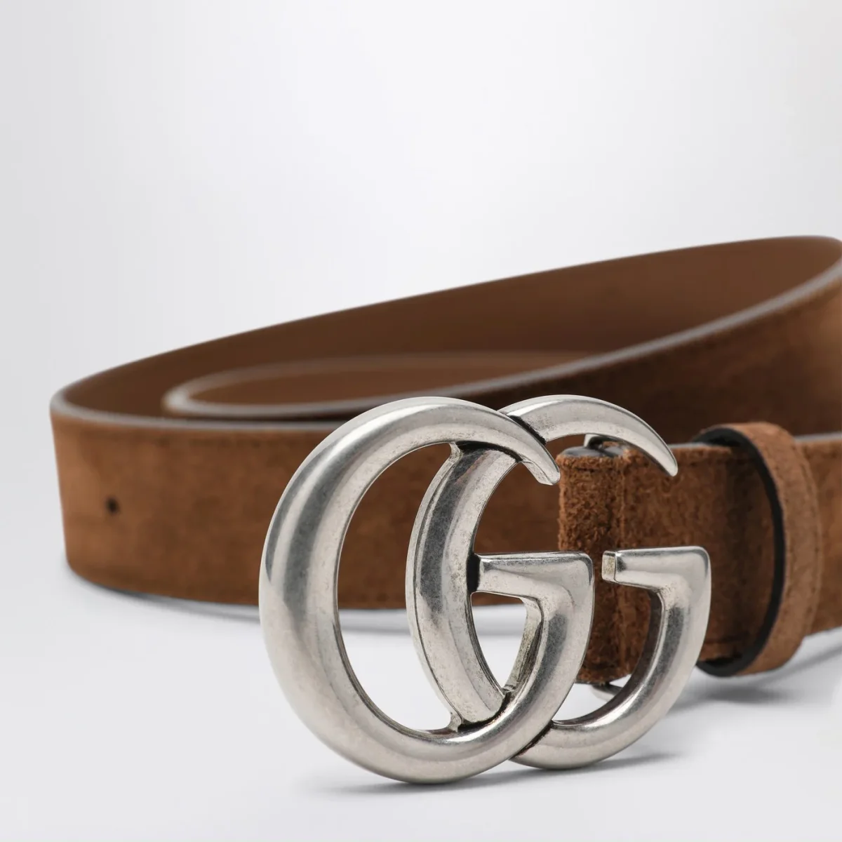 Cintura di Gucci in pelle scamosciata color nocciola caratterizzata da misura regolabile e fibbia GG Marmont in metallo color rutenio.