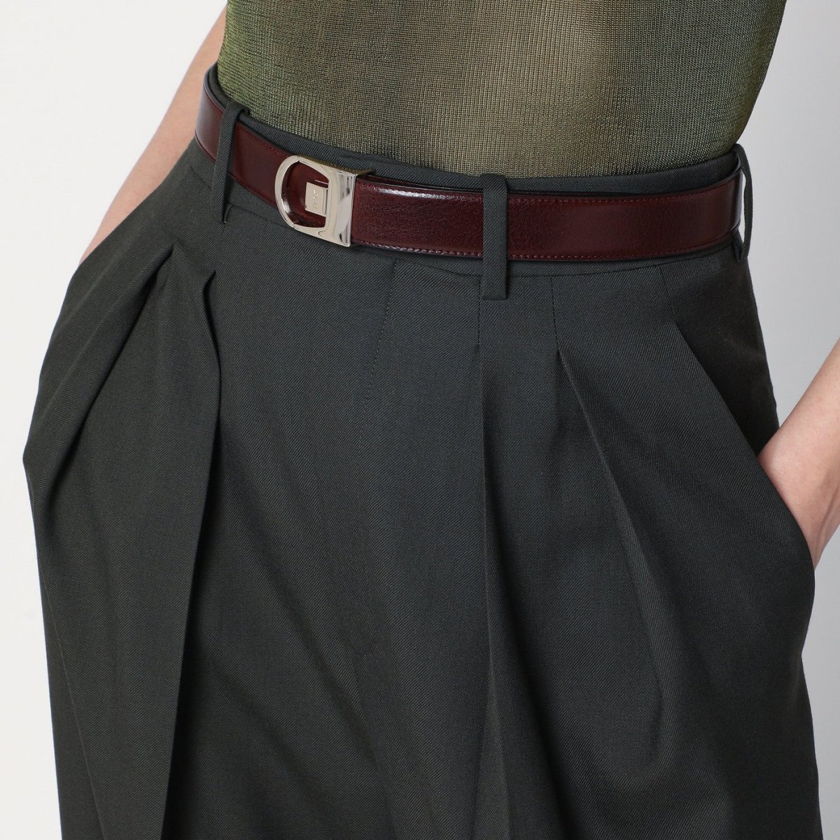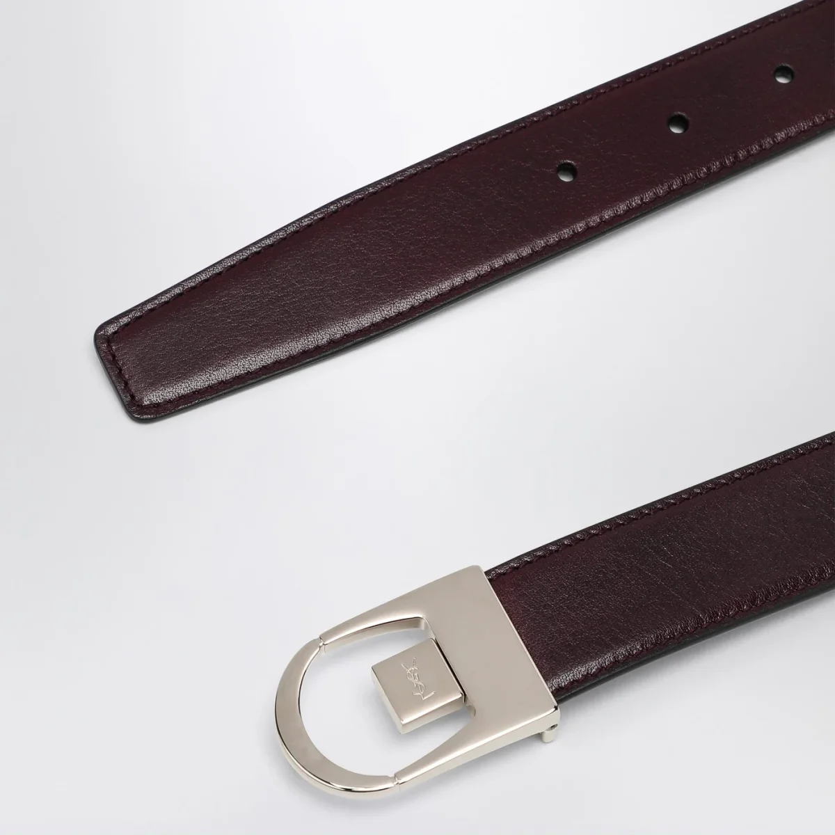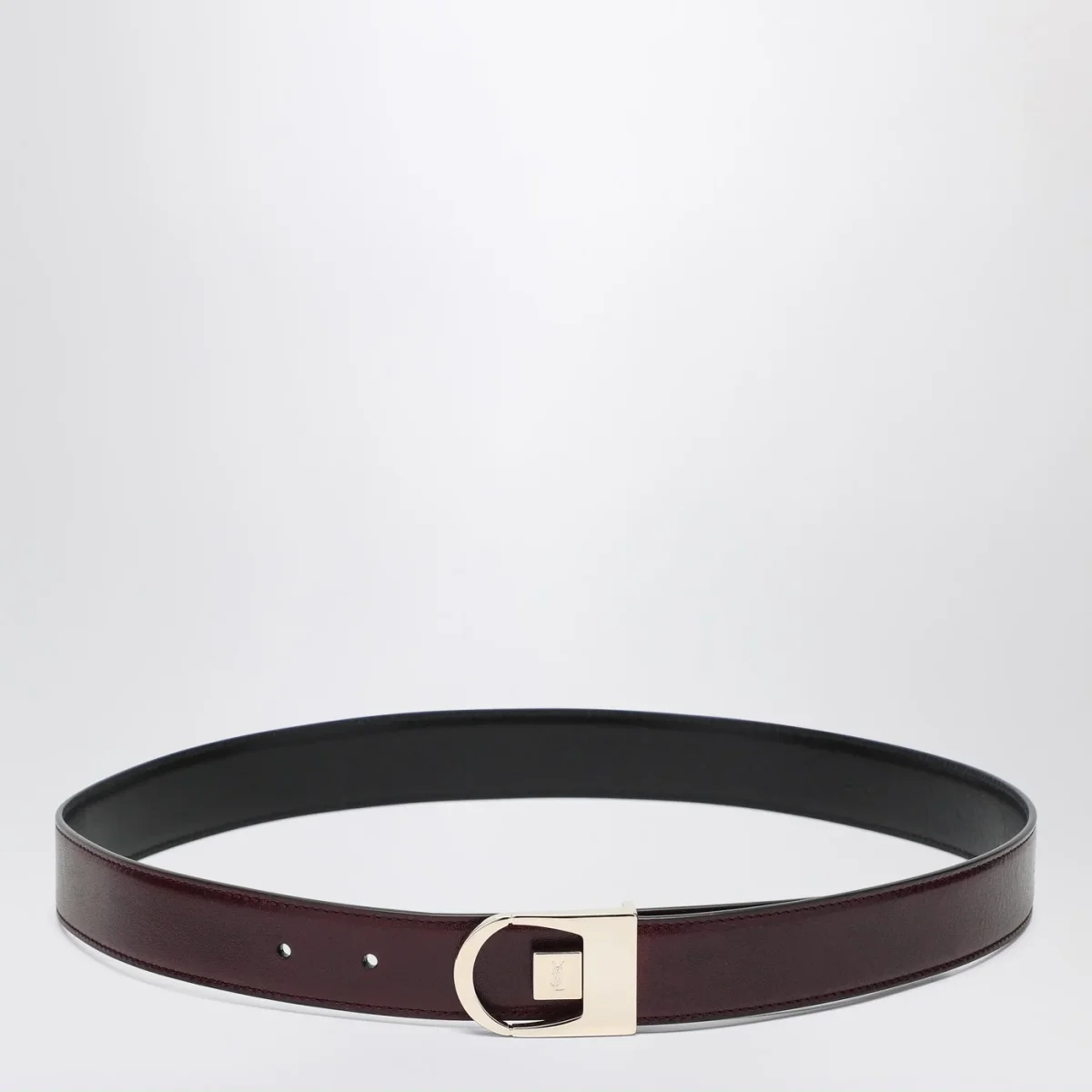 Cintura reversibile di Saint Laurent in pelle liscia nera da un lato e bordeaux dall’altro, caratterizzata da fibbia con incisione logo Cassandre.