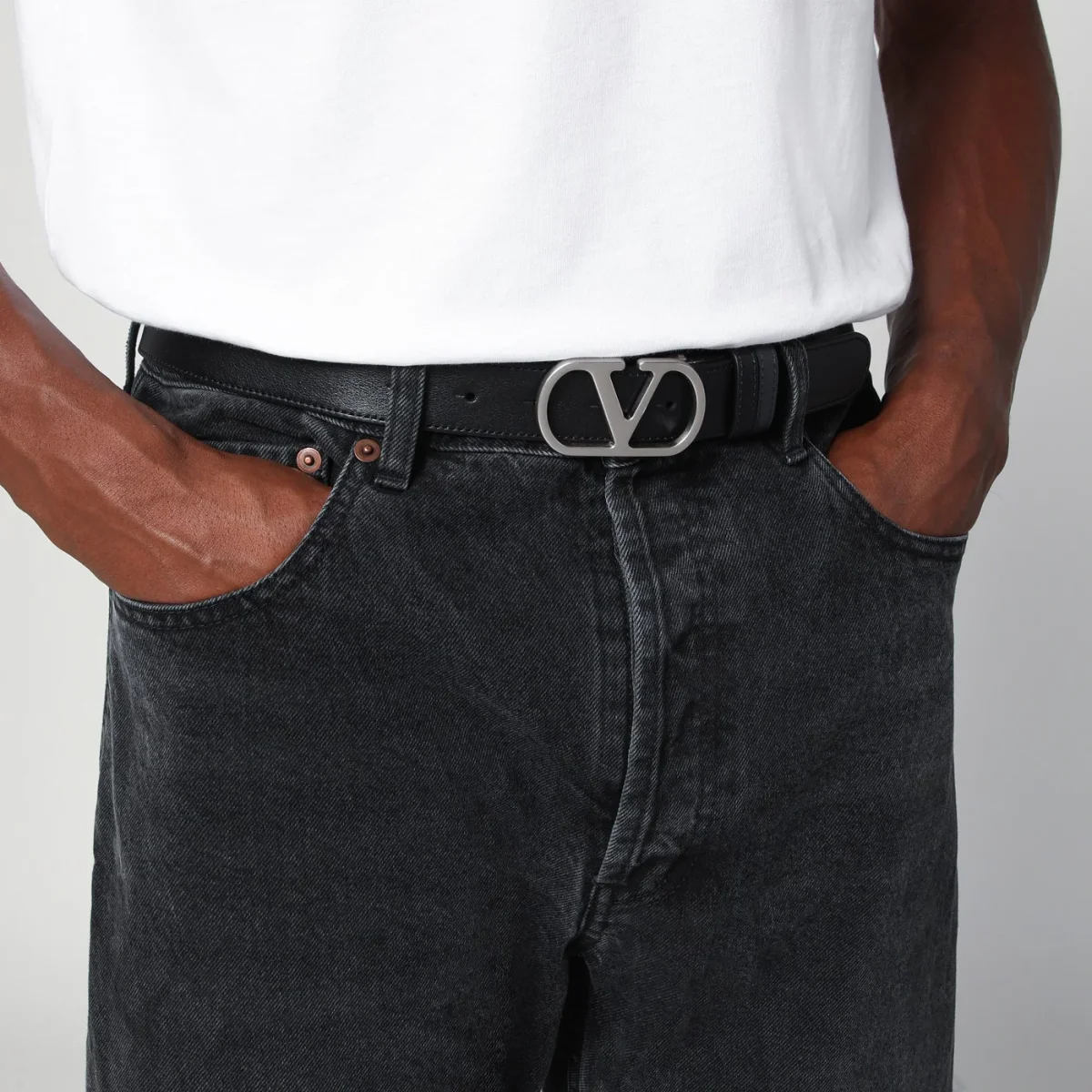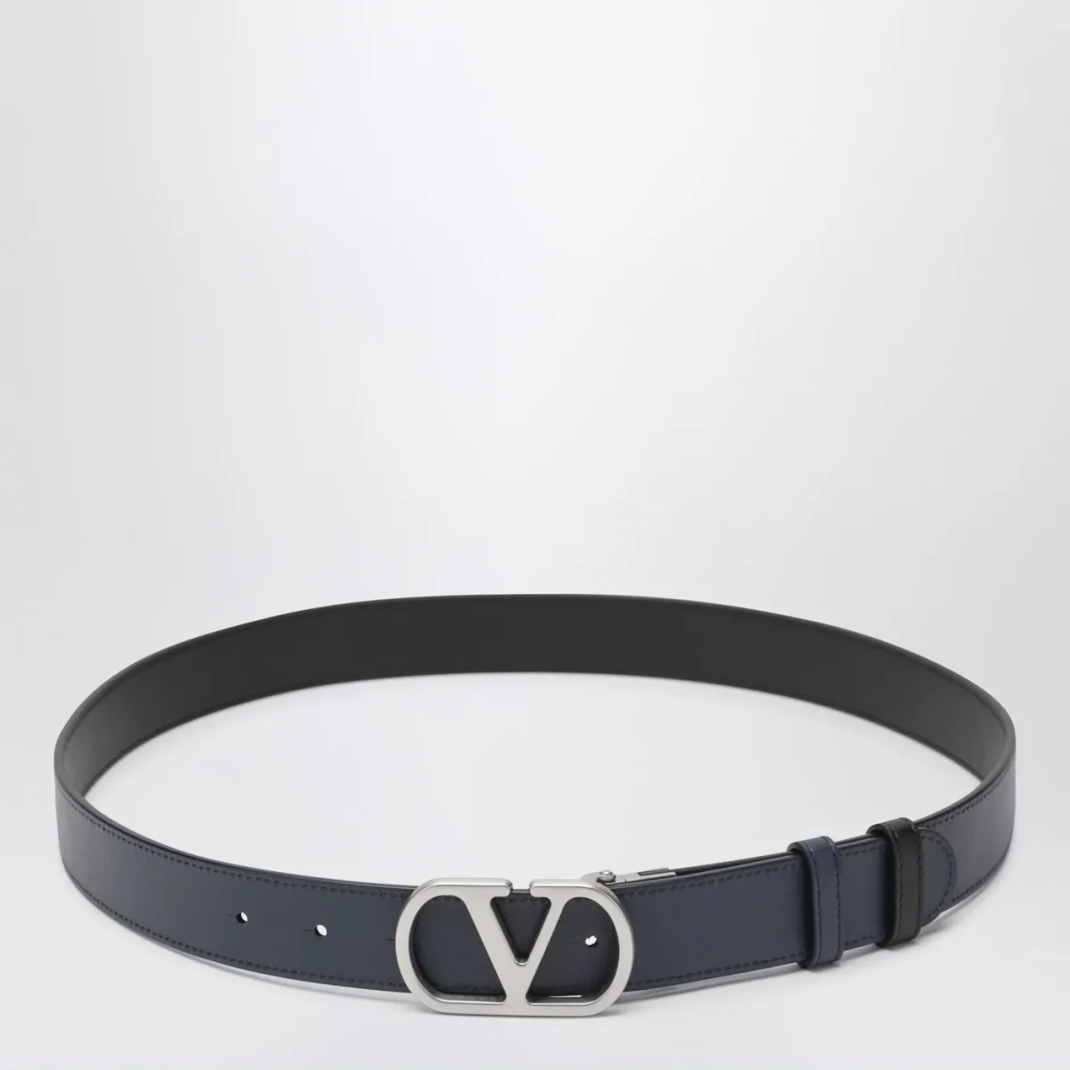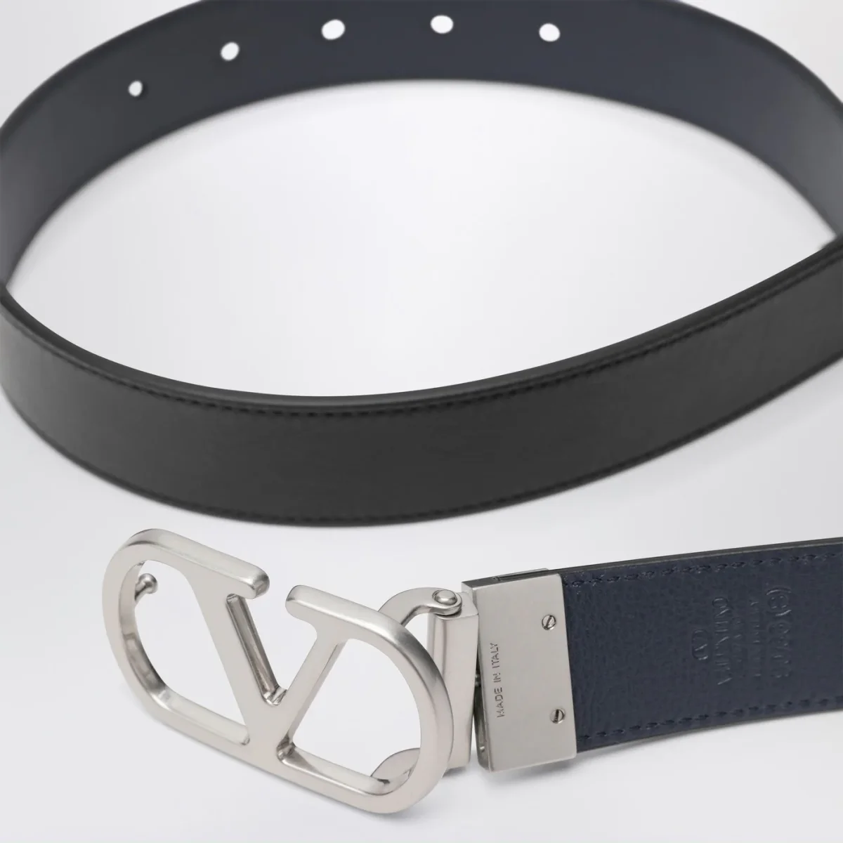 Cintura di Valentino Garavani in pelle nera e blu marine, caratterizzata da fibbia VLogo Signature in metallo con finitura argento, design reversibile, doppio passante e misura regolabile.