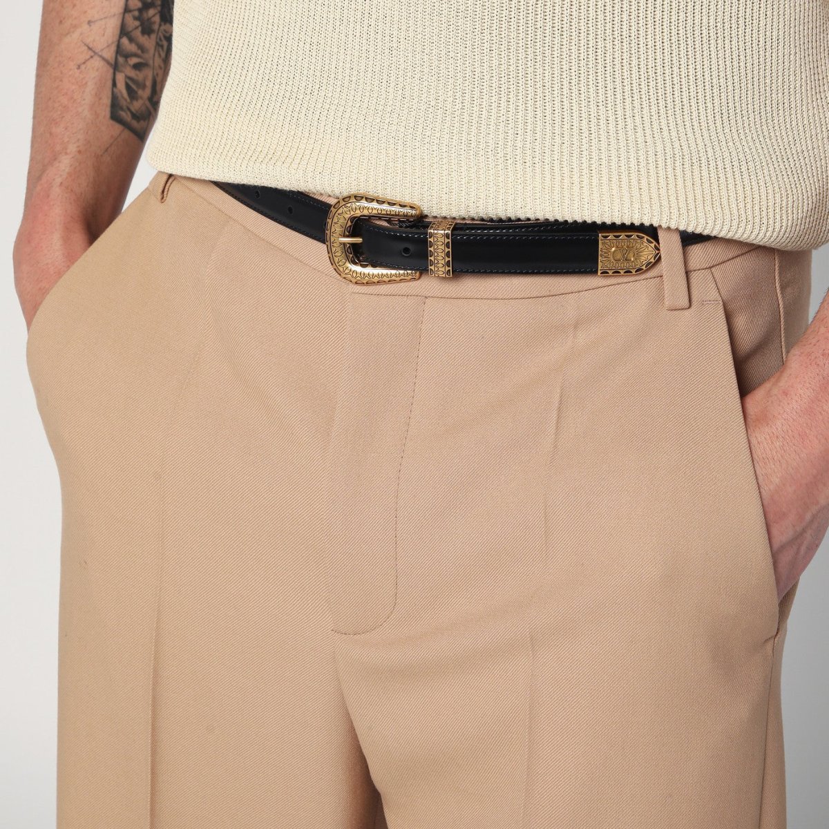 Cintura di Valentino Garavani in vitello spazzolato nera, caratterizzata da fibbia arrotondata, passante e punta in metallo con dettaglio Vlogo Signature e hardware in ottone anticato.