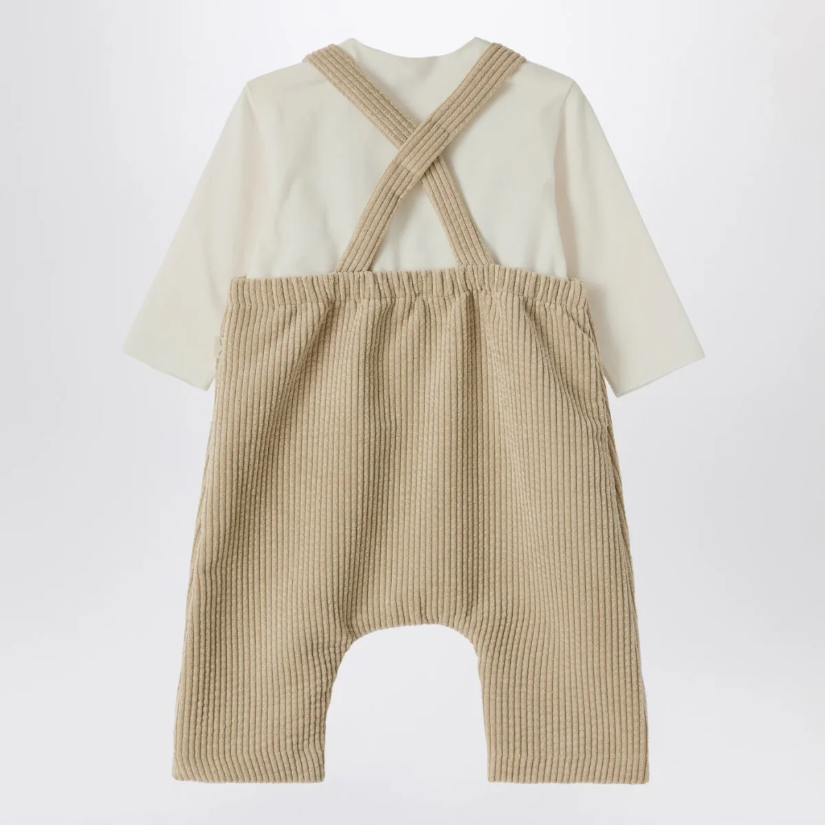 Completo due pezzi da neonato di Teddy & Minou composto da una T-shirt a manica lunga in jersey di cotone organico con bottoni automatici sulla spalla e da una salopette beige in velluto a coste con bottoni in legno, vita elasticizzata sul retro e una tasca a marsupio sul davanti con patch logo.