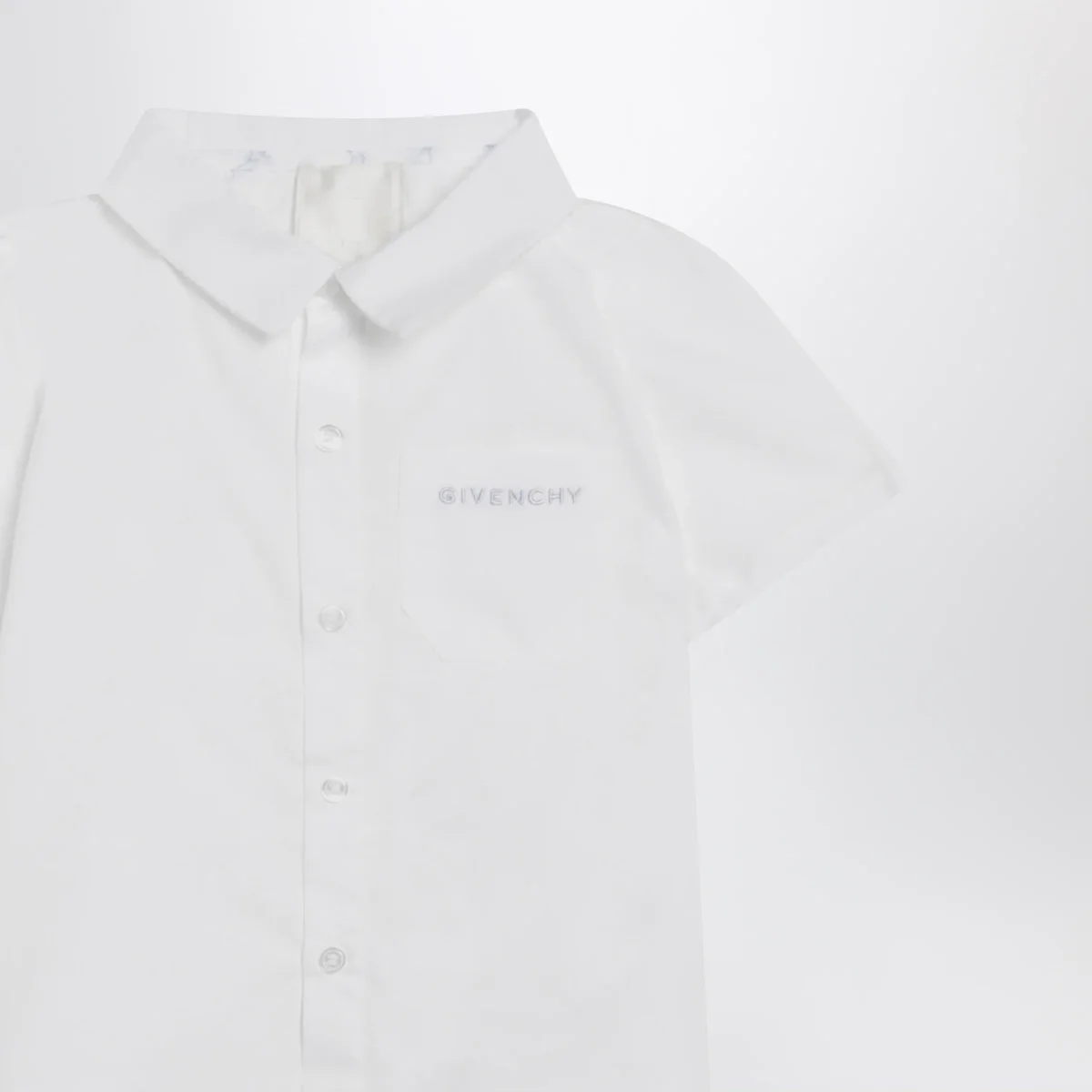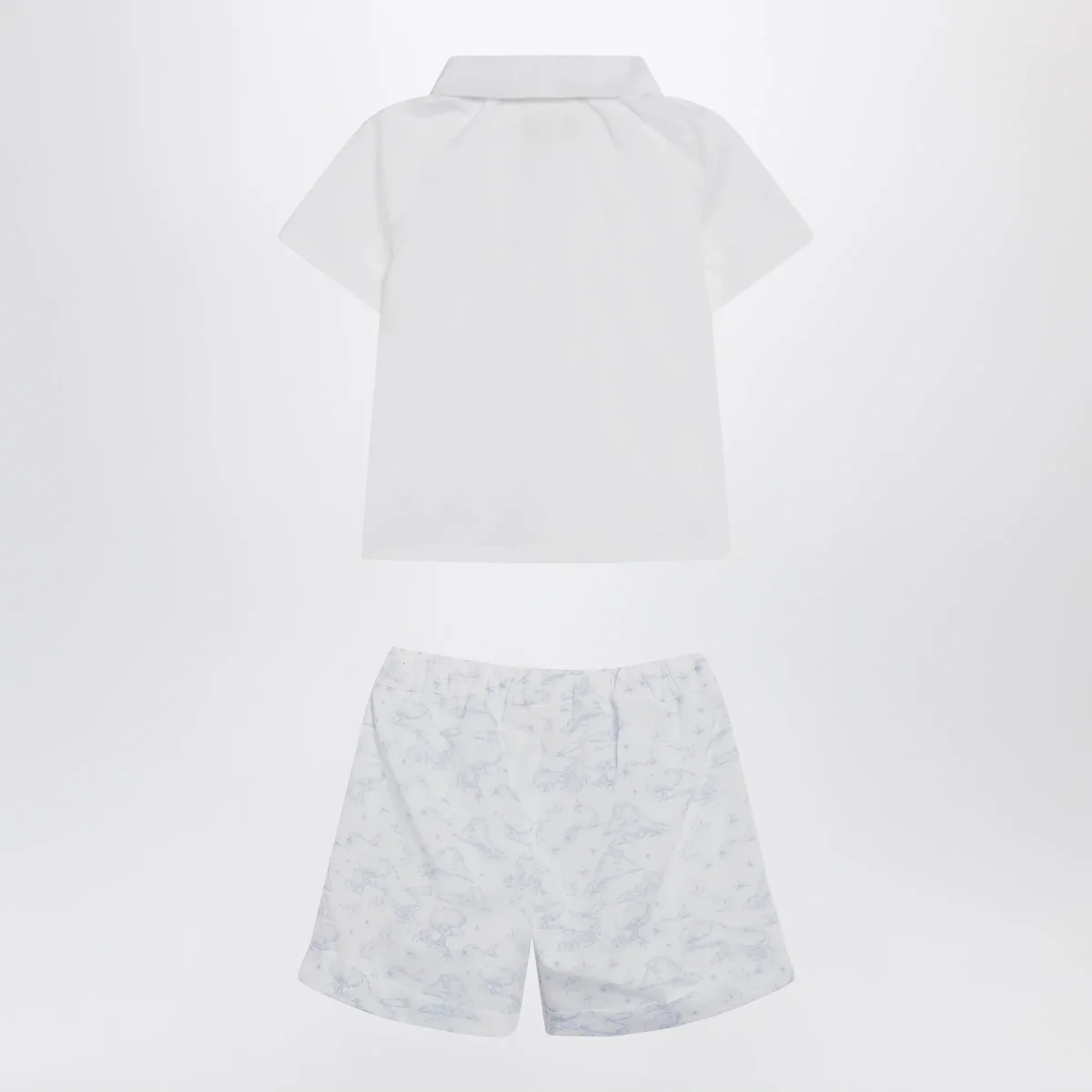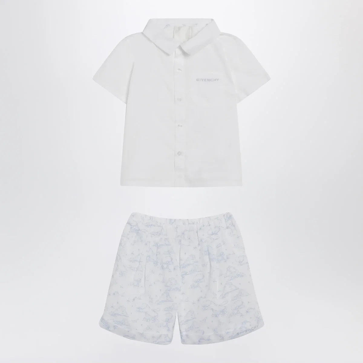 Completo due pezzi di Givenchy in cotone• Colore: Bianco/Azzurro• Camicia con abbottonatura frontale e maniche corte• Short con vita elasticizzata e ricamo logo lettering