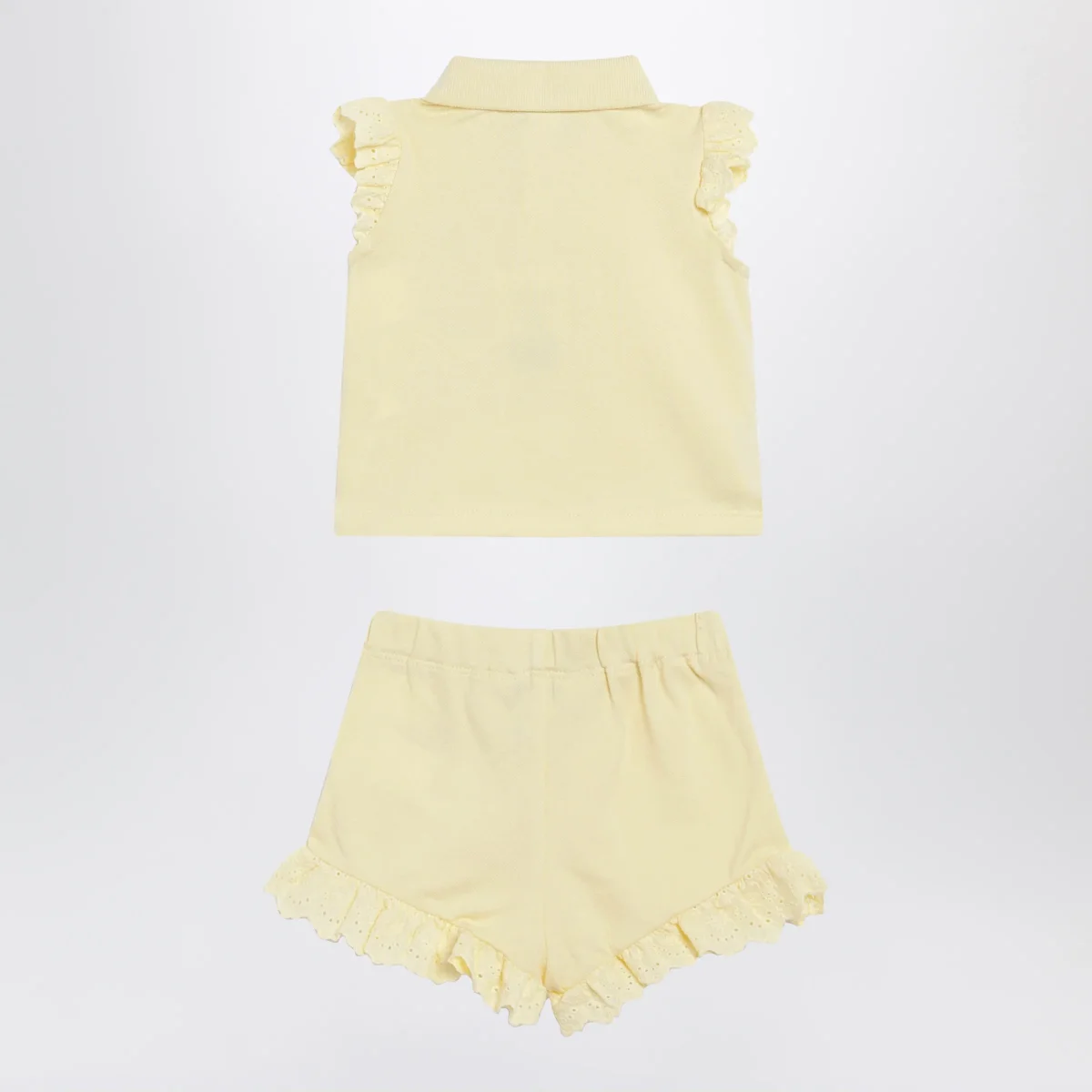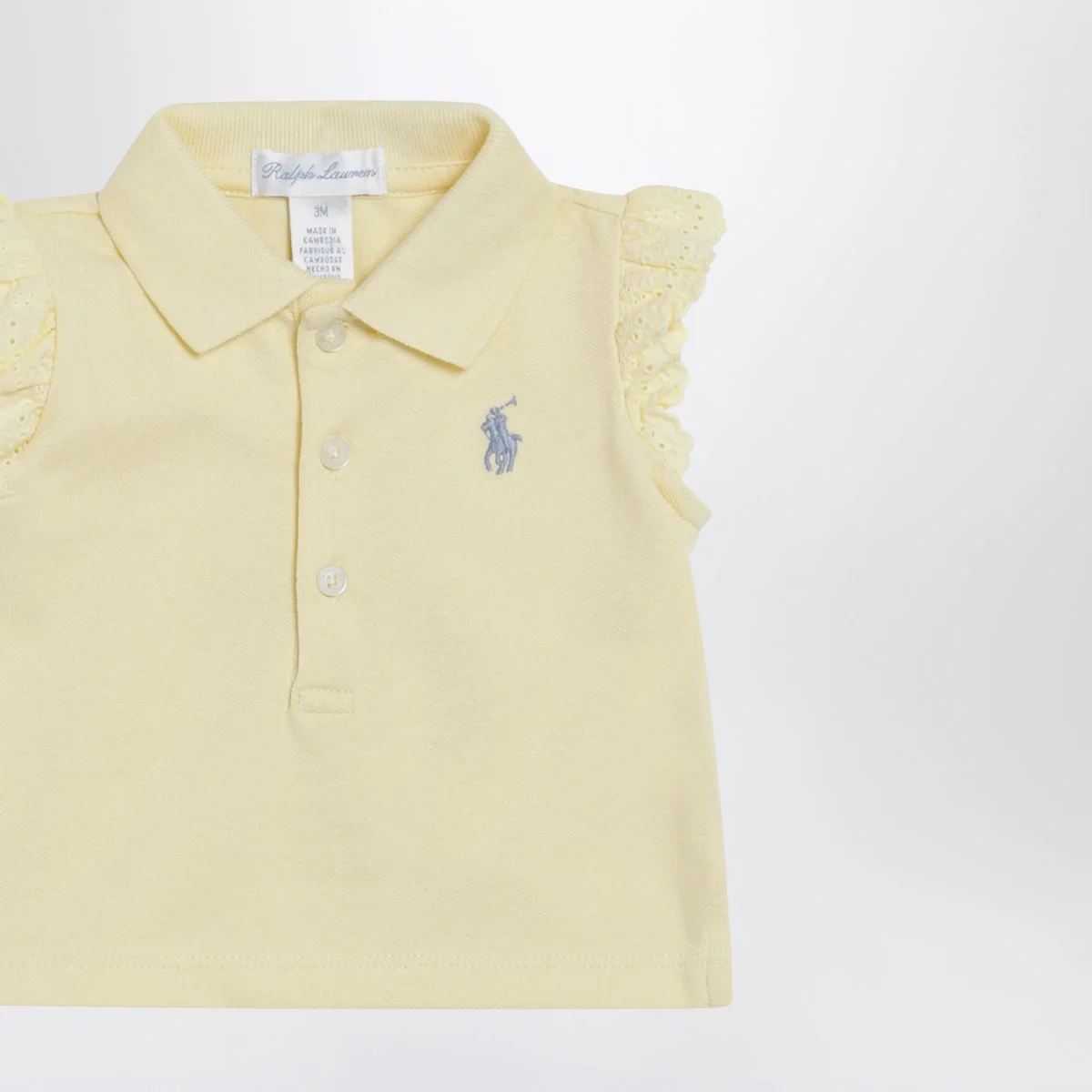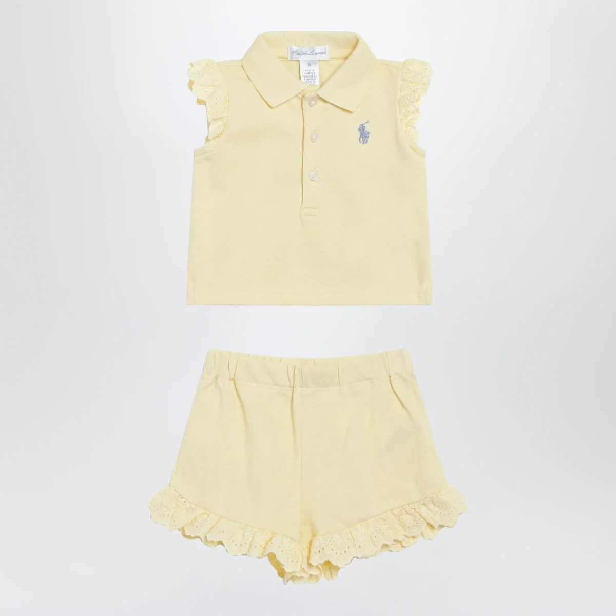 Completo due pezzi di Polo Ralph Lauren in cotone• Colore: Giallo chiaro• Polo smanicata con ricamo logo sul petto e giromanica con pizzo• Shorts con vita elasticizzata e orlo con pizzo