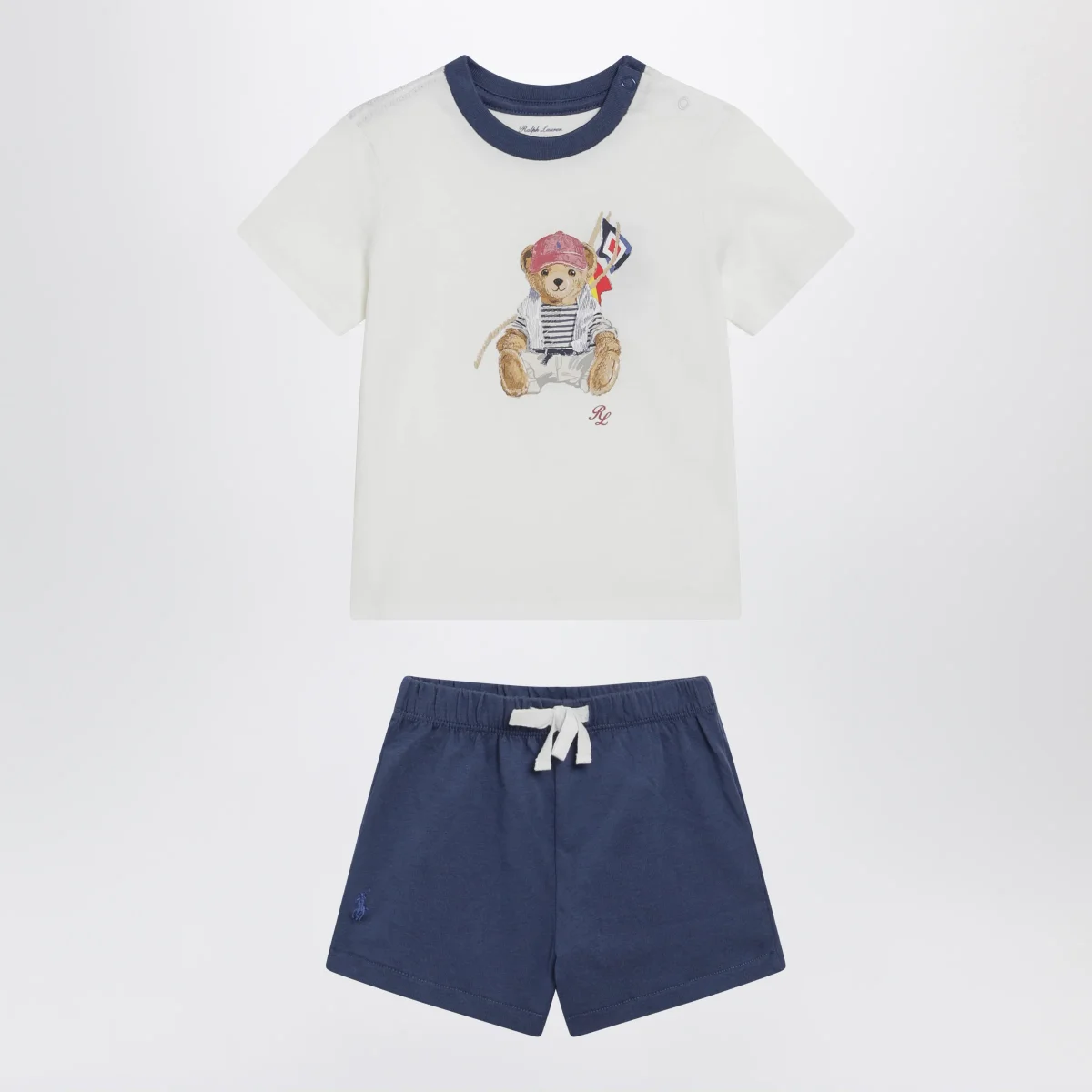 Completo due pezzi di Polo Ralph Lauren in cotone• Colore: Bianco/Blu• T-shirt girocollo con Polo Bear sul davanti e maniche corte• Shorts con vita elasticizzata con coulisse e ricamo logo sul davanti tono su tono